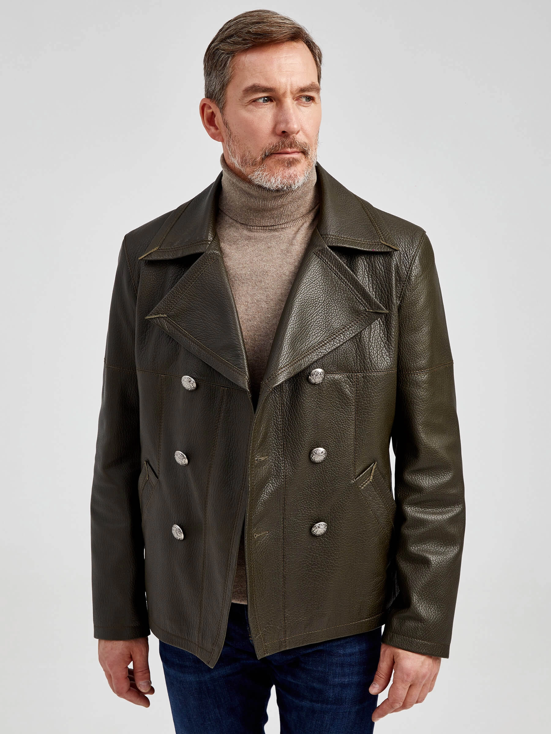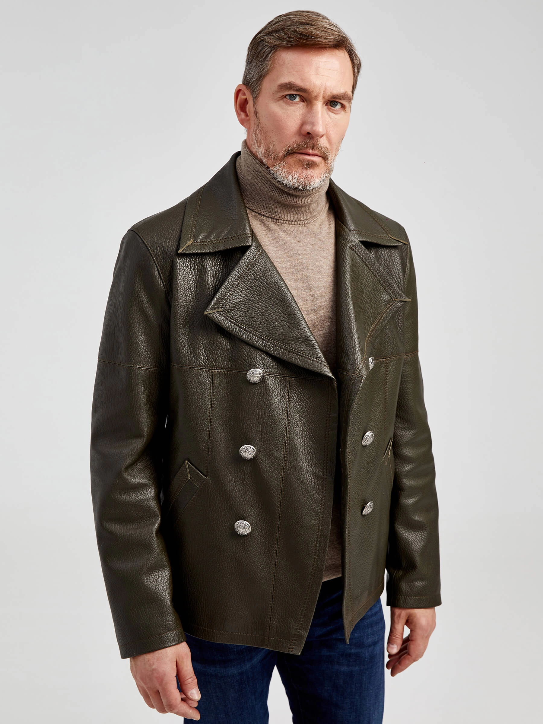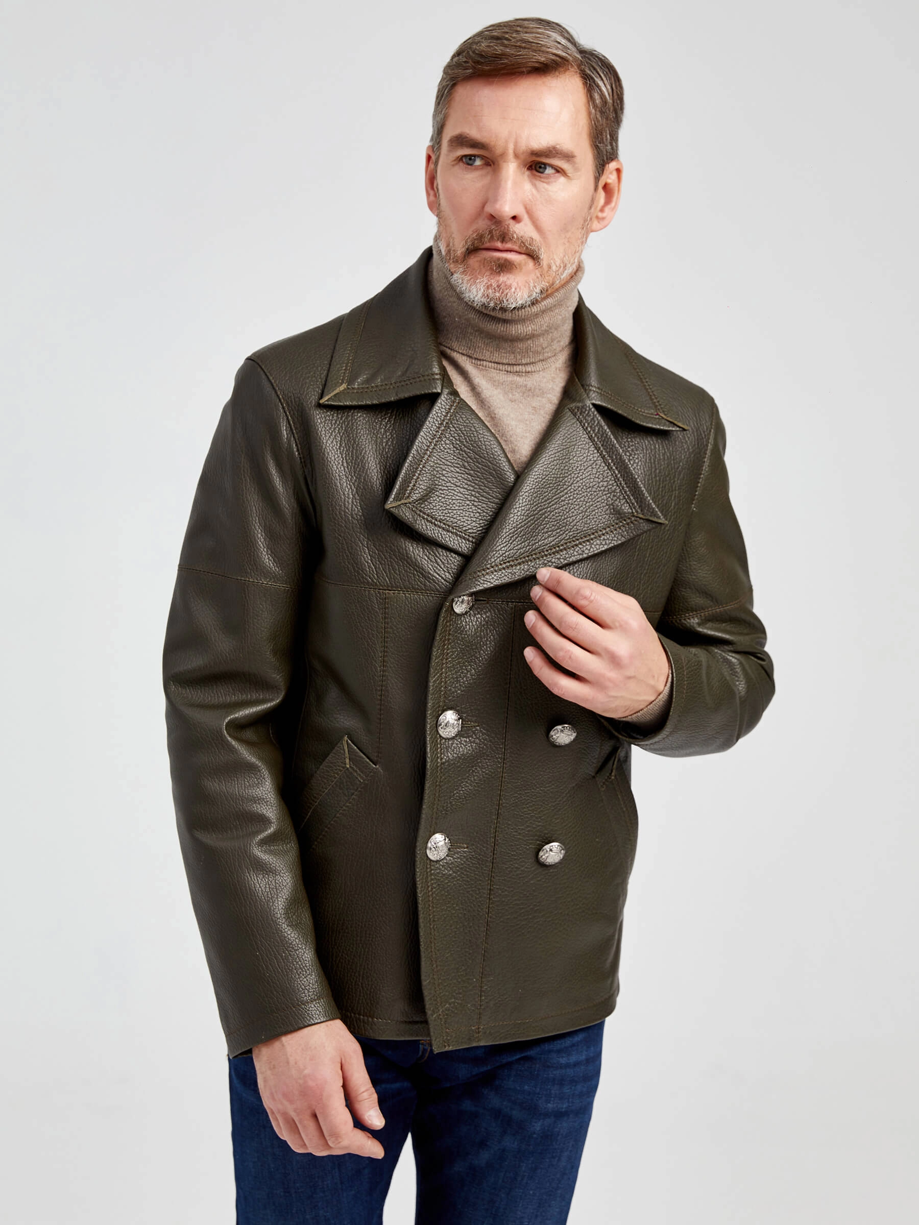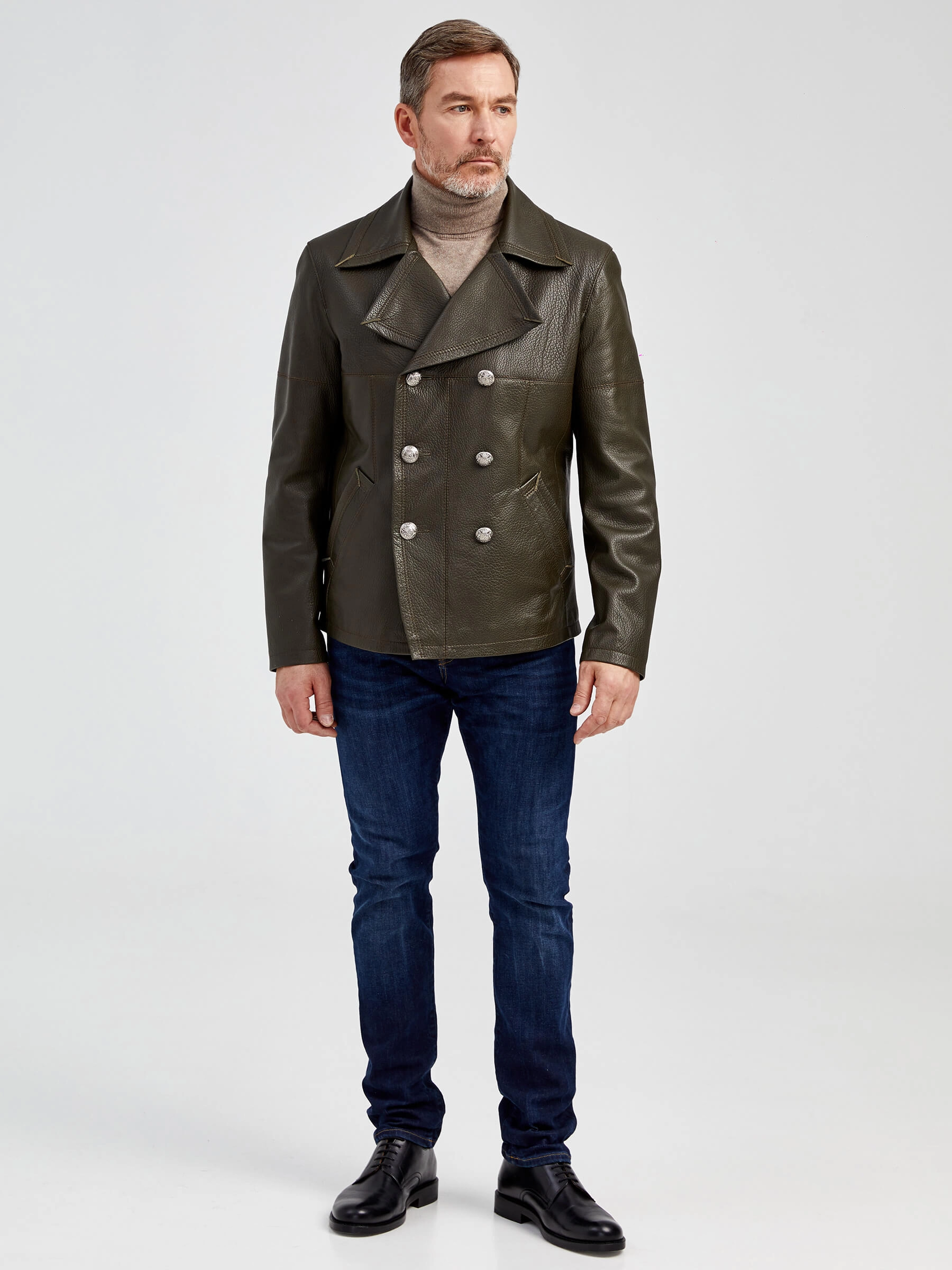 Двубортная мужская кожаная куртка Клуб, оливковая, размер 48, артикул 28972