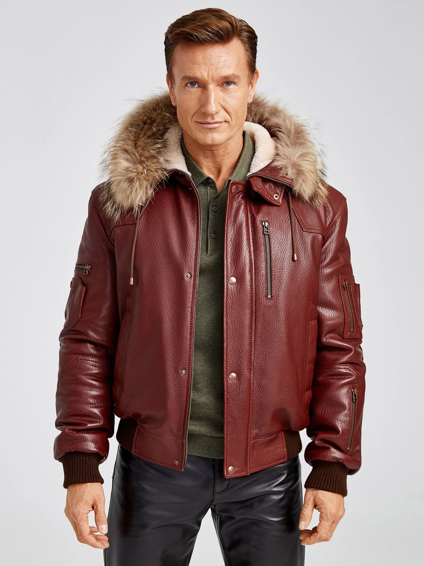 Укороченный вариант куртки «Аляска» в современной интерпретации. Кожа высшего качества. Современный утеплитель. Удобный капюшон. Тонкорунная овчина внутри капюшона. Опушь капюшона из меха енота. Множество наружных и внутренних карманов. Свободный крой обеспечивает комфортную посадку по фигуре. Куртка очень удобна за рулём.