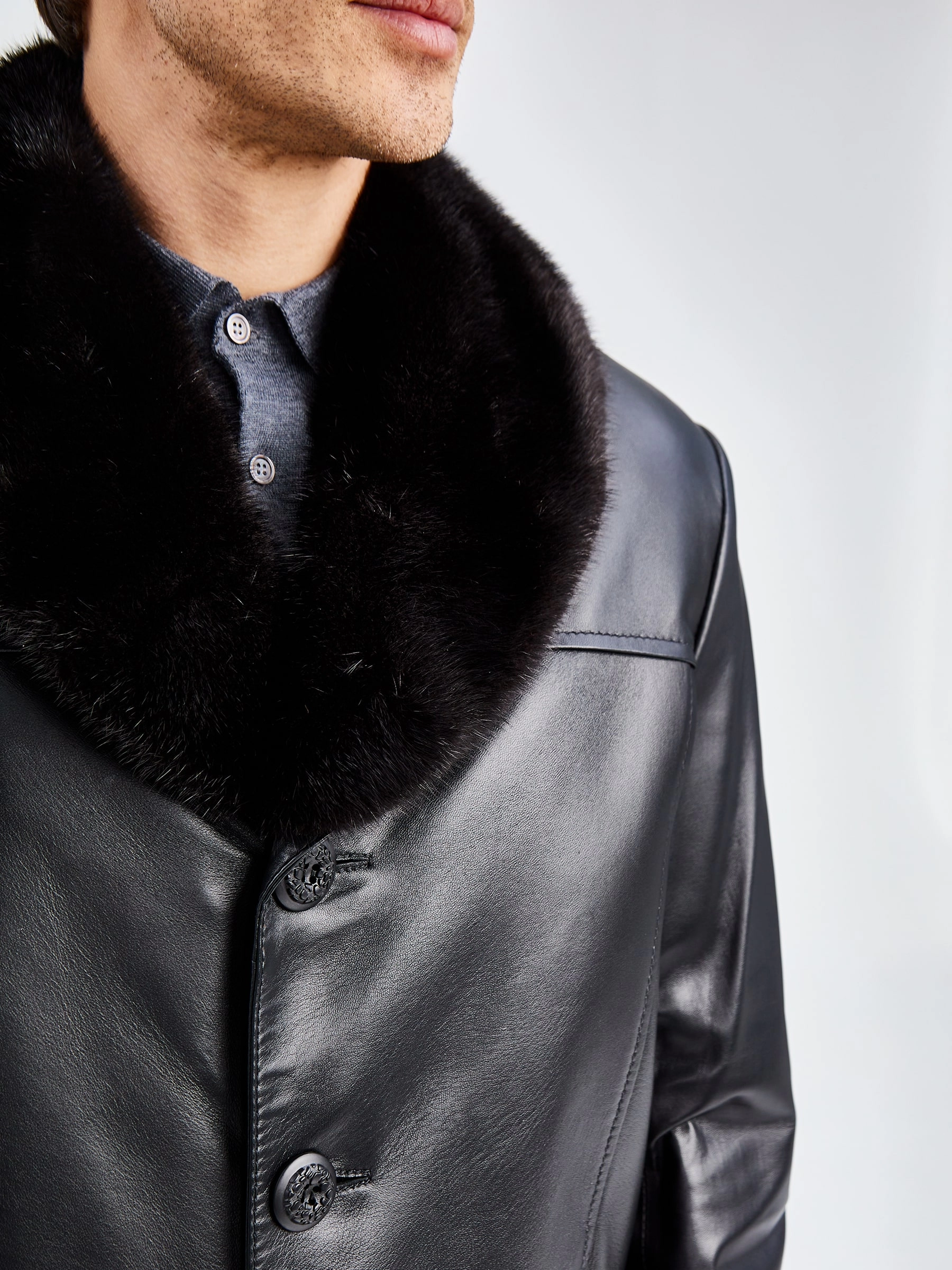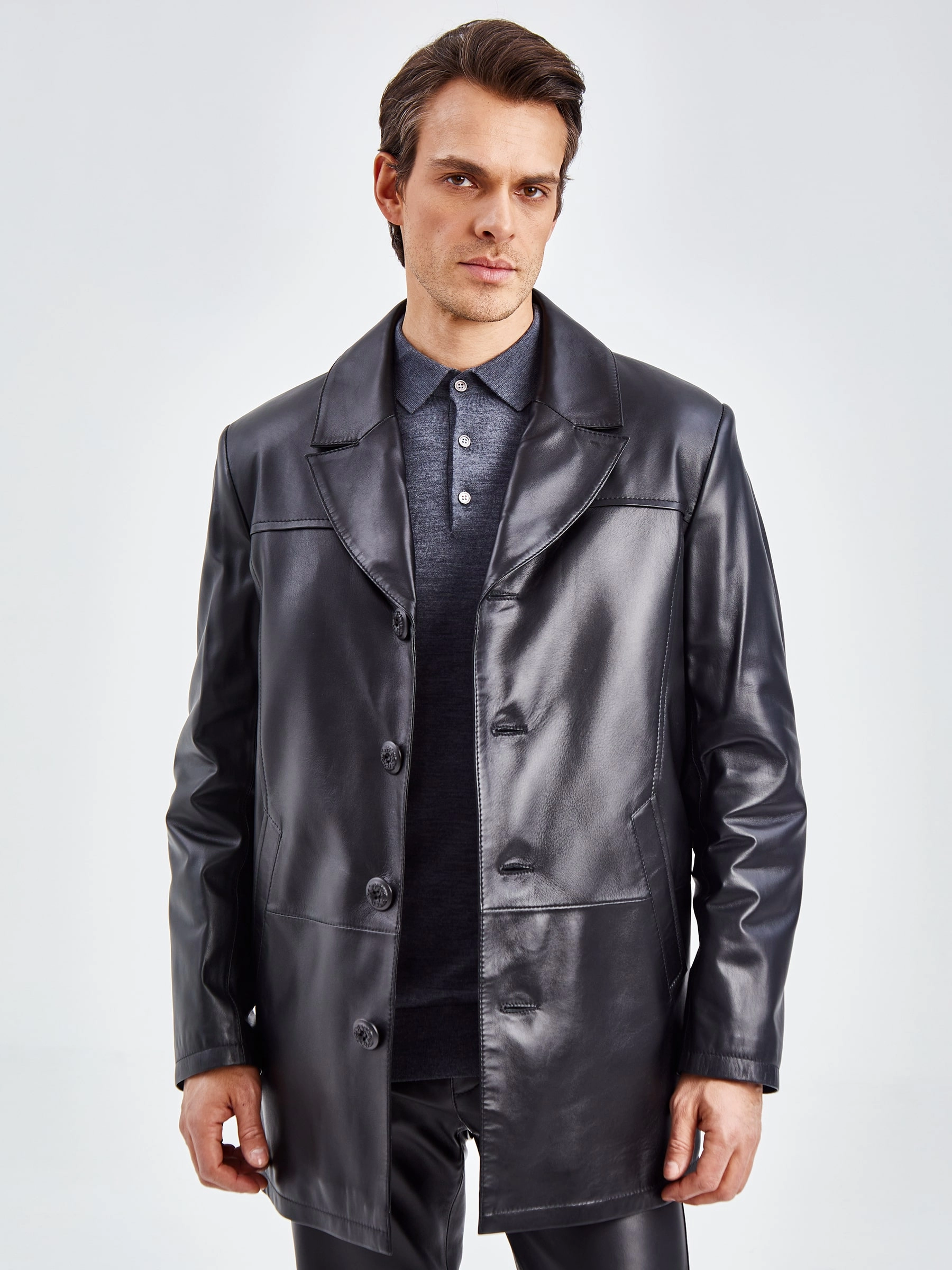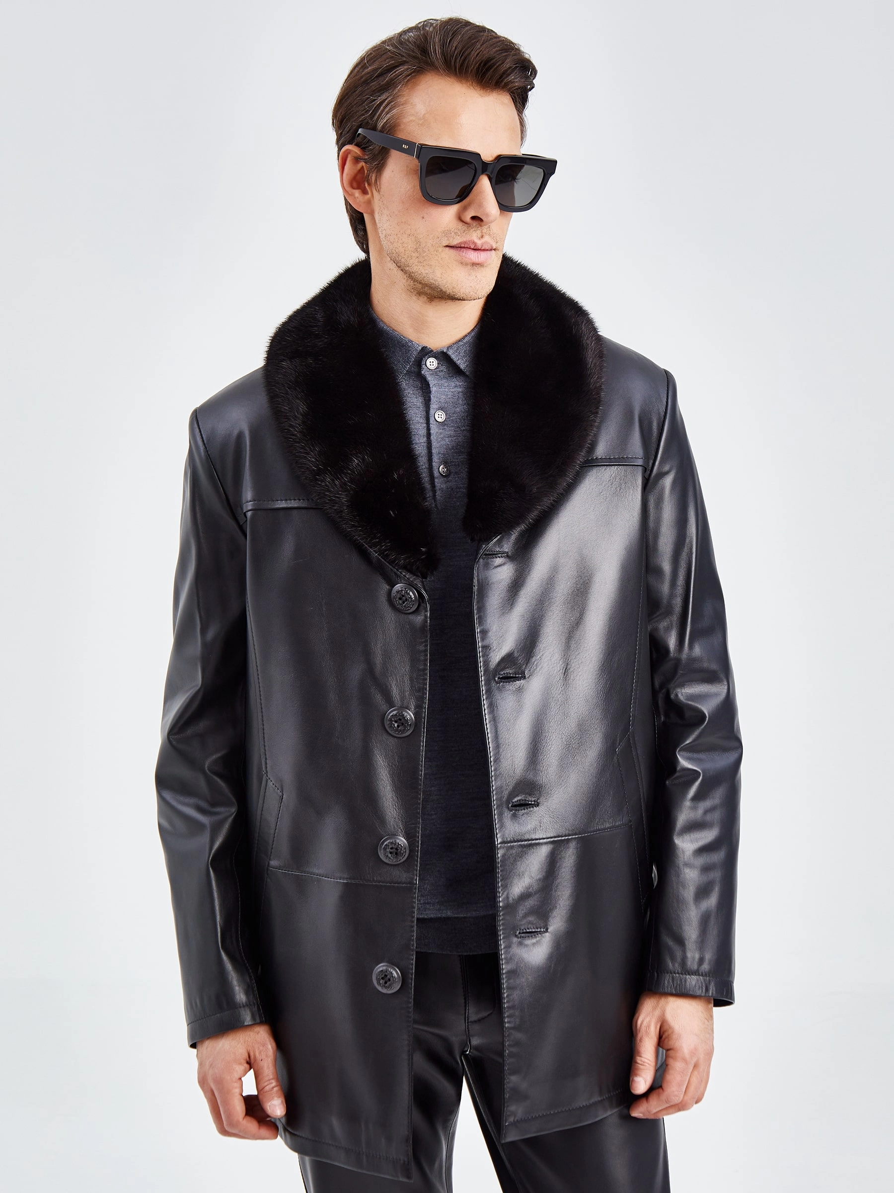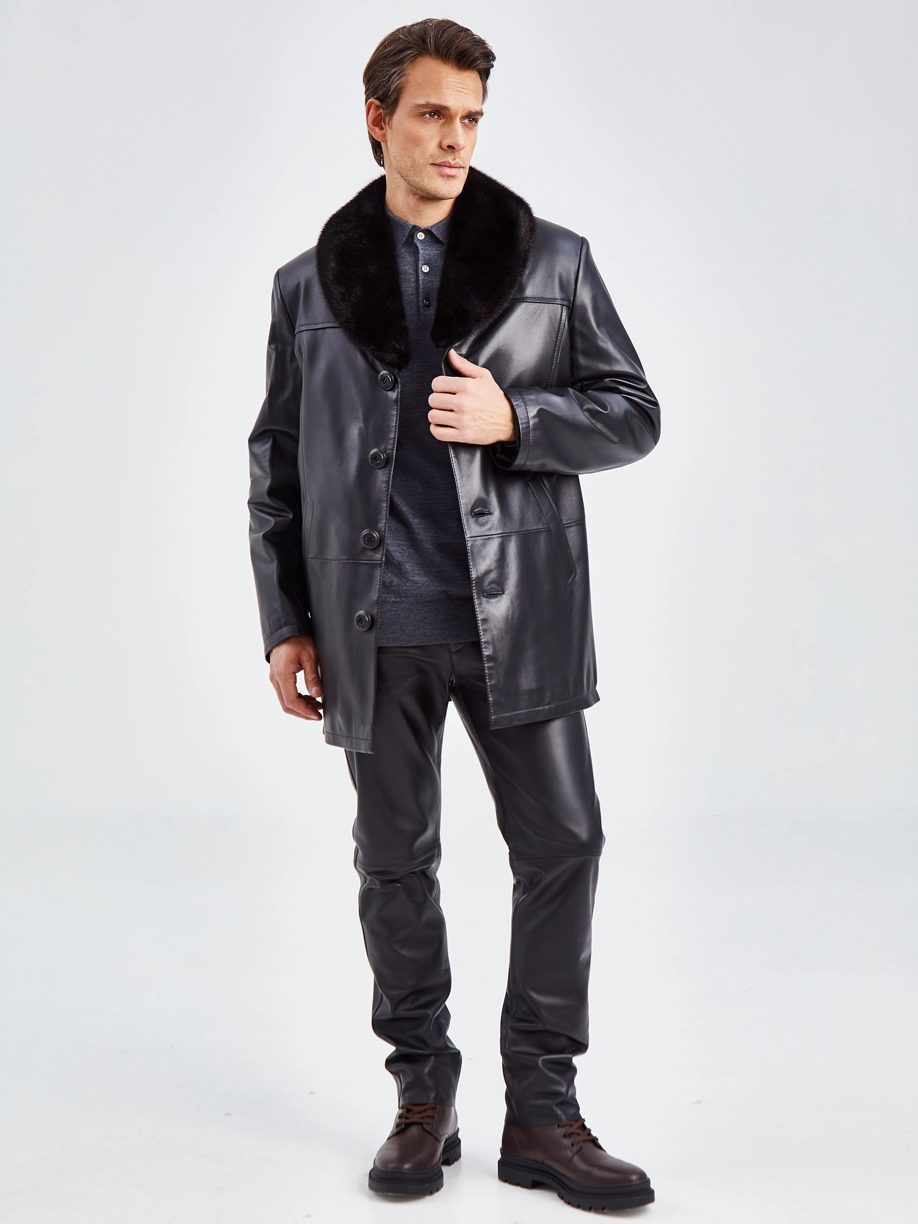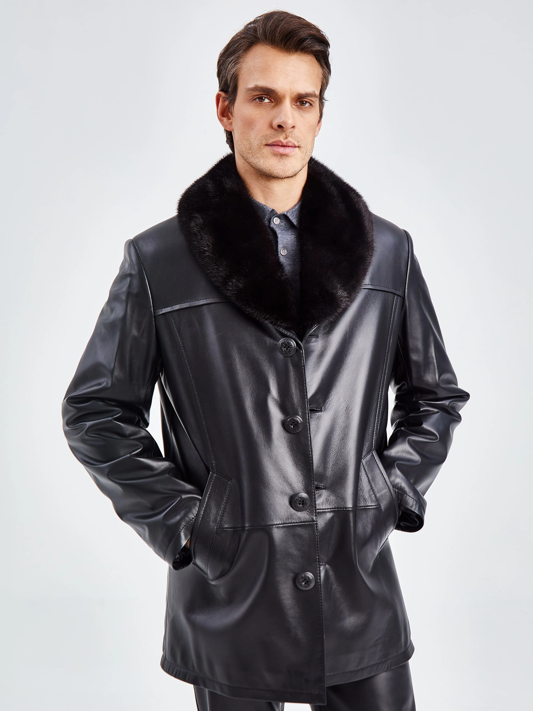 Классический дизайн. Кожа высшего качества. Великолепное исполнение. Модель гораздо сложнее, чем кажется на первый взгляд. Съёмный воротник из меха норки. Съёмная подстёжка из тонкорунной овчины. Редкая универсальность для одежды бизнес-класса. Всегда ко времени, независимо от сезона. Прекрасно сочетается как с деловым костюмом, так и с неофициальной одеждой, например, с джинсами.