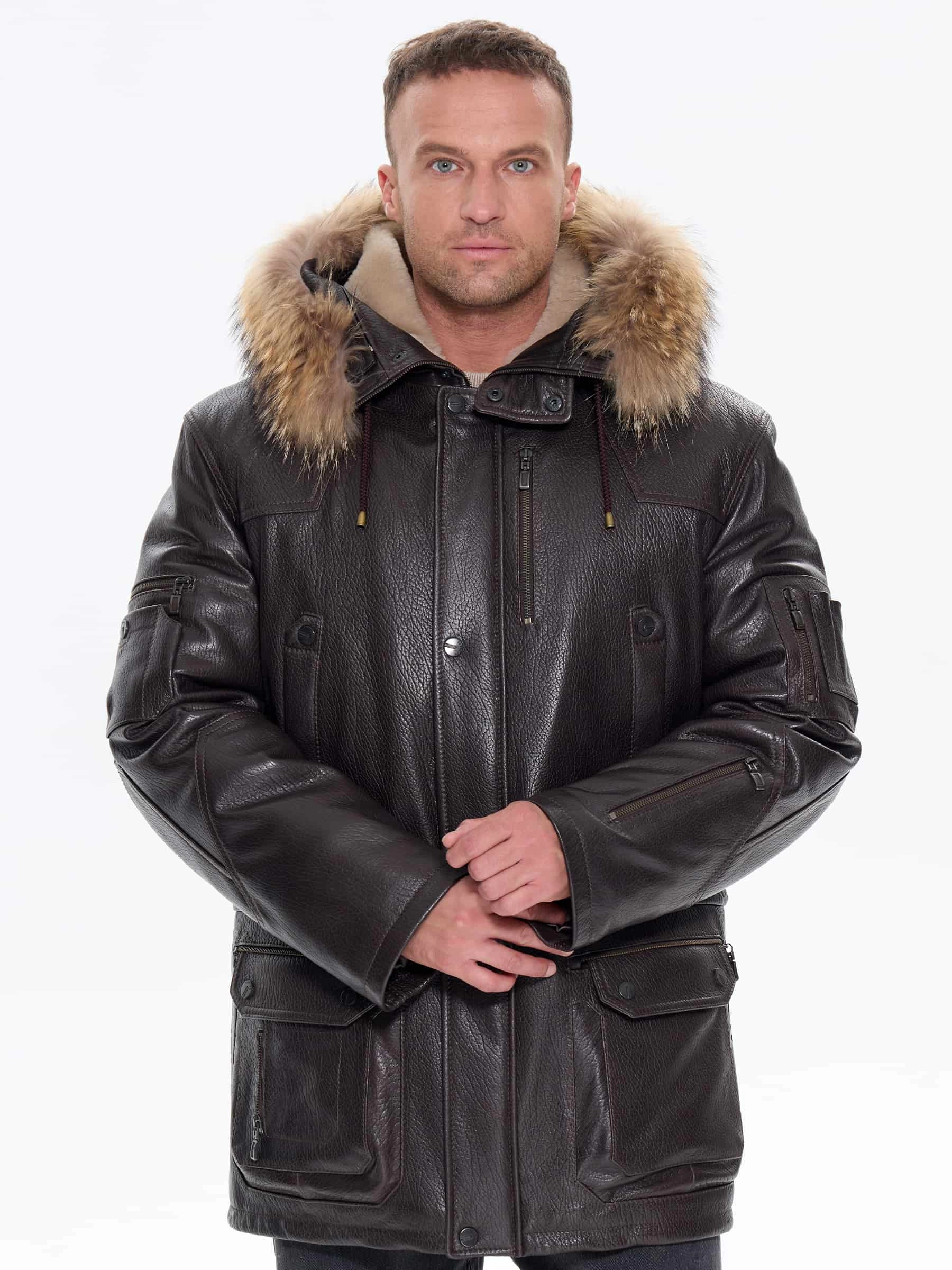 Утепленная мужская кожаная куртка аляска с мехом енота Алекс, коричневая, размер 52, артикул 40300