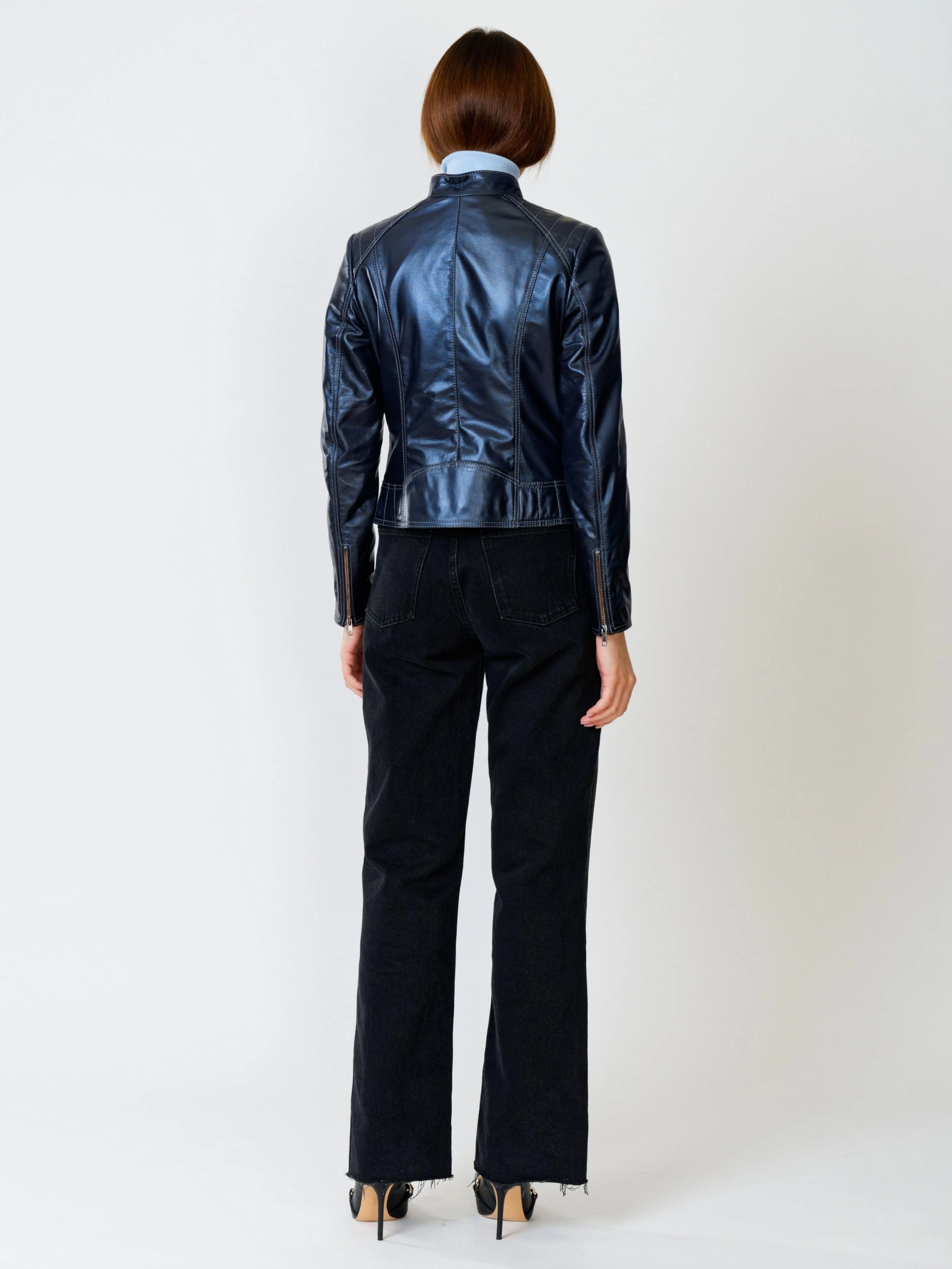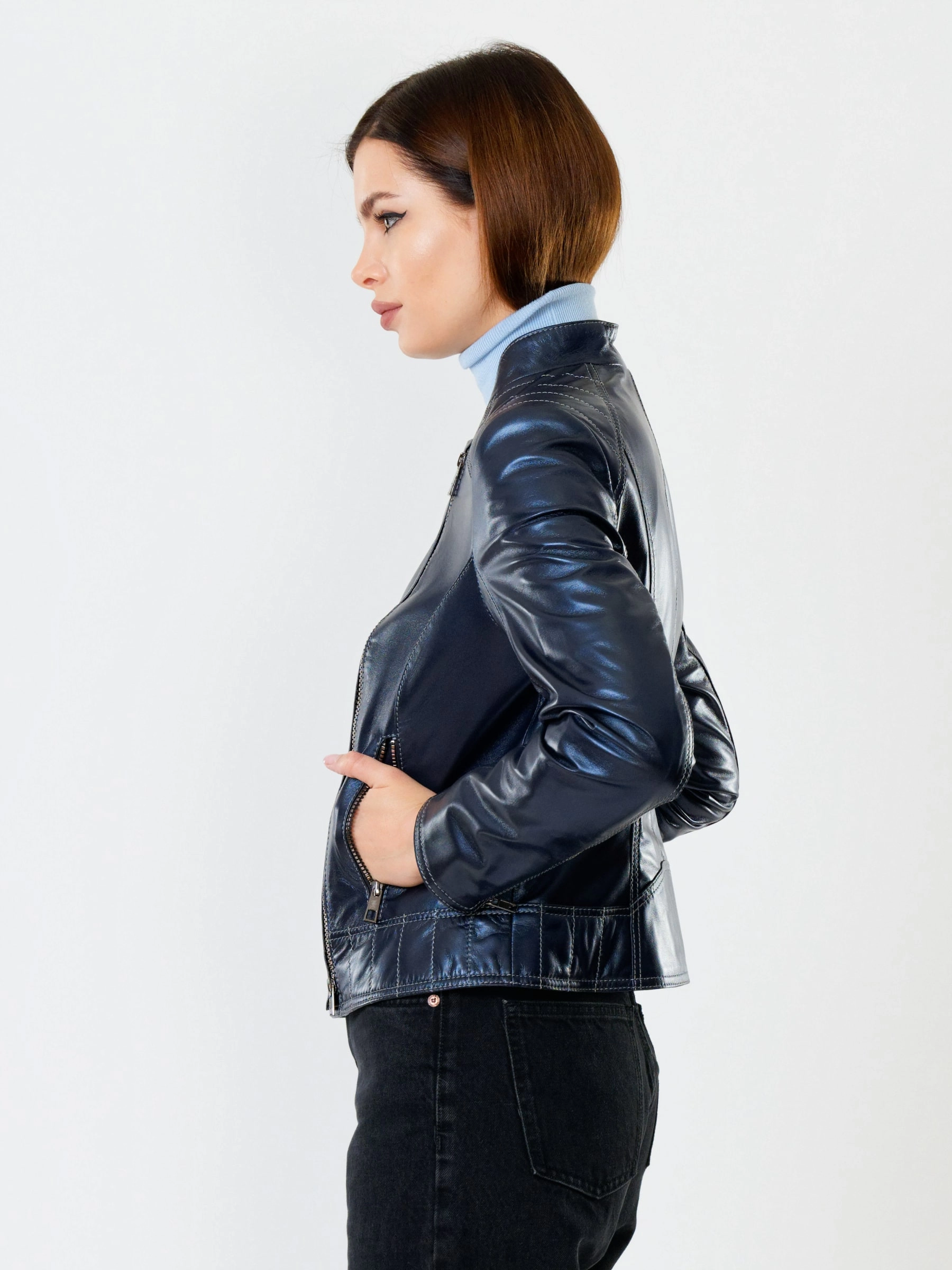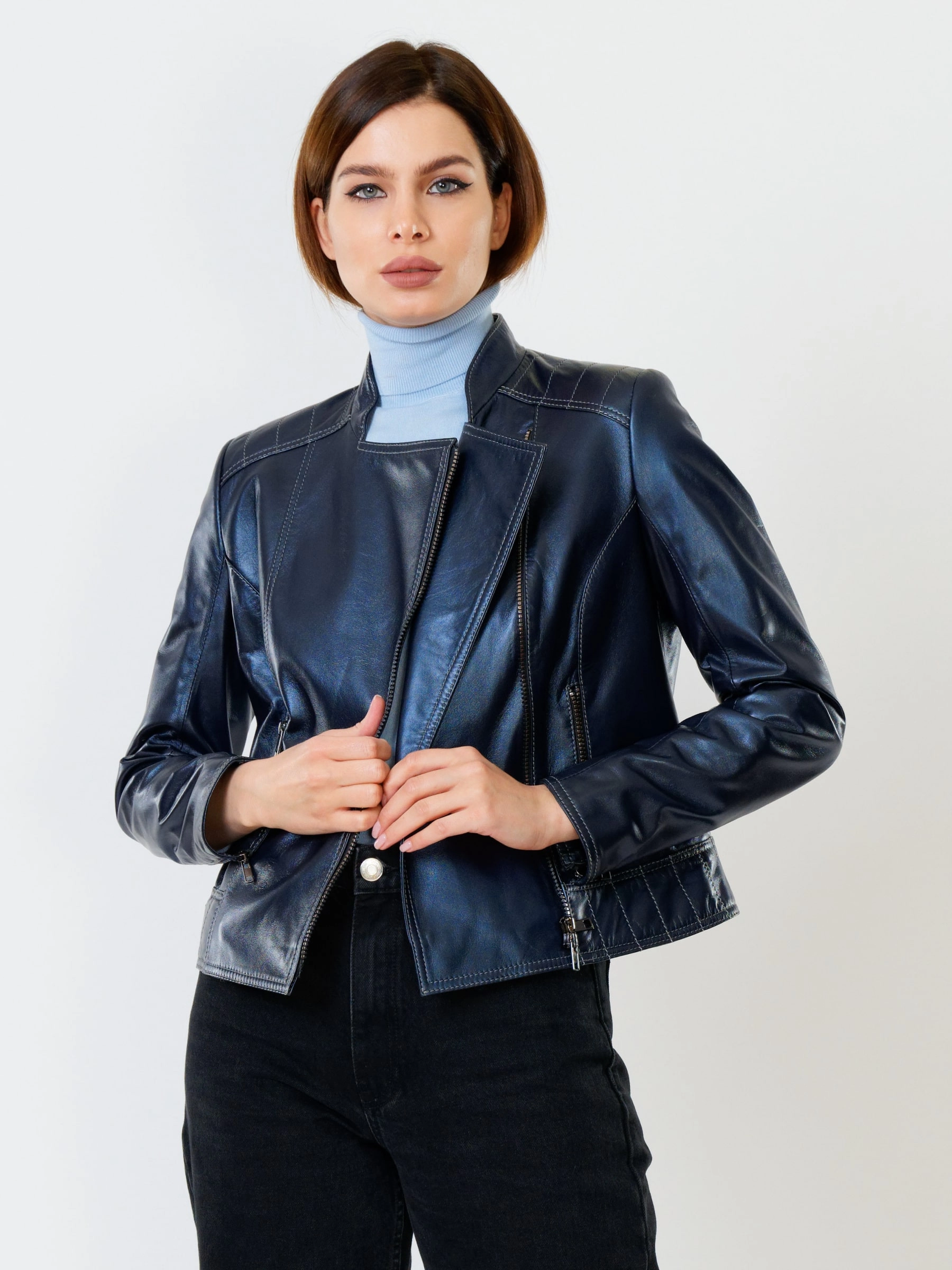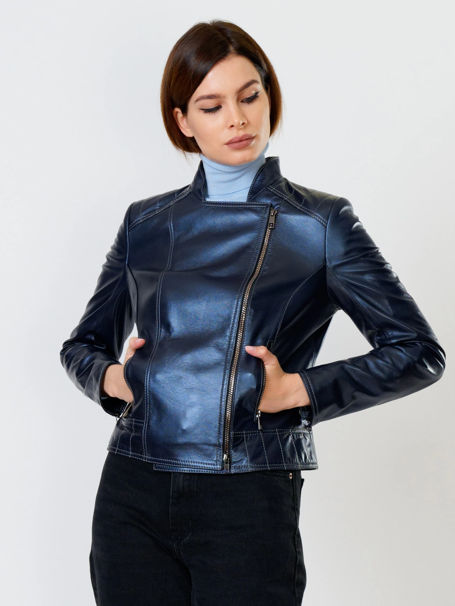 Кожаная куртка косуха женская 300, синий перламутр, размер 46, артикул 90992