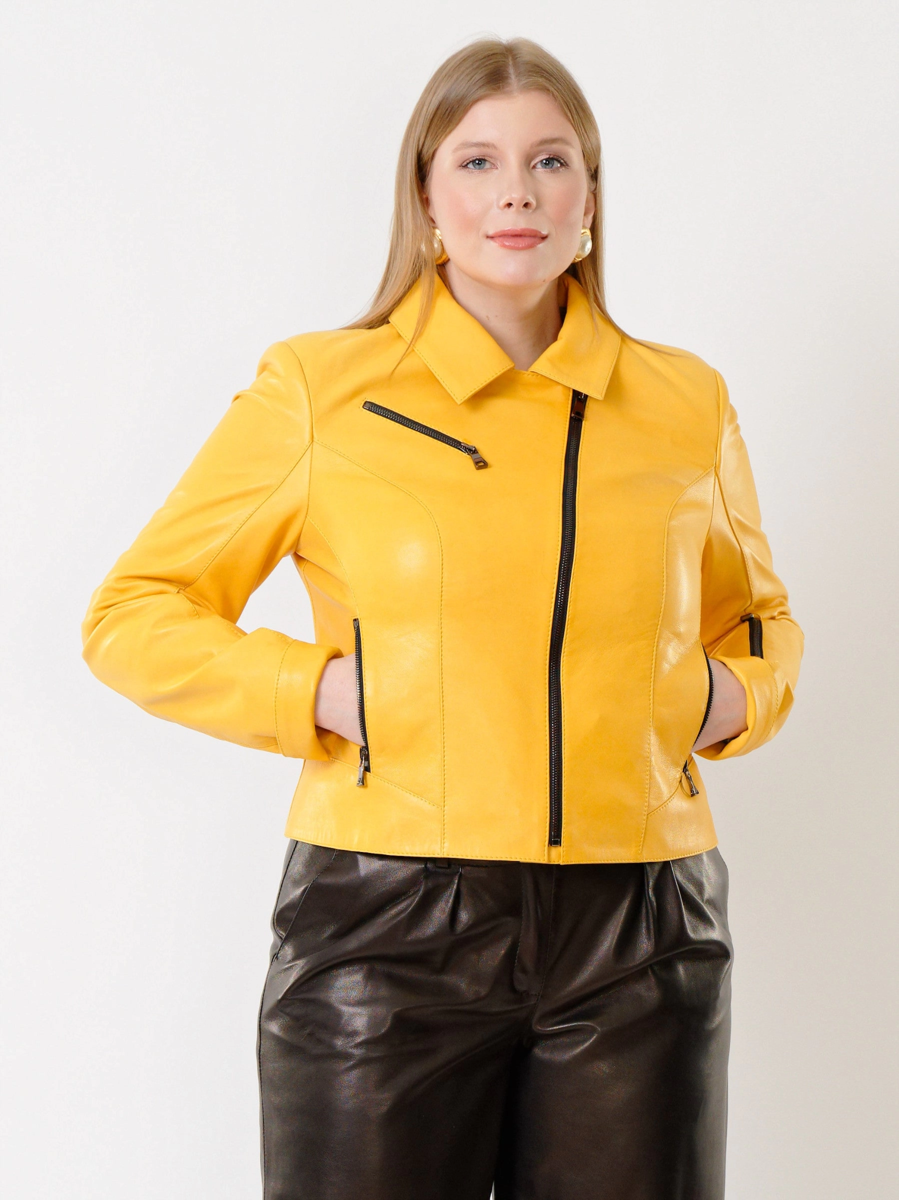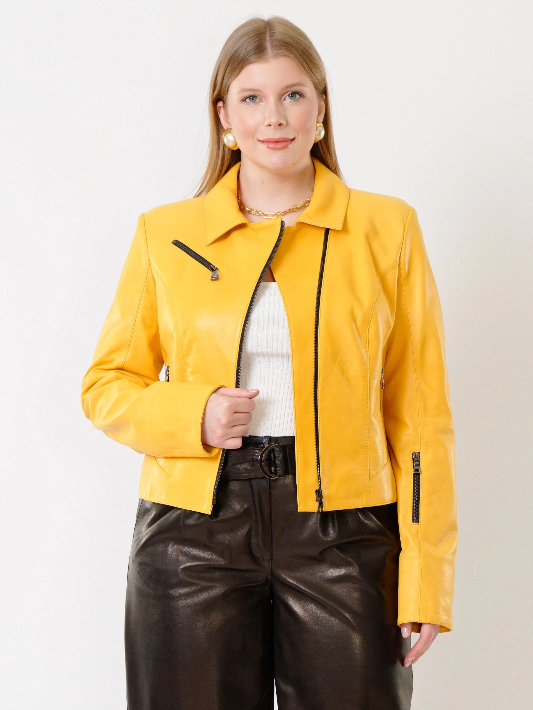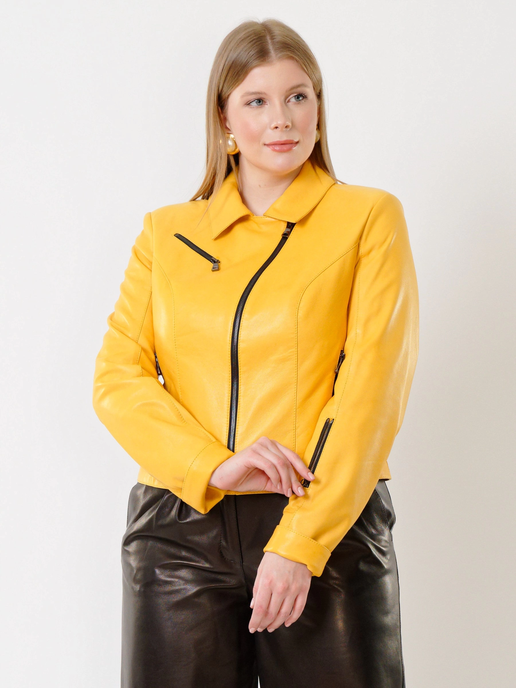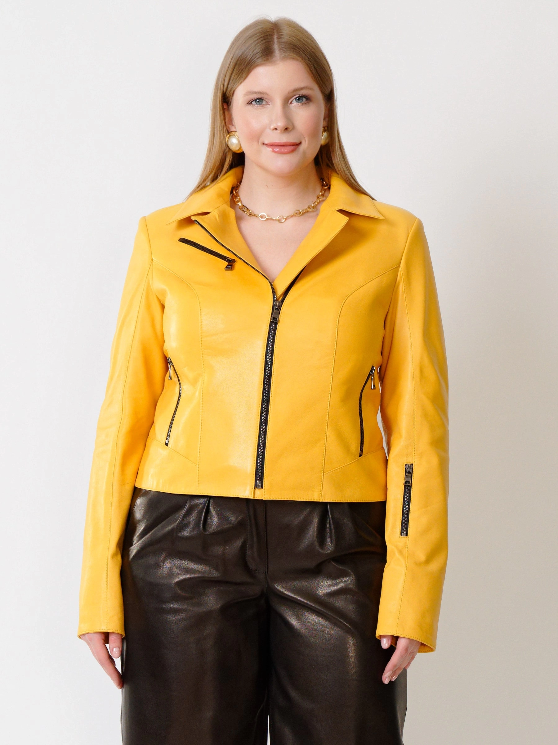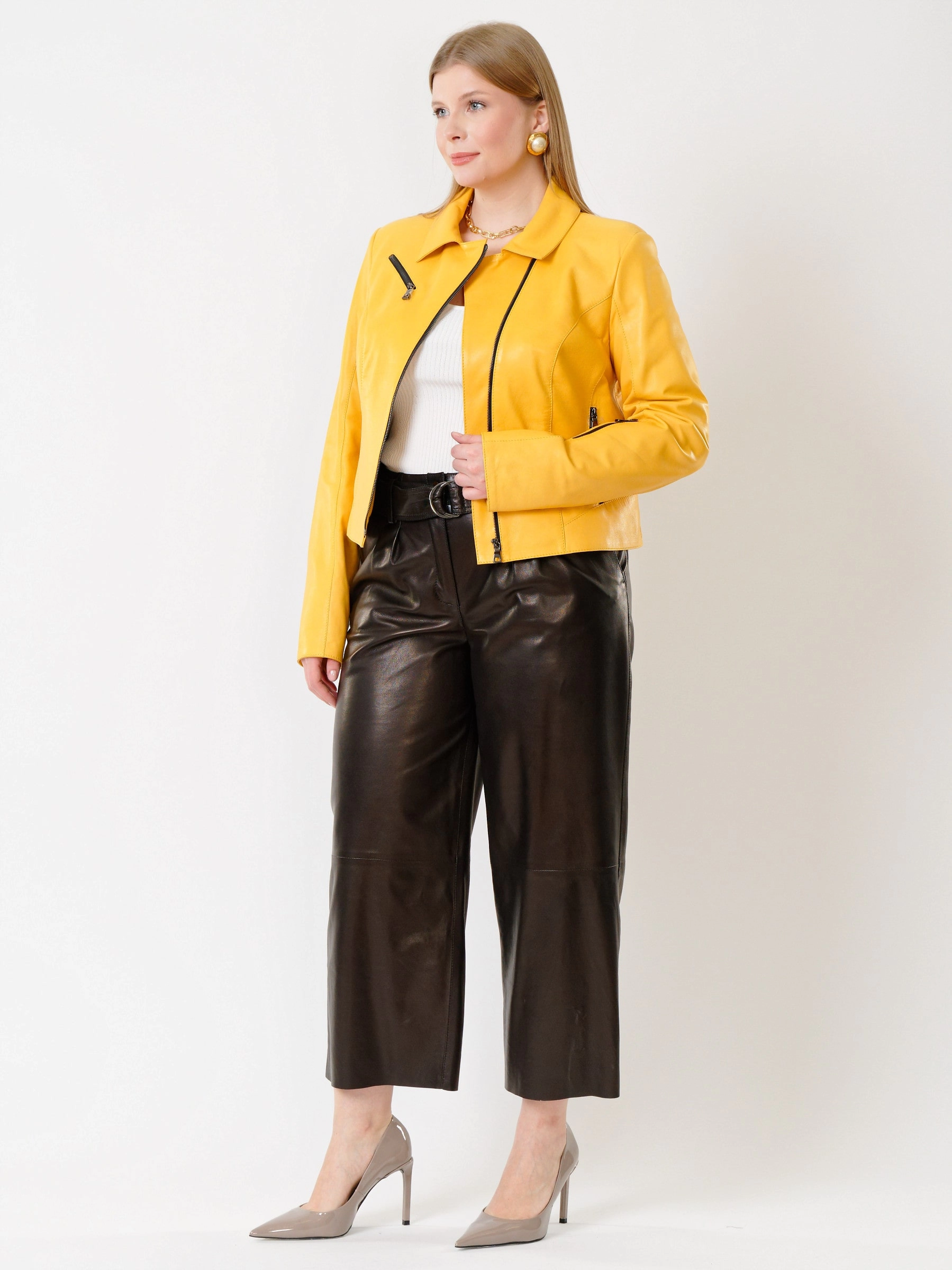 Товар женская кожаная куртка косуха 3005, желтая, размер 48, артикул 91162 выполнен из натуральной кожи с застежкой молния. Рассчитан на сезон: весна-лето. Длина изделия 50 см, силуэт полуприлегающий.