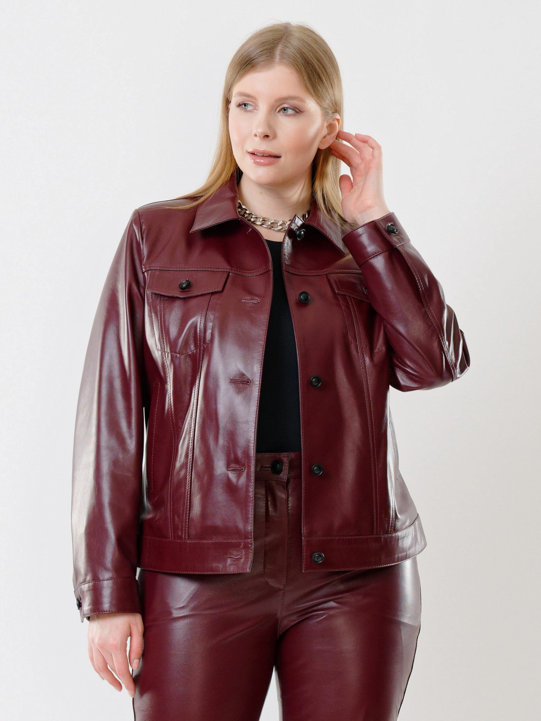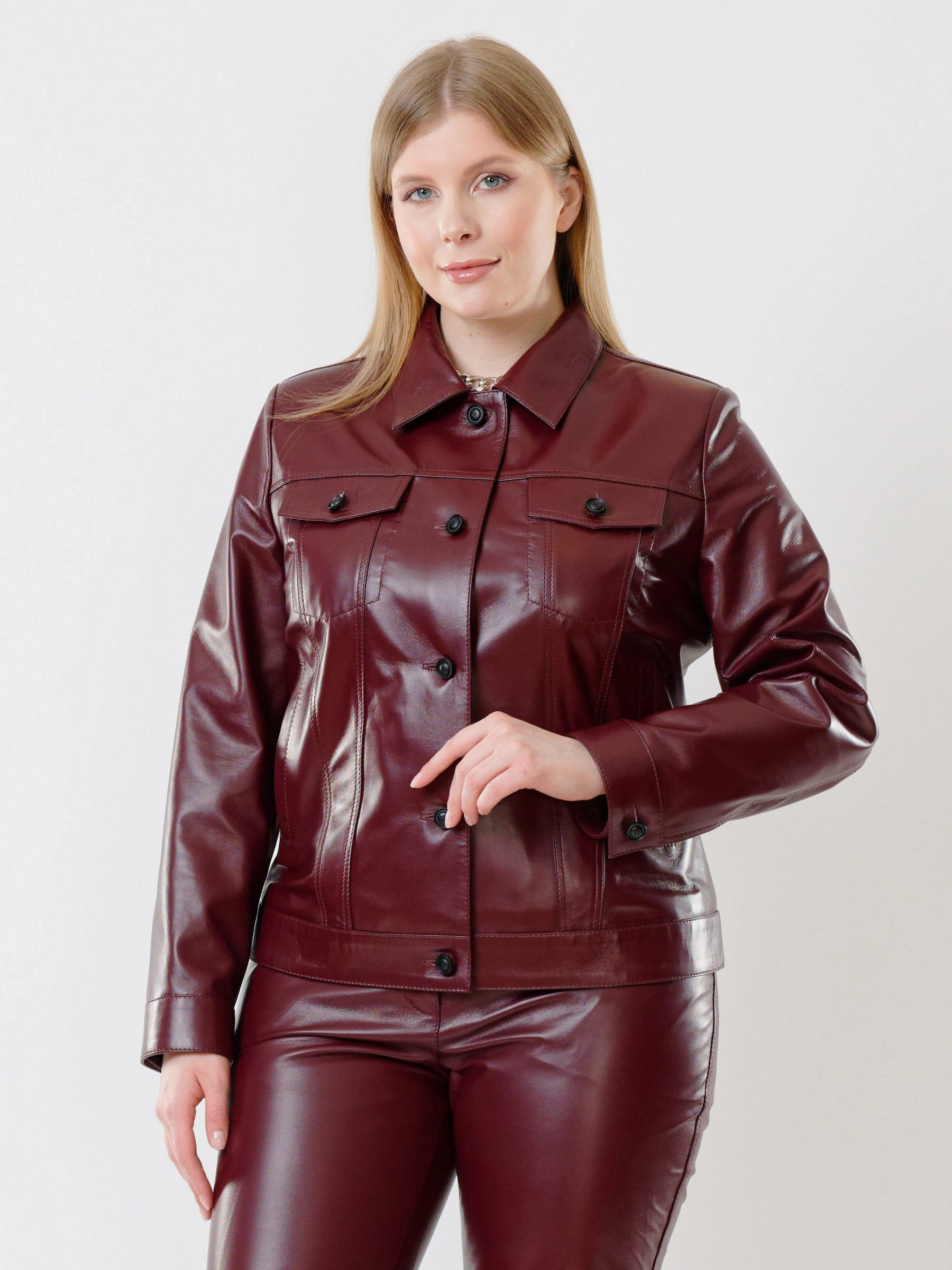 Товар женская кожаная куртка в джинсовом стиле 3008, бордовая, размер 50, артикул 91480 выполнен из натуральной кожи с застежкой пуговицы. Рассчитан на сезон: весна-лето. Длина изделия 58 см, силуэт прямой.