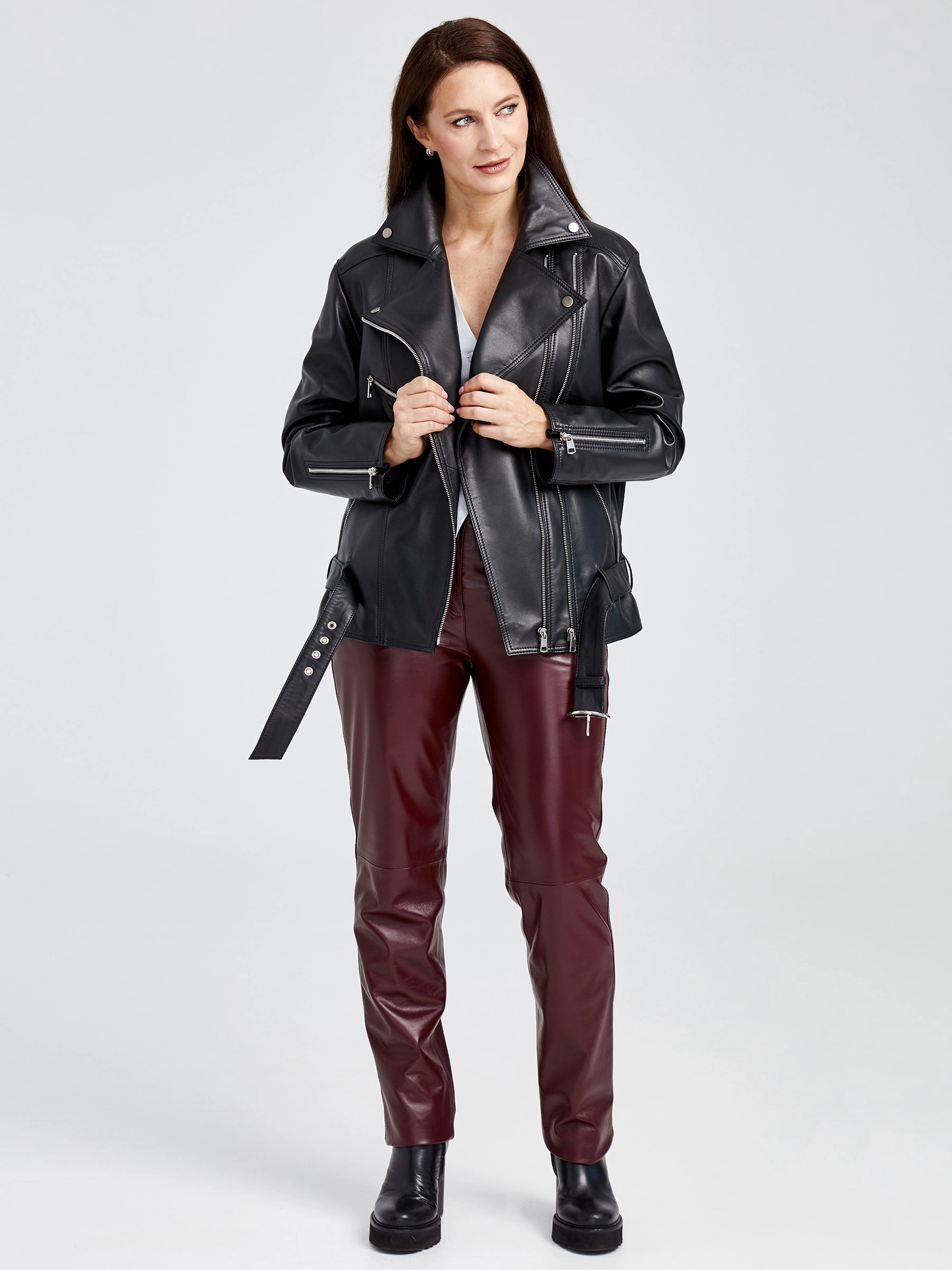 Товар кожаная женская куртка косуха с поясом 3013, черная, размер 48, артикул 91620 выполнен из натуральной кожи с застежкой молния. Рассчитан на сезон: весна-лето. Длина изделия 65 см, силуэт прямой.