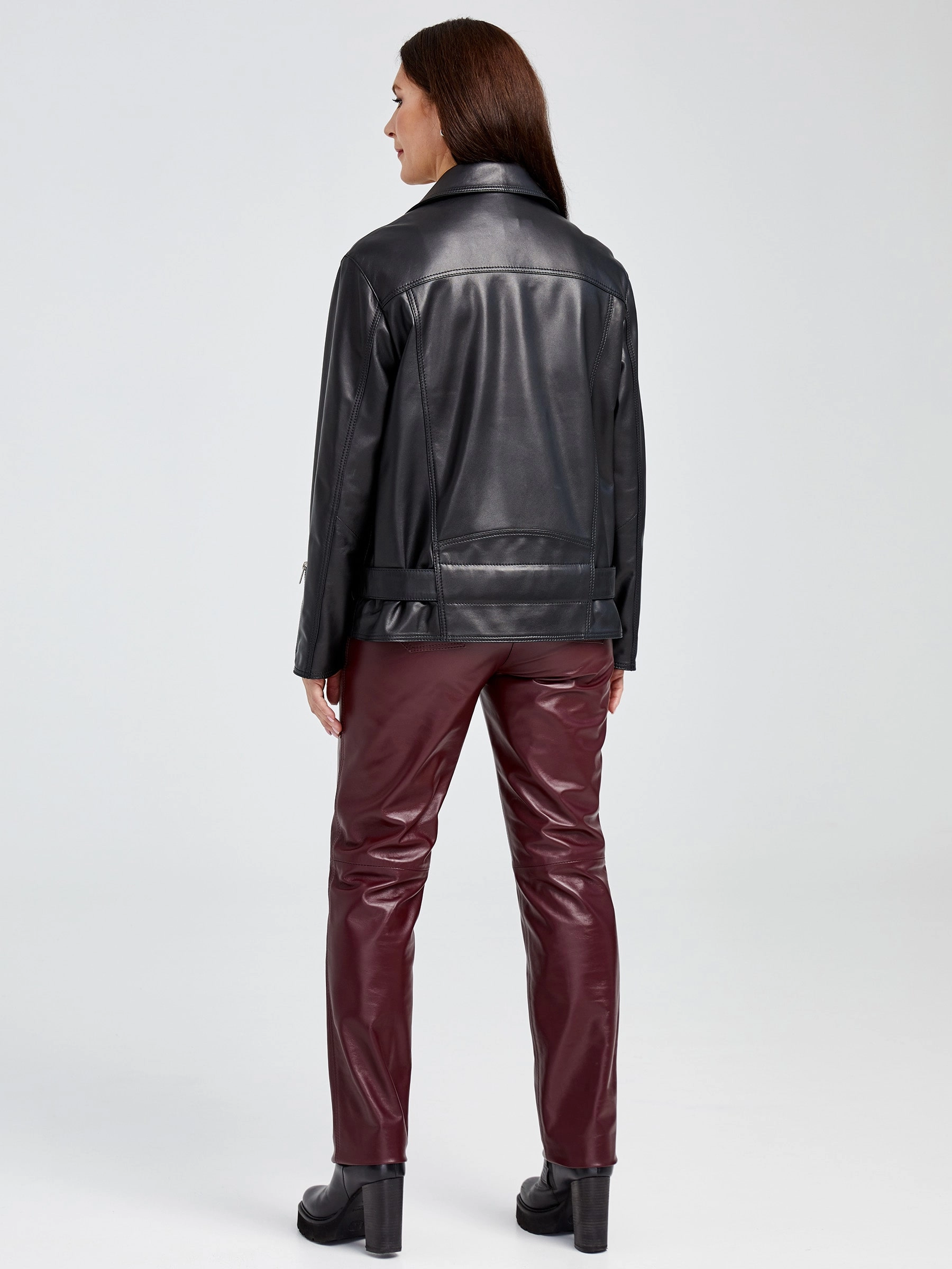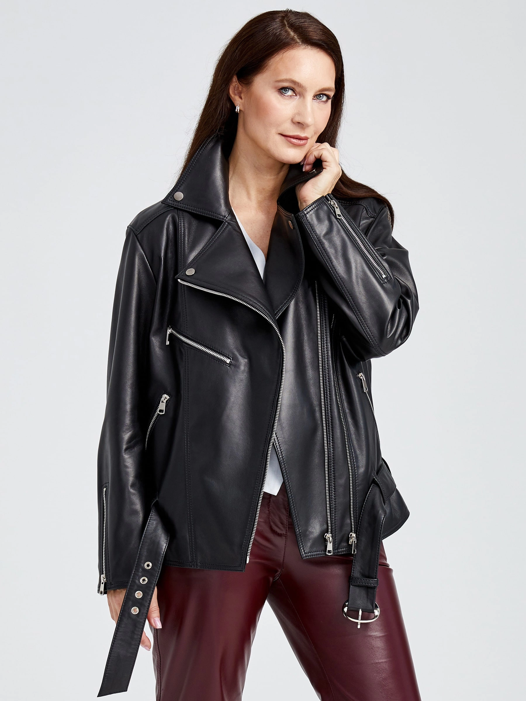 Куртка-косуха из мягчайшей натуральной кожи ягненка на молнии. Английский воротник с широкими лацканами, втачной рукав и прямой силуэт длиной 65 см создают идеальный спортивный шик. Эта дерзкая куртка-косуха из натуральной кожи на молнии заряжена деталями: крупные молнии на рукавах и врезных карманах, съёмный пояс для акцента на талии. Легендарный образ в духе рок-н-ролла — идеально смотрится с укороченными джинсами, кедами, ботинками в стиле милитари или даже с платьями-комбинациями для контраста!