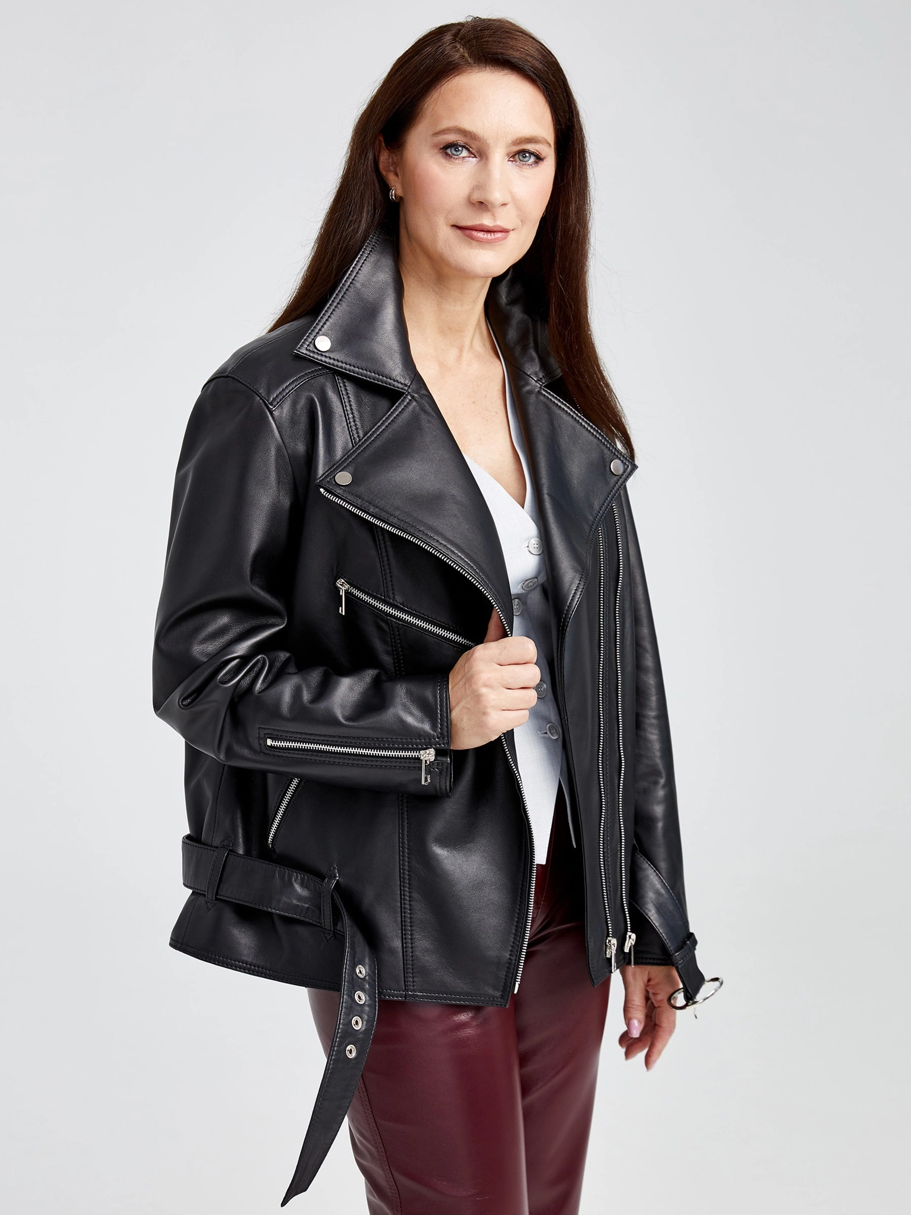 Кожаная женская куртка косуха с поясом 3013, черная, размер 48, артикул 91620