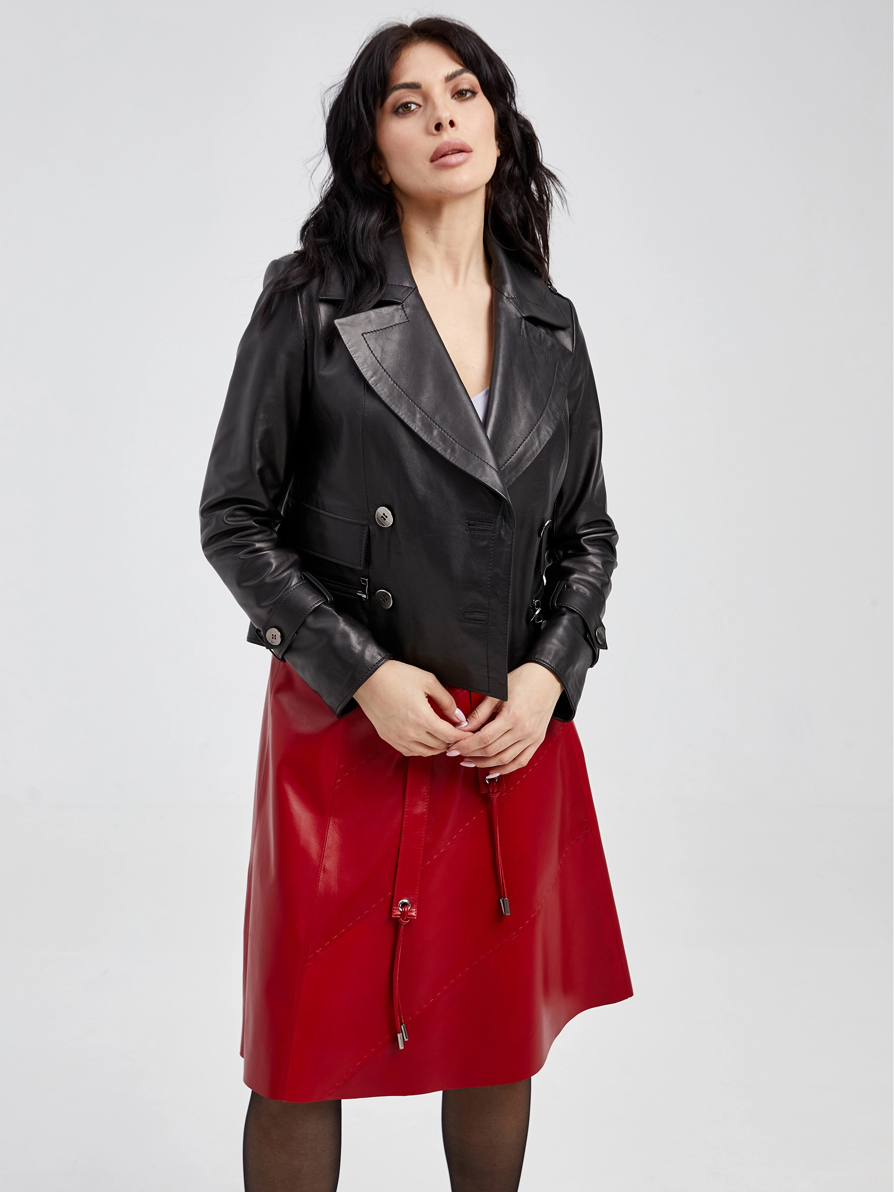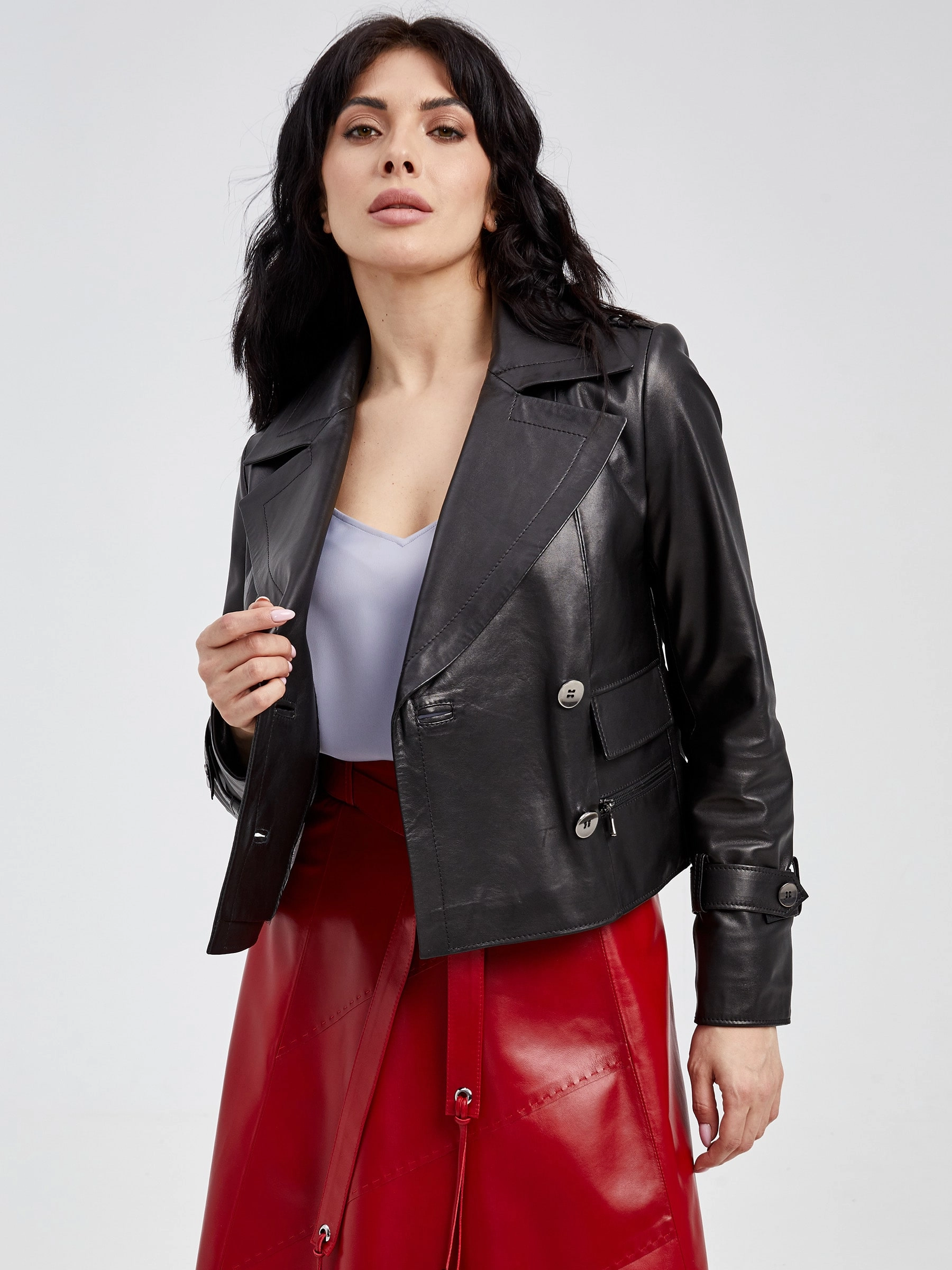 Двубортный кожаный женский пиджак 3014, черный, размер 48, артикул 91571