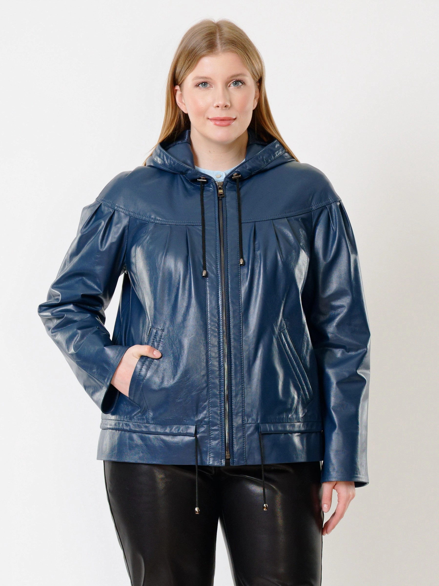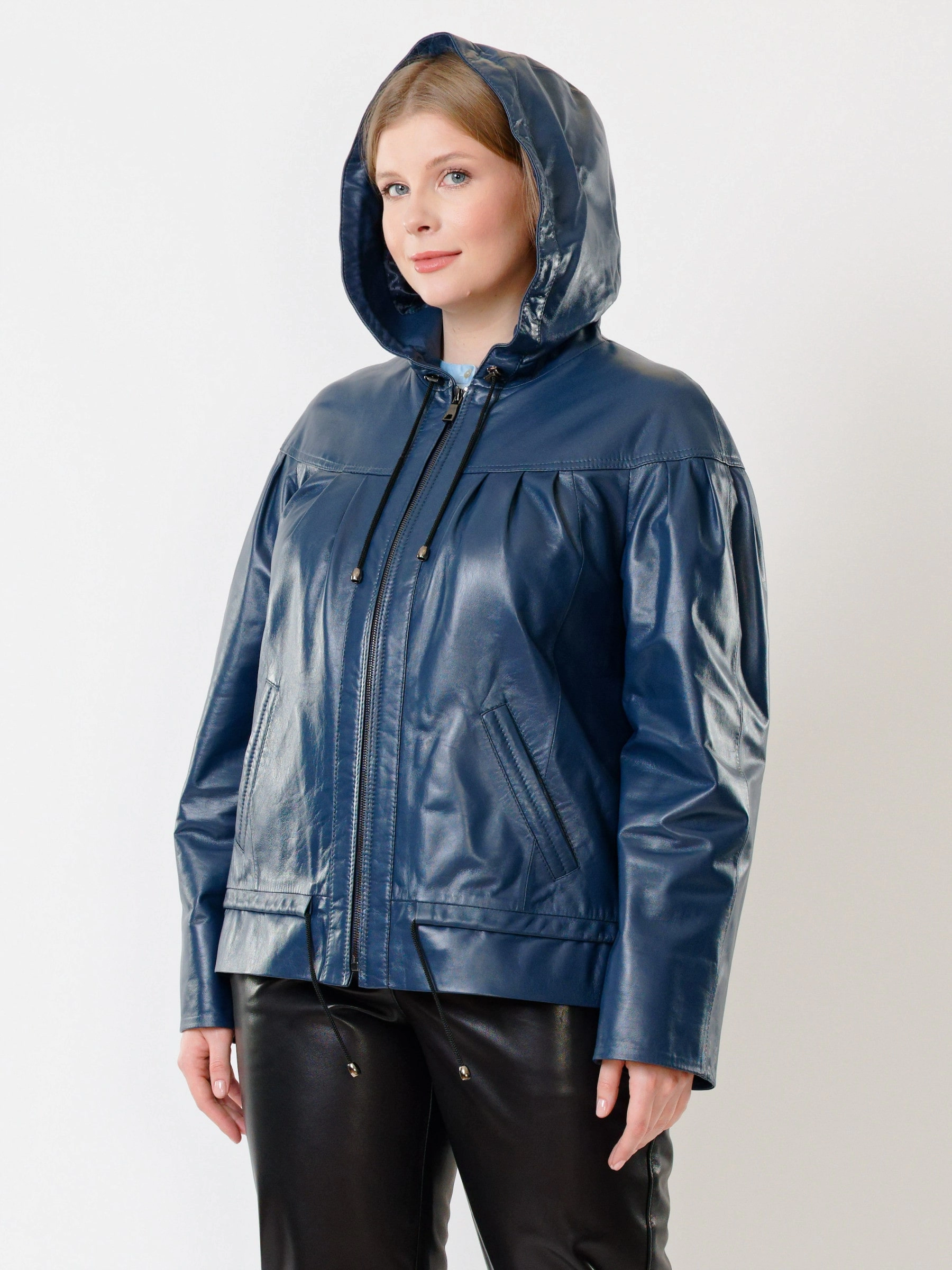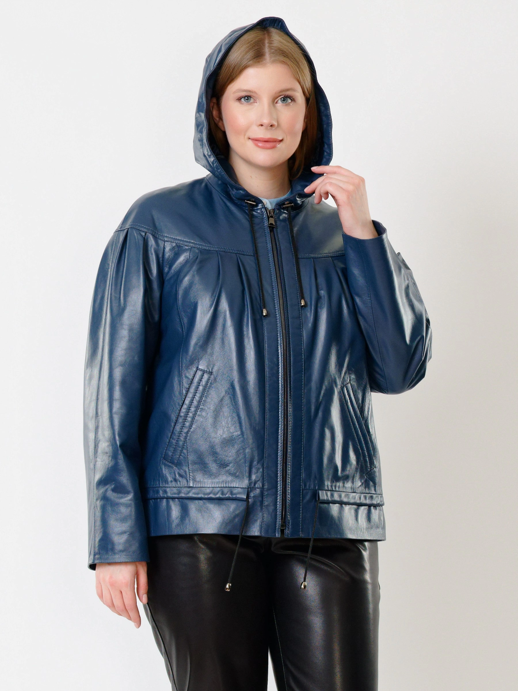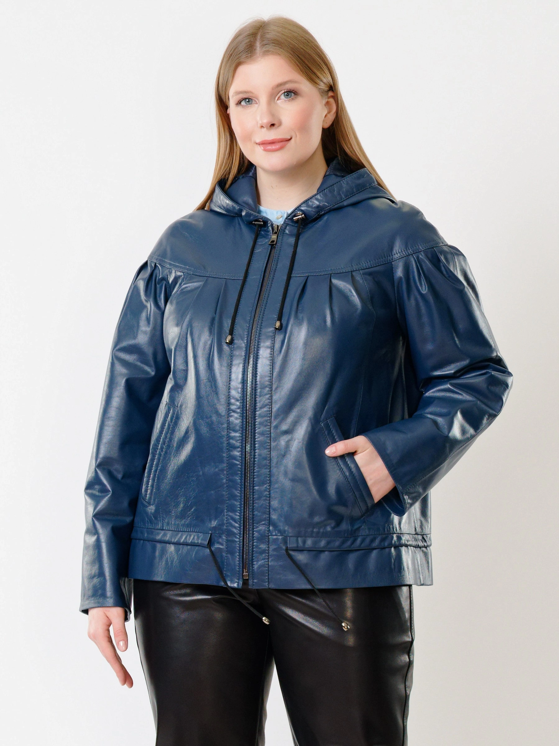 Кожаная женская куртка с капюшоном 303, синяя, размер 54, артикул 91190