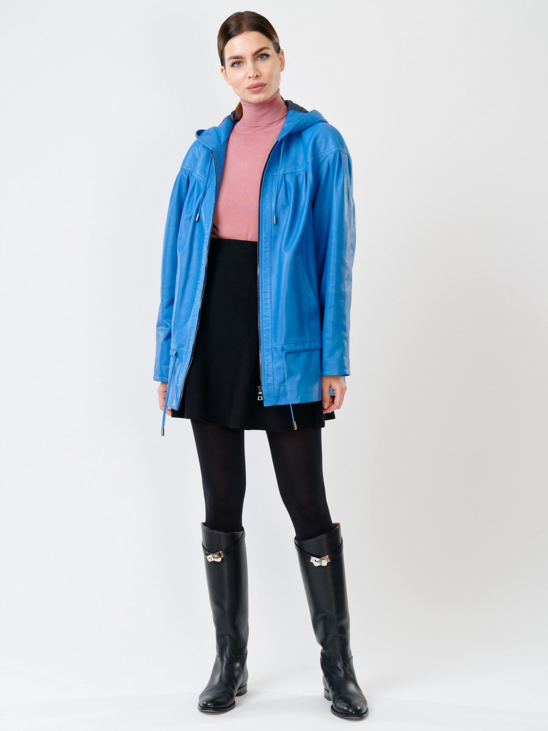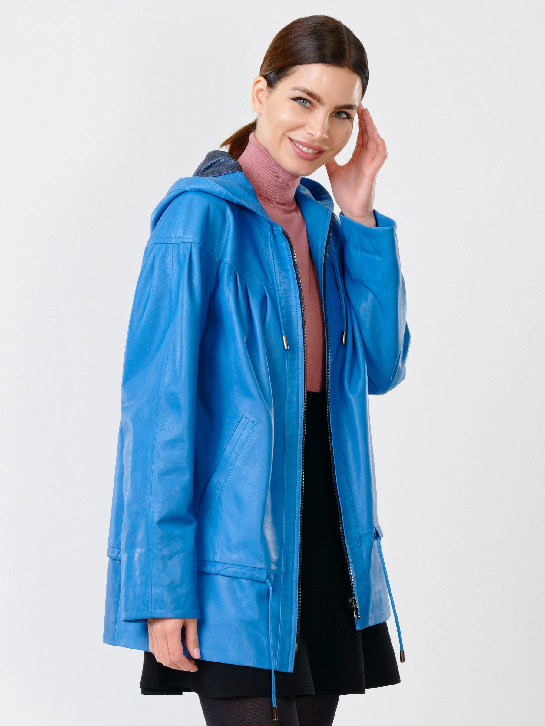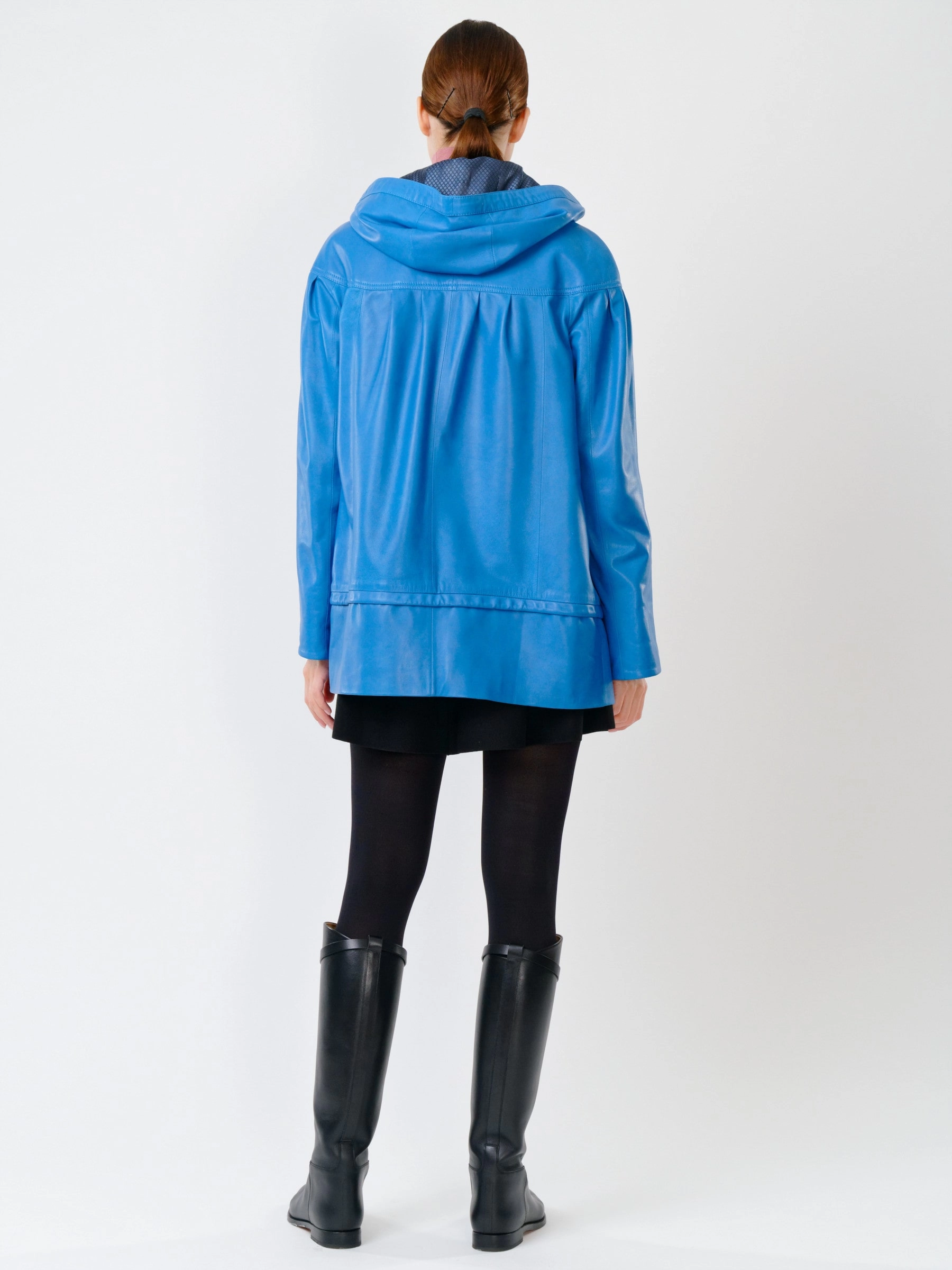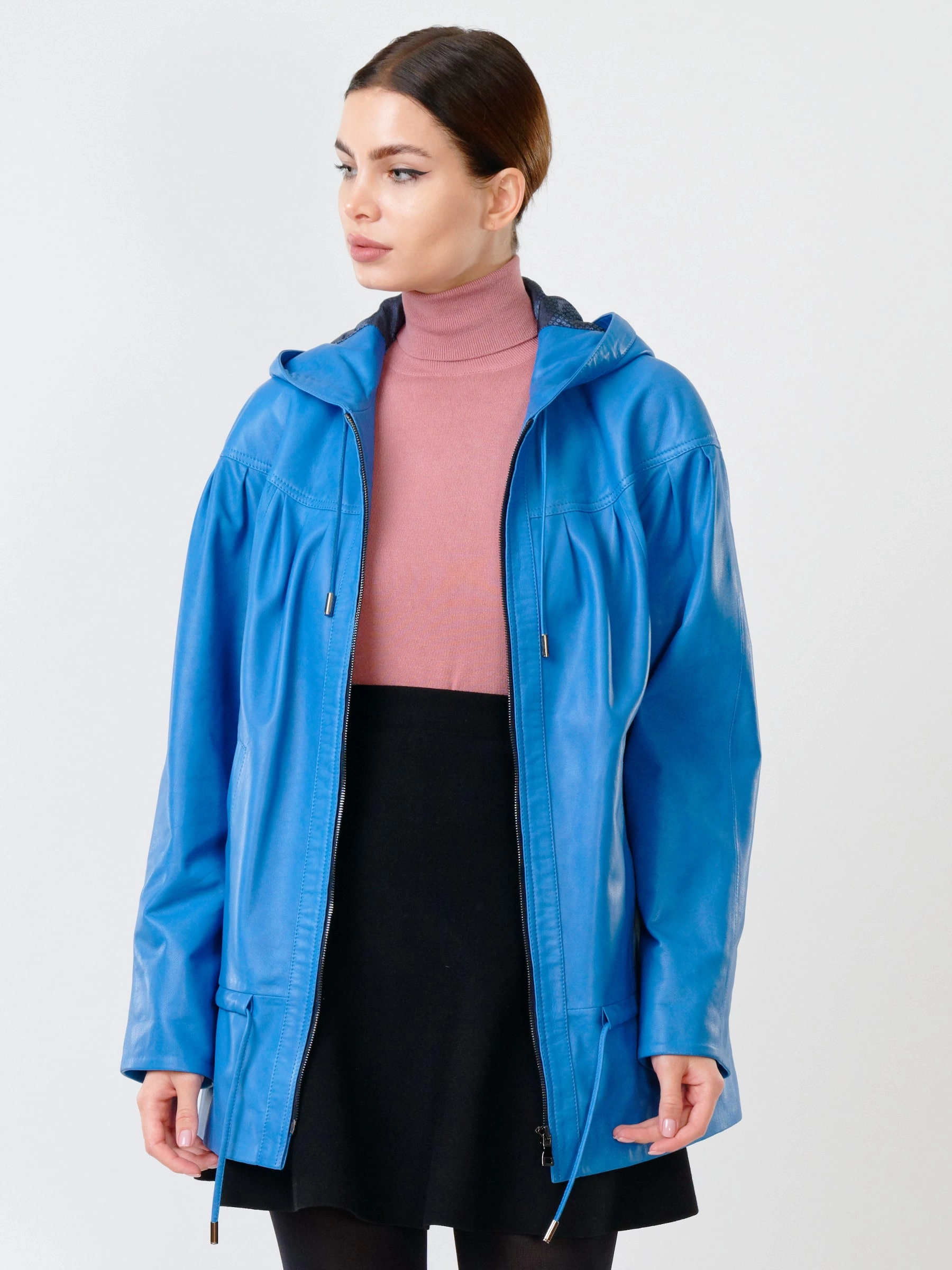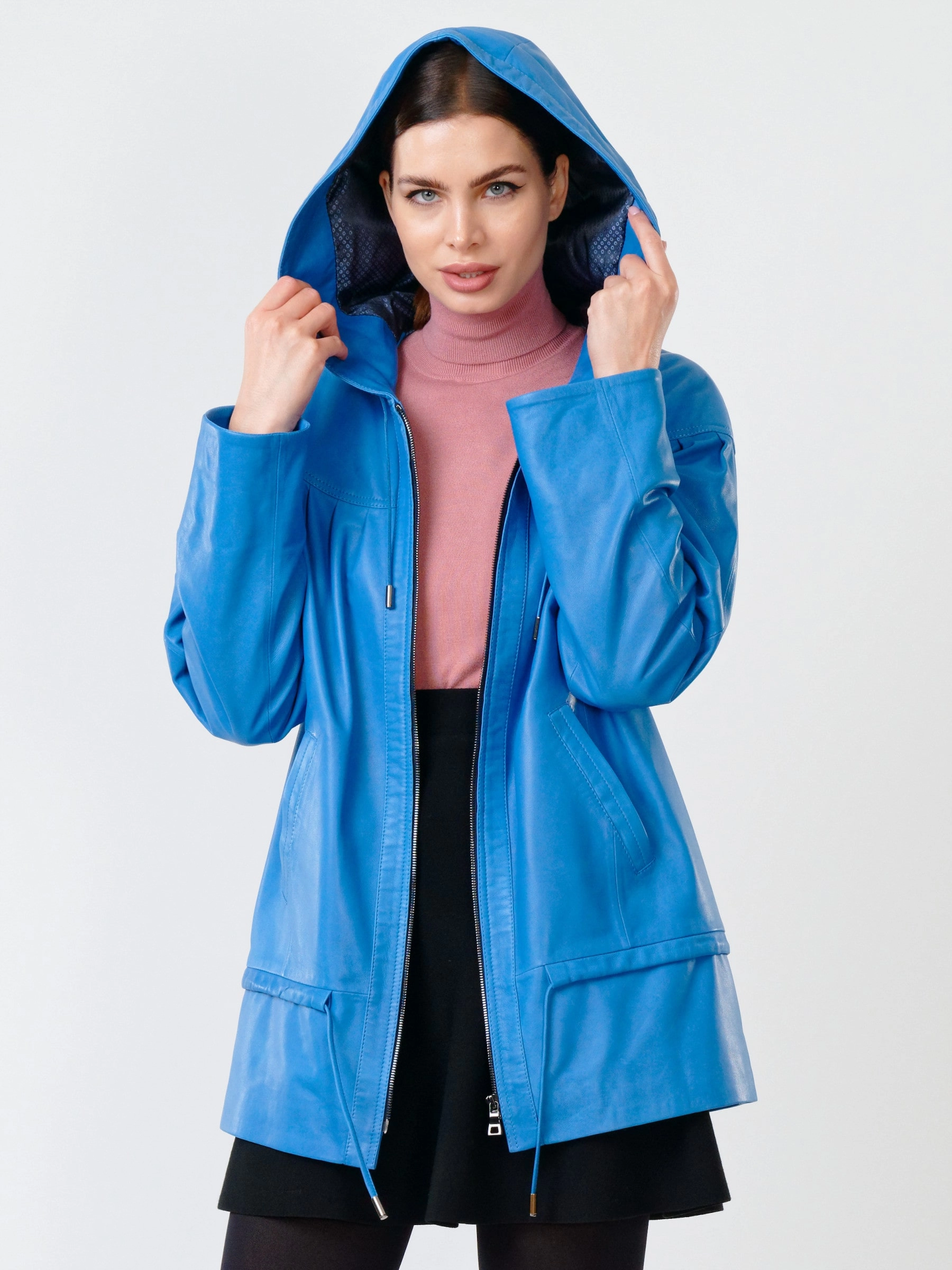 Товар кожаная женская куртка с капюшоном 303у, голубая, размер 54, артикул 90690 выполнен из натуральной кожи с застежкой молния. Рассчитан на сезон: весна-лето. Длина изделия 75 см, силуэт свободный.