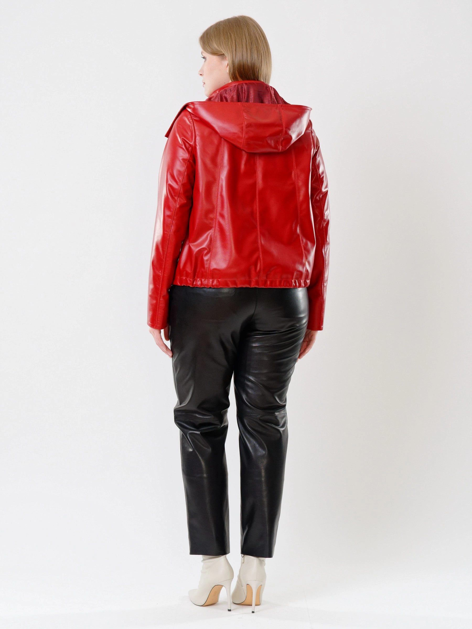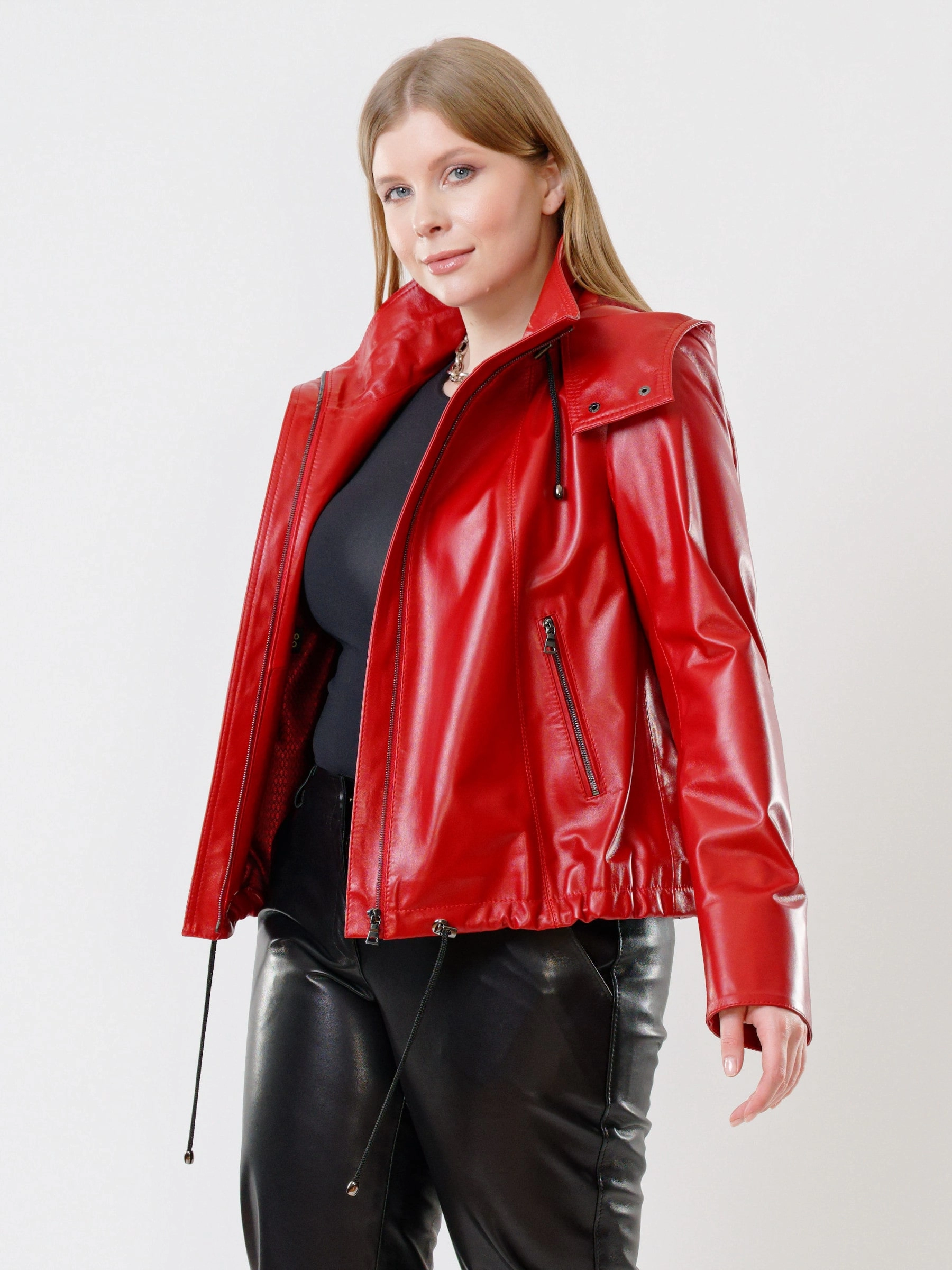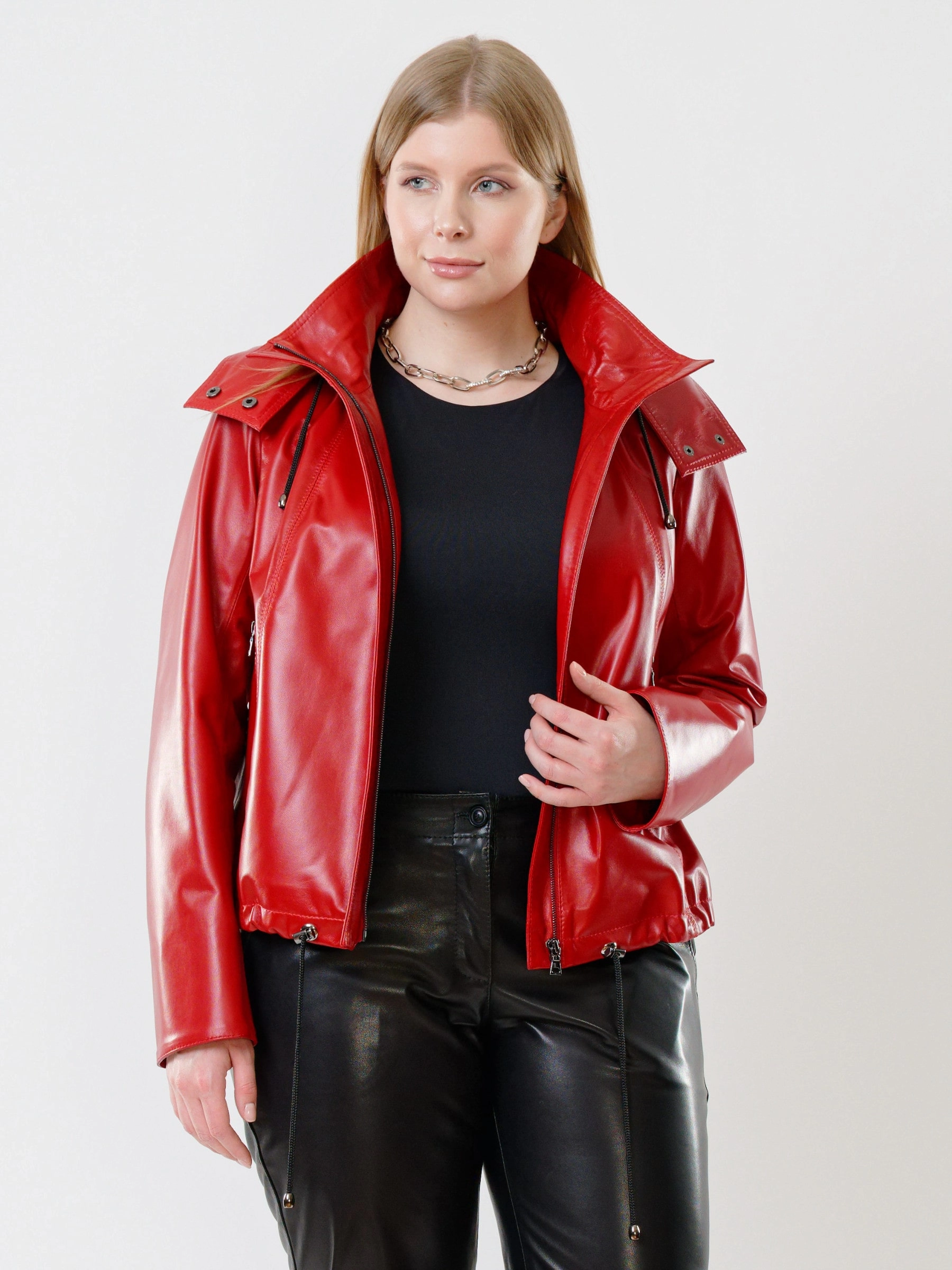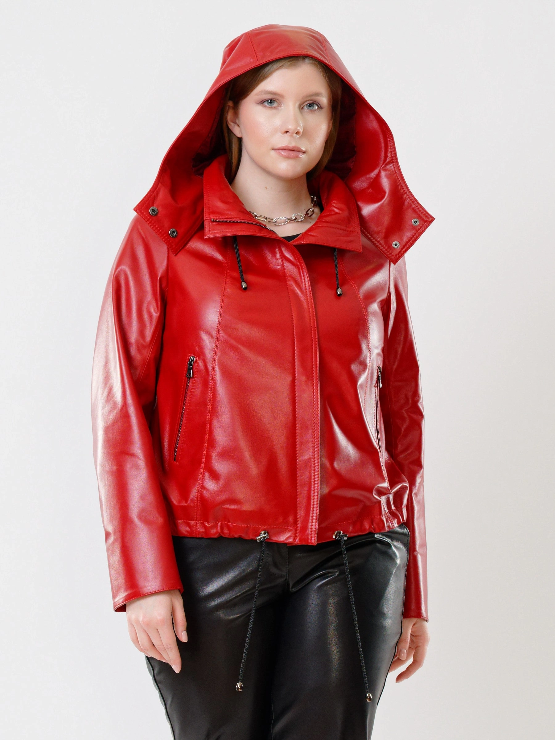 Кожаная женская куртка бомбер с капюшоном 305, красная, размер 48, артикул 91440