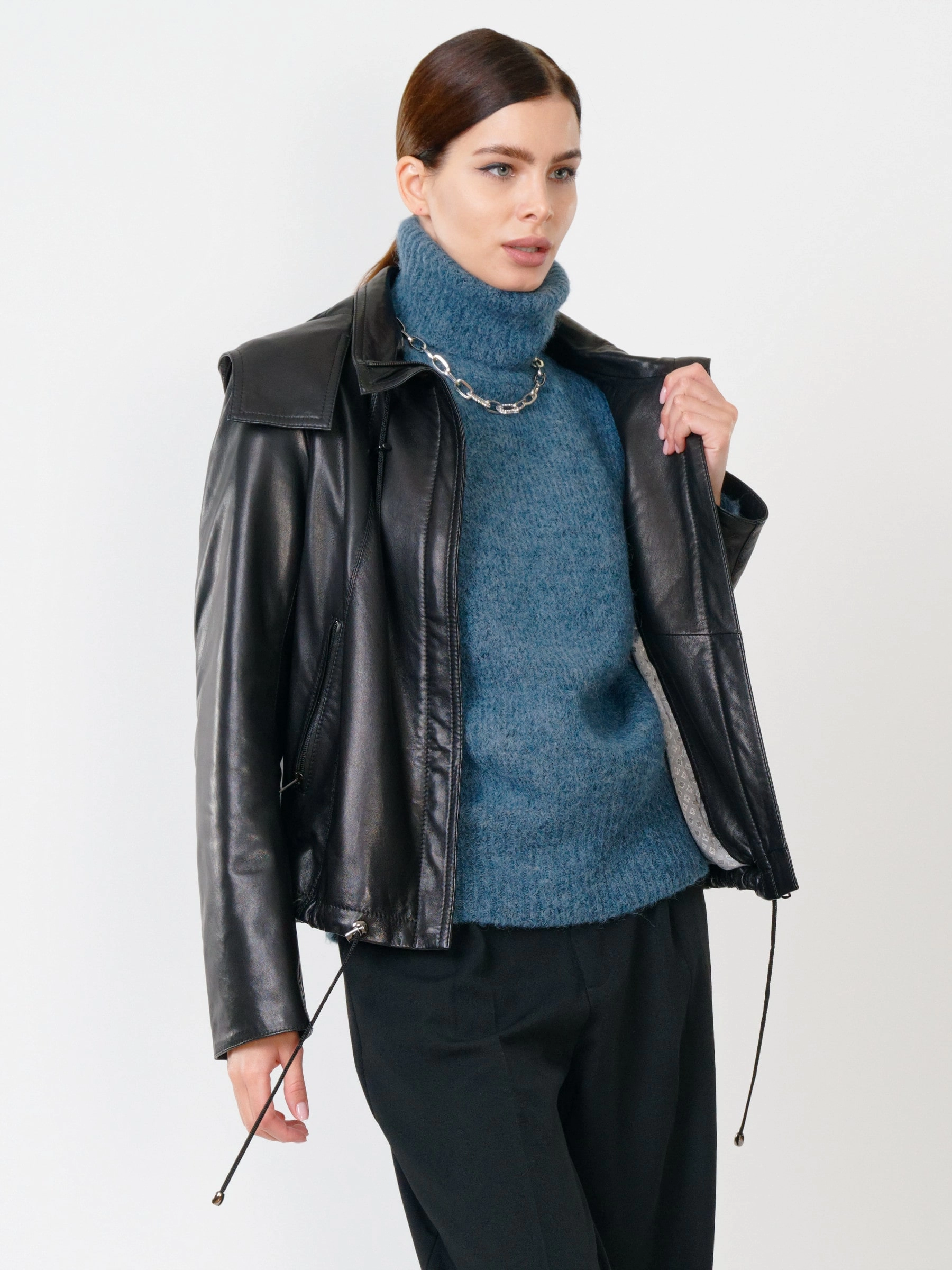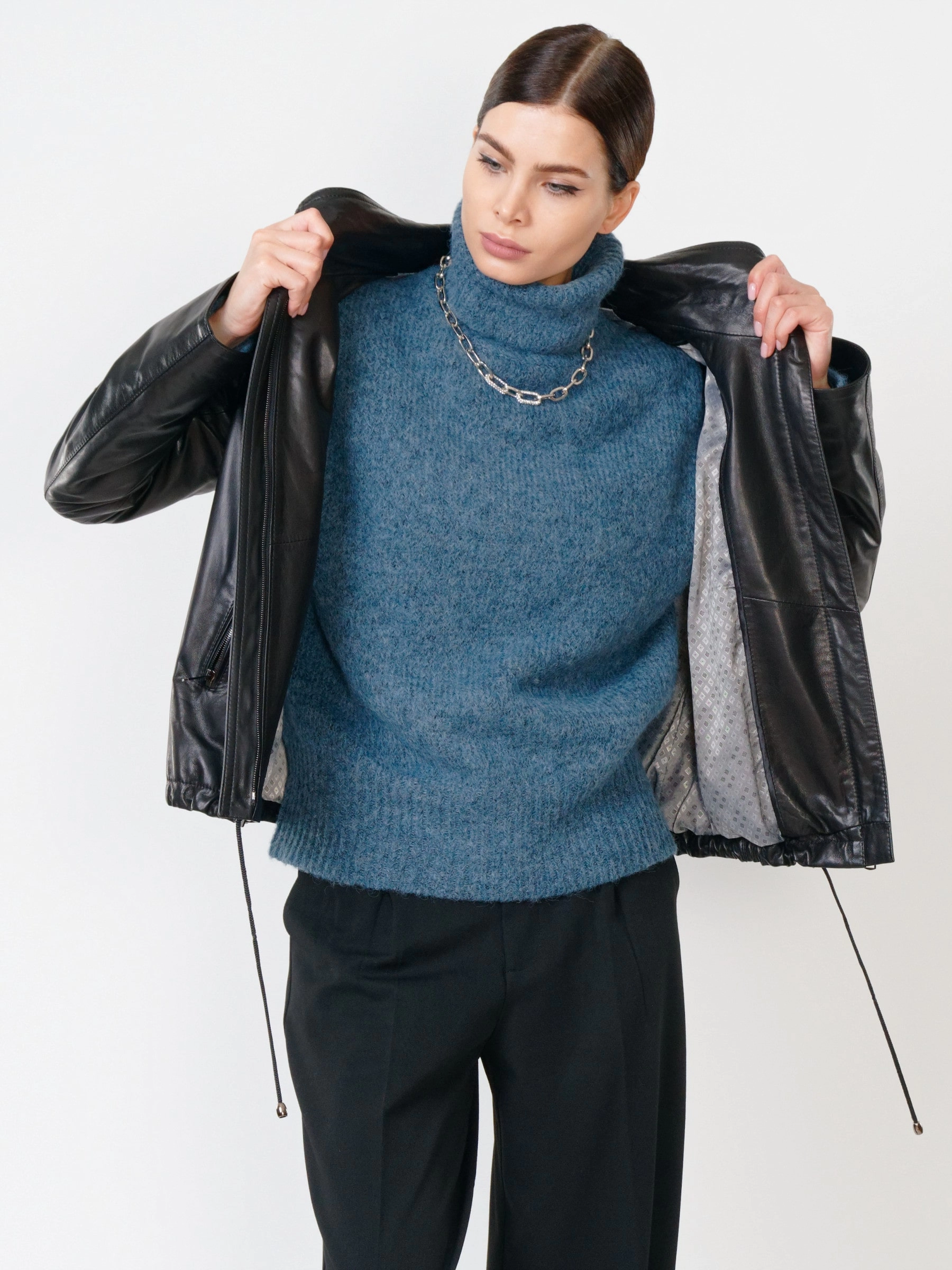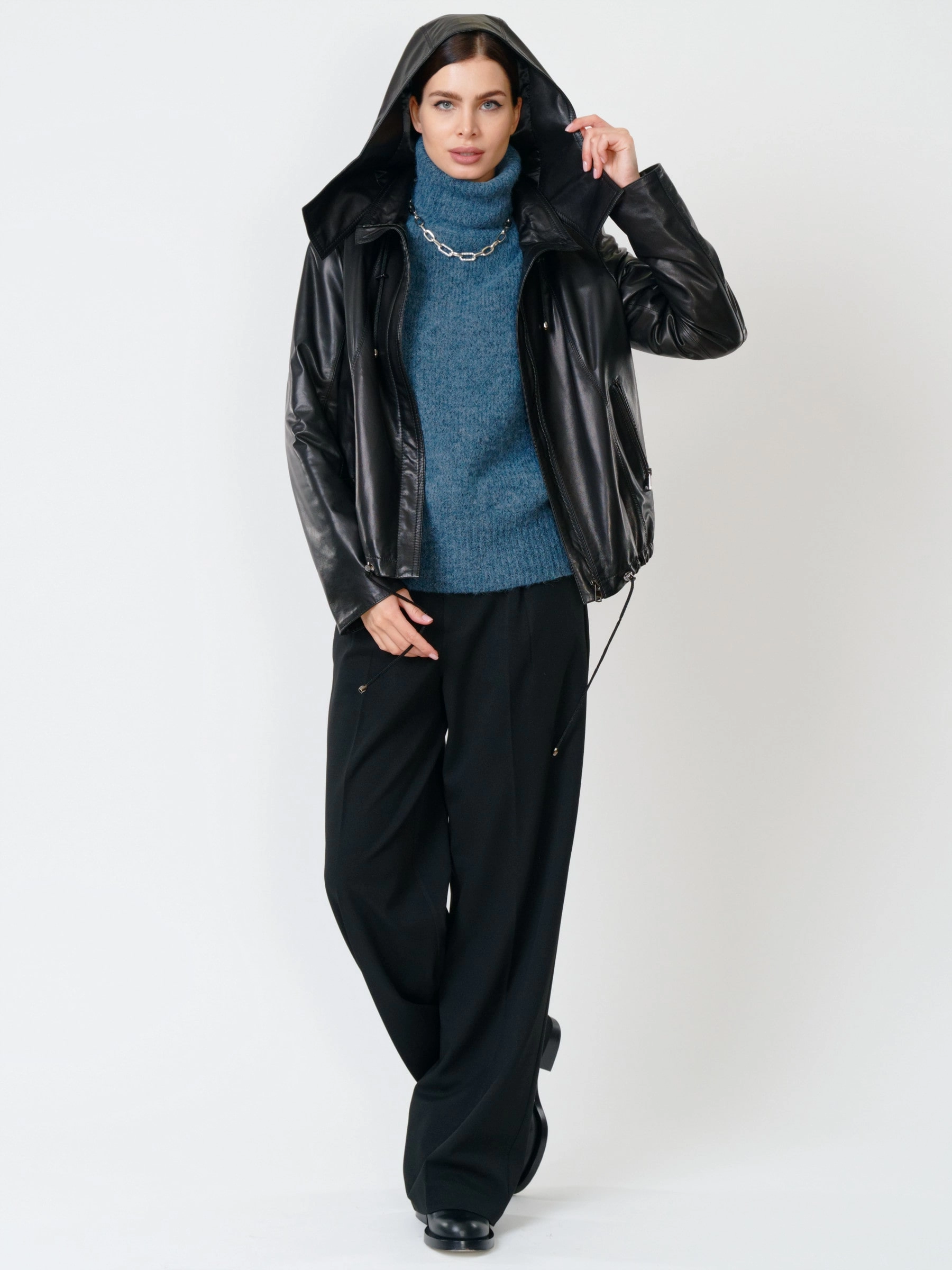 Кожаная женская куртка бомбер с капюшоном 305, черная, размер 46, артикул 90820