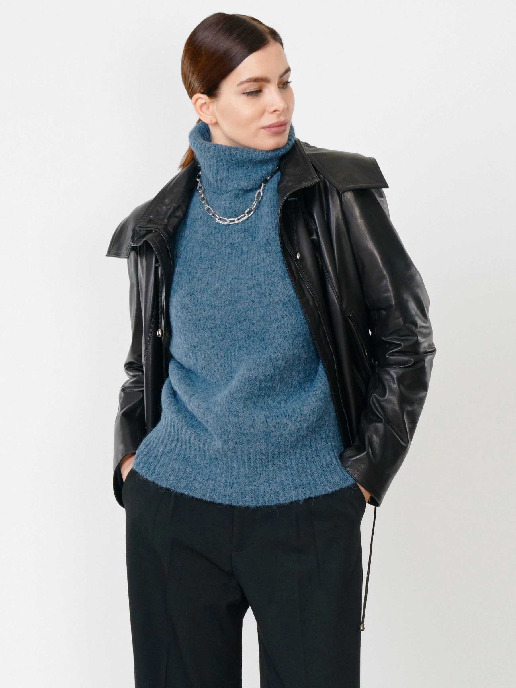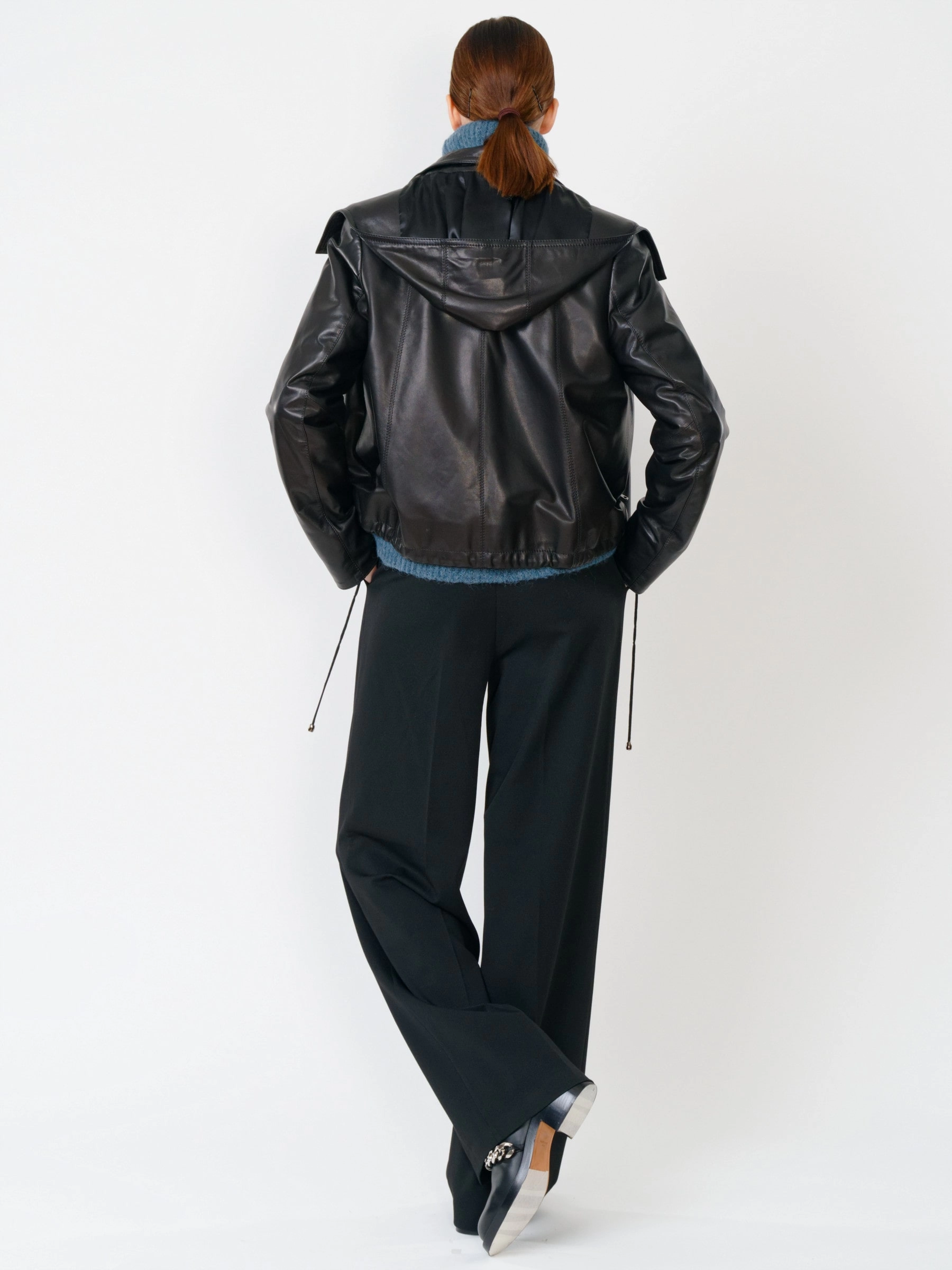 Кожаная куртка-бомбер с капюшоном на молнии — дерзкий сплав уличного стиля и функциональности. Свободный силуэт из гладкой натуральной кожи премиум-класса дополнен отстегивающимся капюшоном и высокой стойкой. Практичность модели подчеркивают регулируемые кулиски по низу и лаконичные врезные карманы. Носите эту спортивную куртку с oversize-худи и кроссовками для бунтарского образа или с кожаными леггинсами для подчеркнутой женственности.