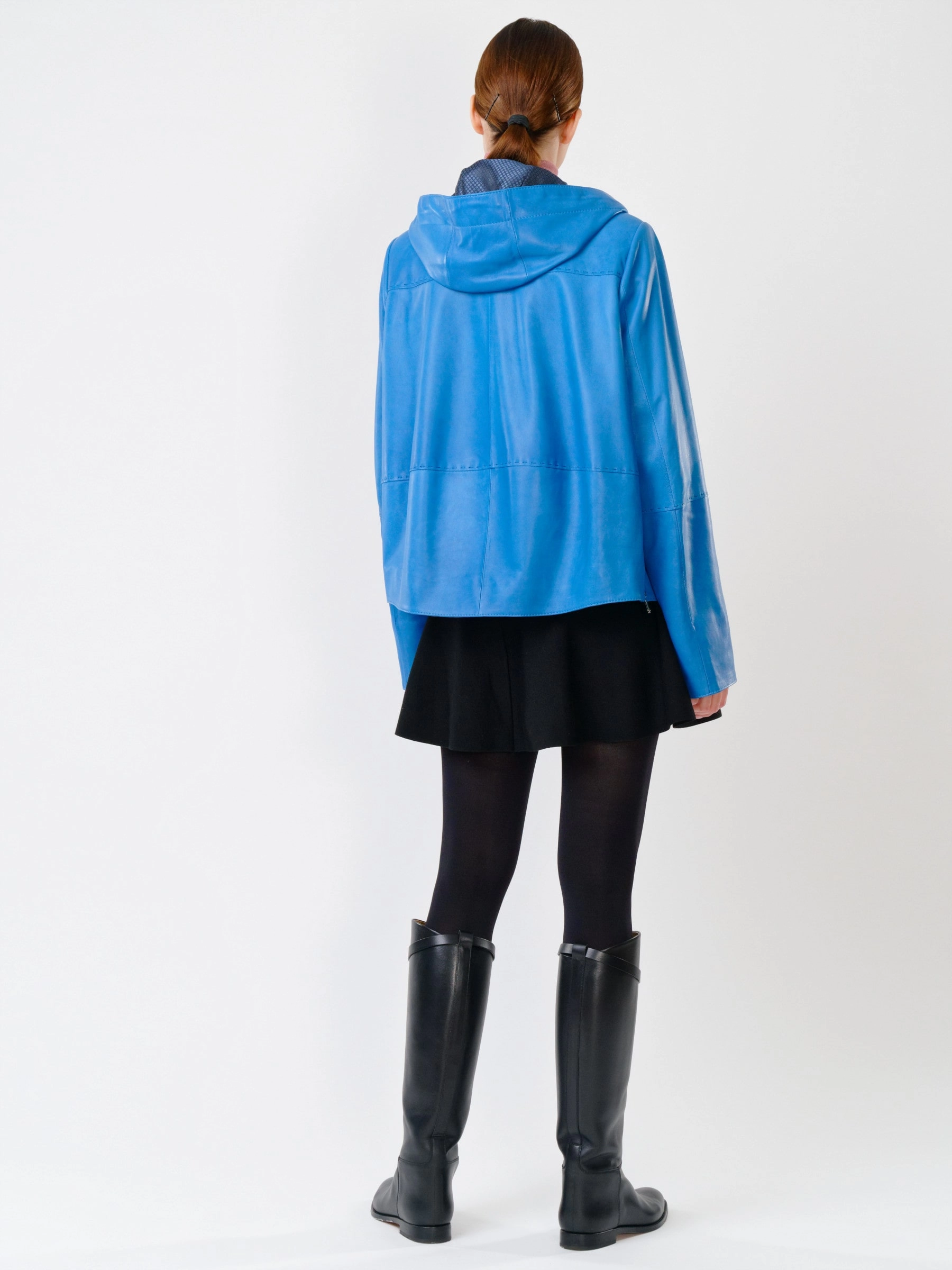 Куртка с капюшоном из натуральной кожи голубого цвета на молнии длиной 63 см свободного силуэта в повседневном стиле. Несъёмный капюшон регулируется кулиской, а втачные рукава и свободный крой обеспечивают комфорт. Украшена ручным стежком и дополнена двумя боковыми карманами. Идеально сочетается с худи, джинсами, кроссовками и рюкзаком, создавая свежий городской лук. Изготовлена из мягкой гипоаллергенной кожи премиального качества с натуральным крашением.