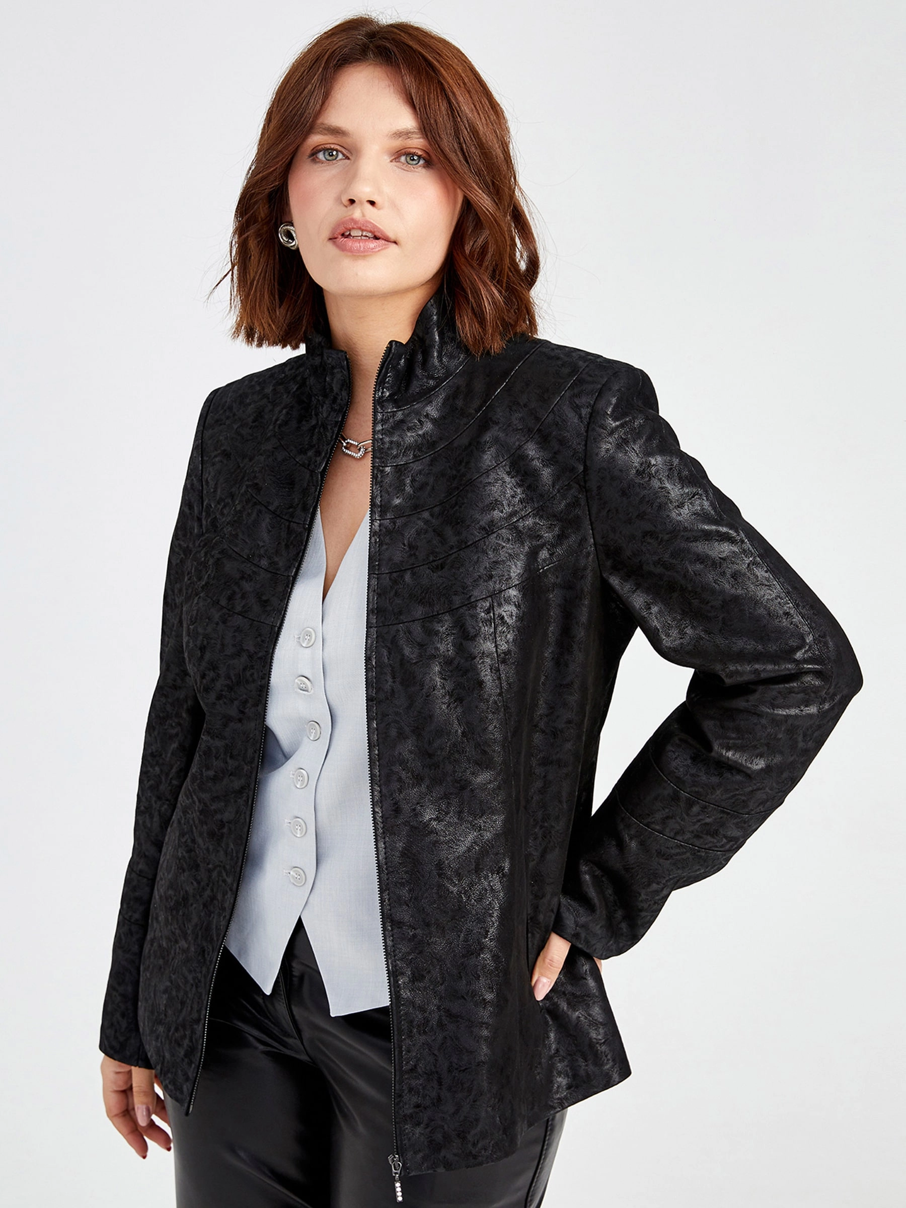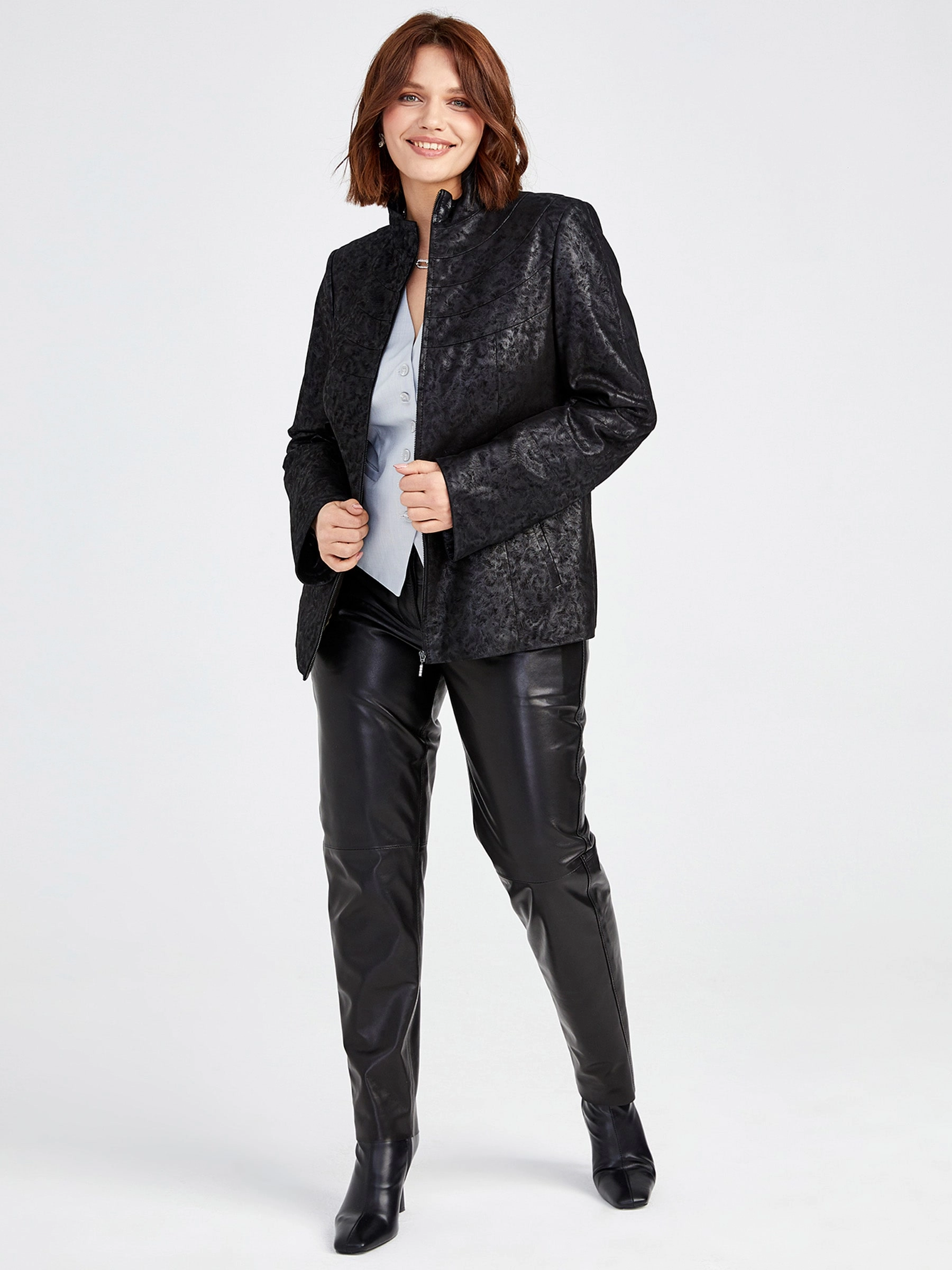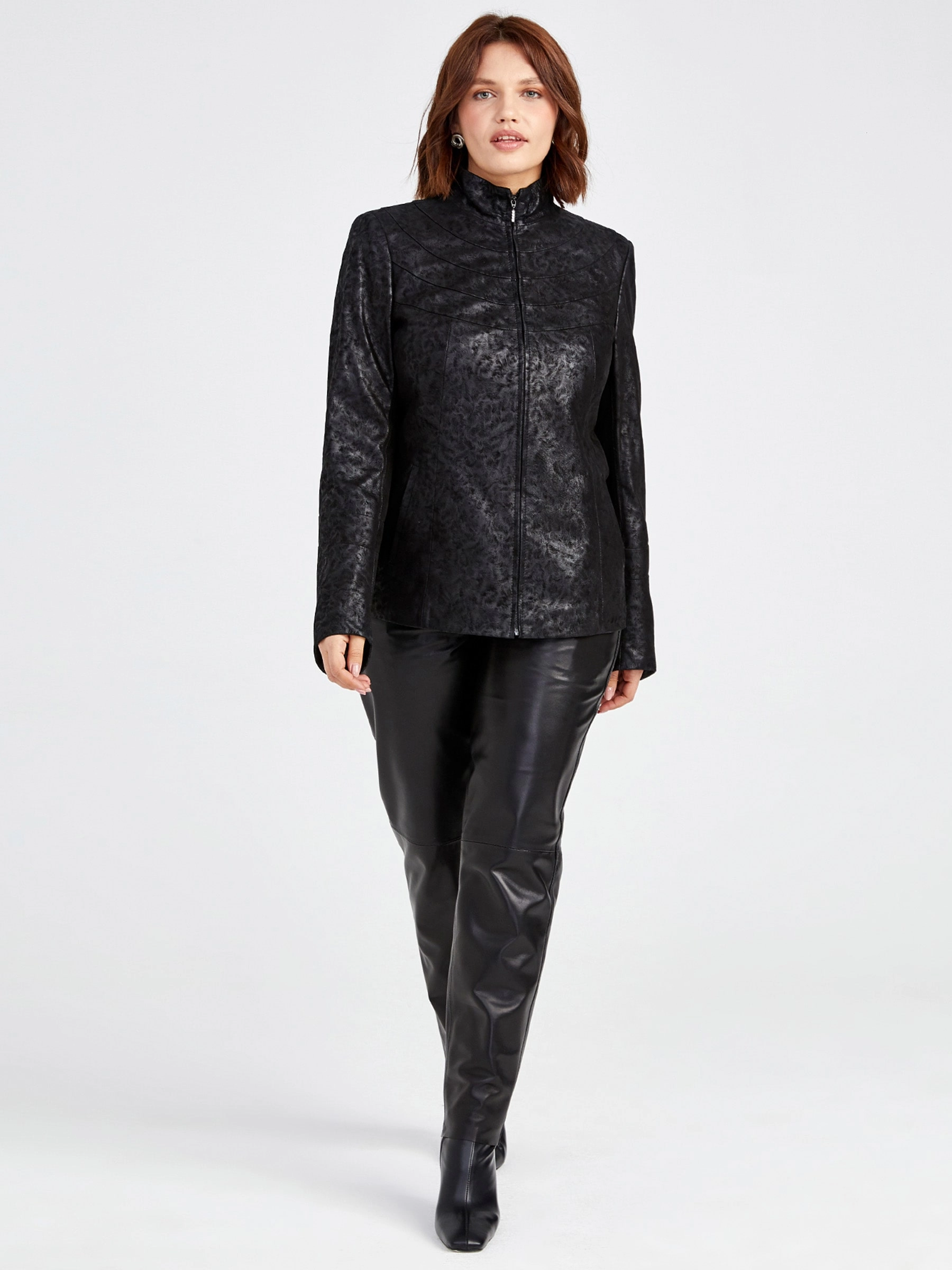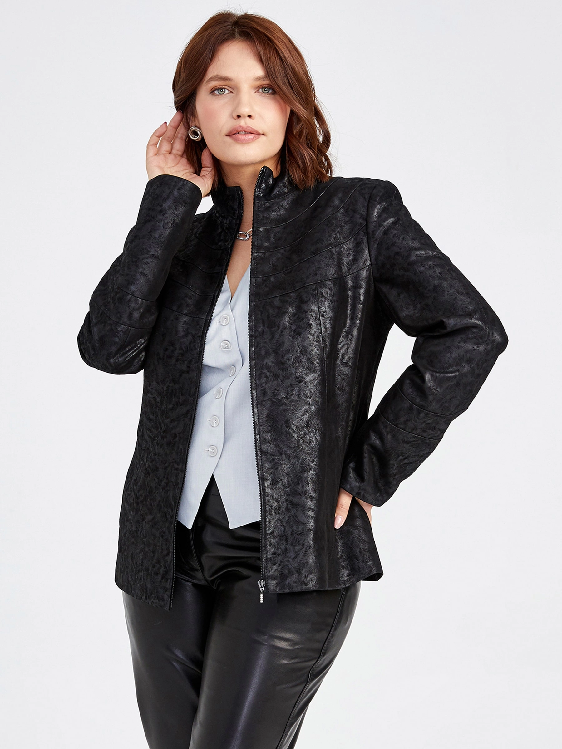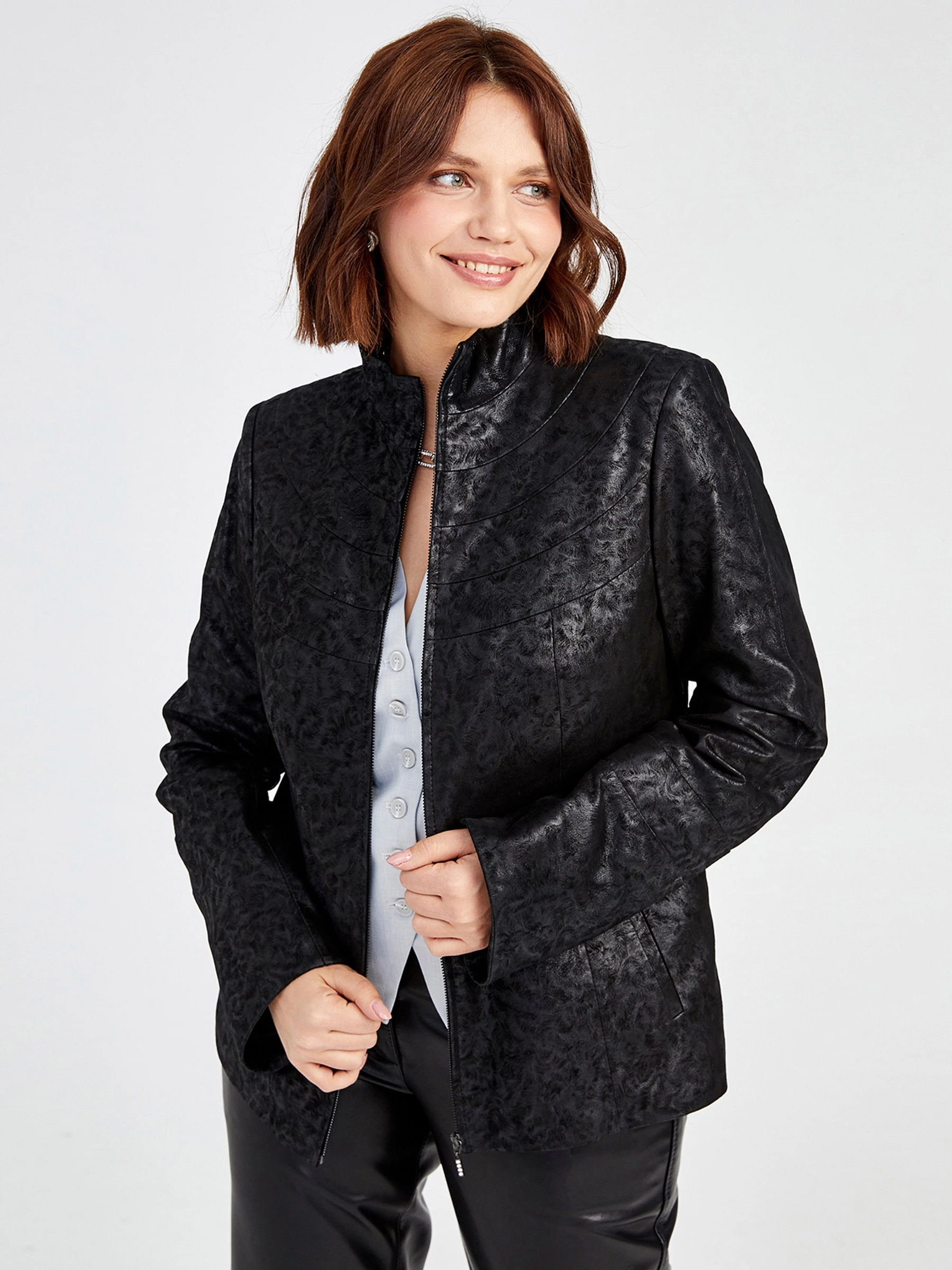 Элегантная куртка из натуральной замши на молнии с полуприлегающим силуэтом и воротником-стойкой, модель премиального качества с деликатным теснением и удобными врезными карманами для комфортной посадки. Совет стилиста: сочетайте с простой футболкой, прямыми джинсами и грубыми ботинками для повседневного образа или с шелковым платьем-миди и ботильонами для утончённого контраста.