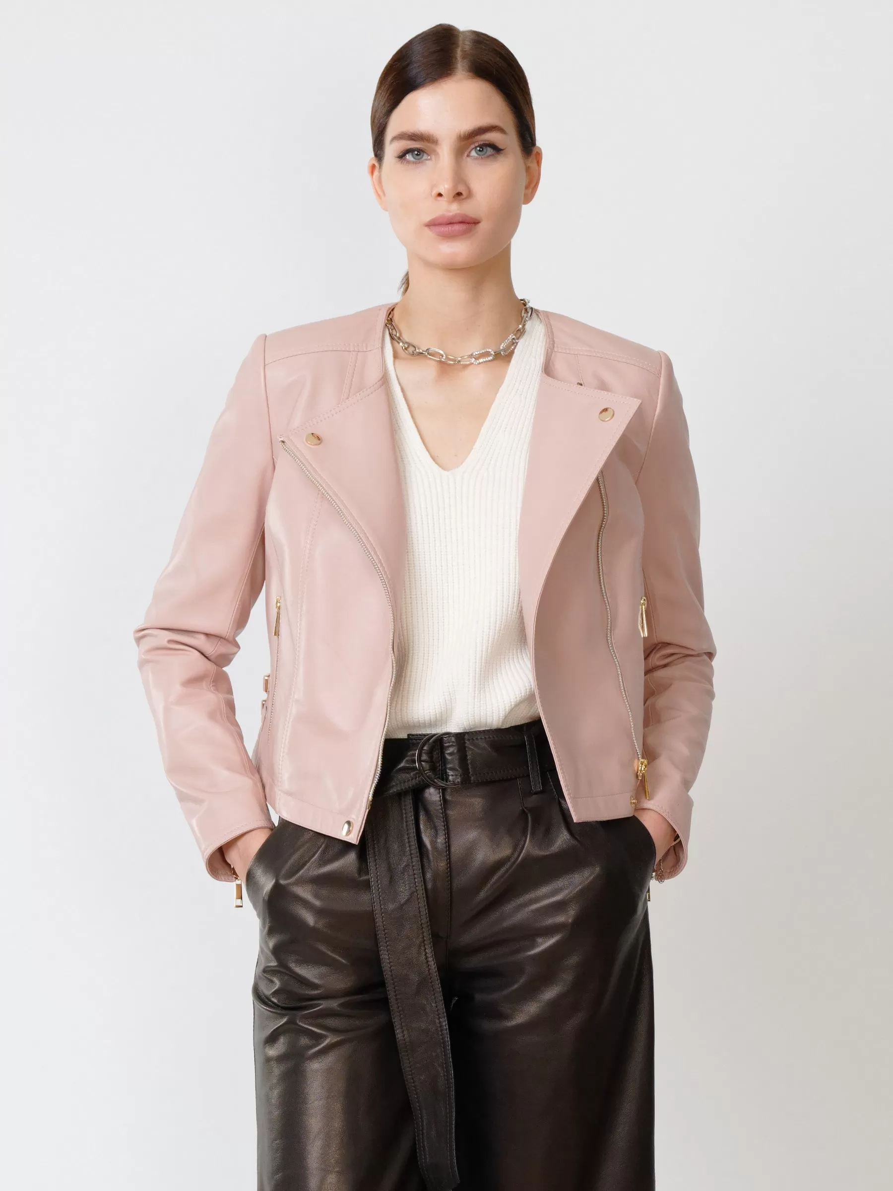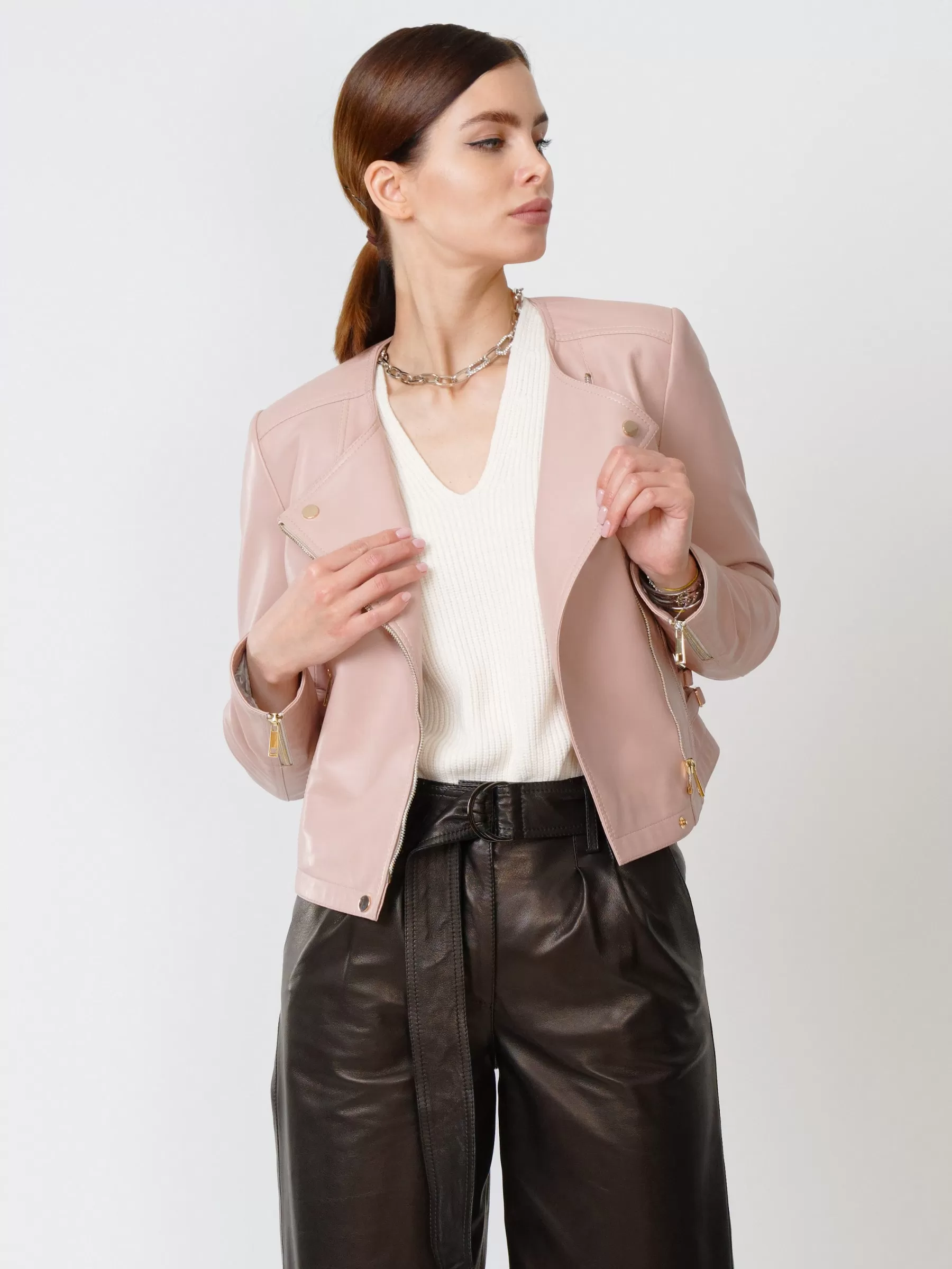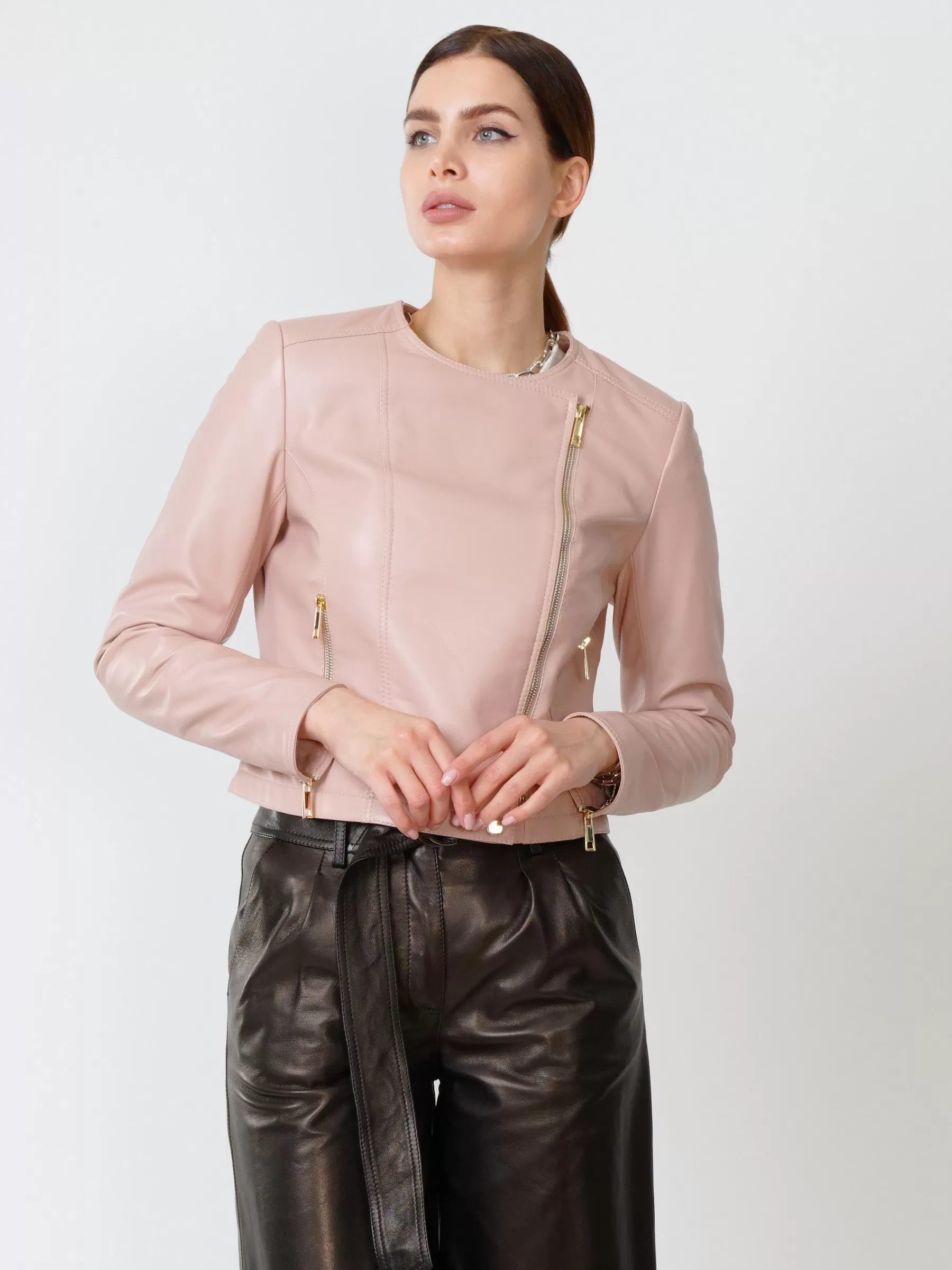 Кожаная женская куртка косуха 389, пудровая, размер 42, артикул 90910