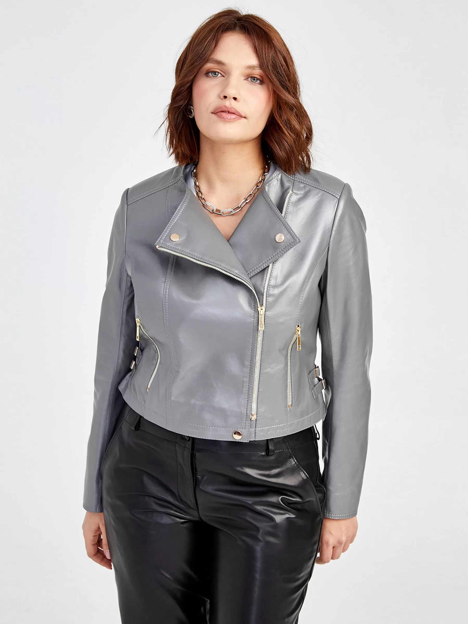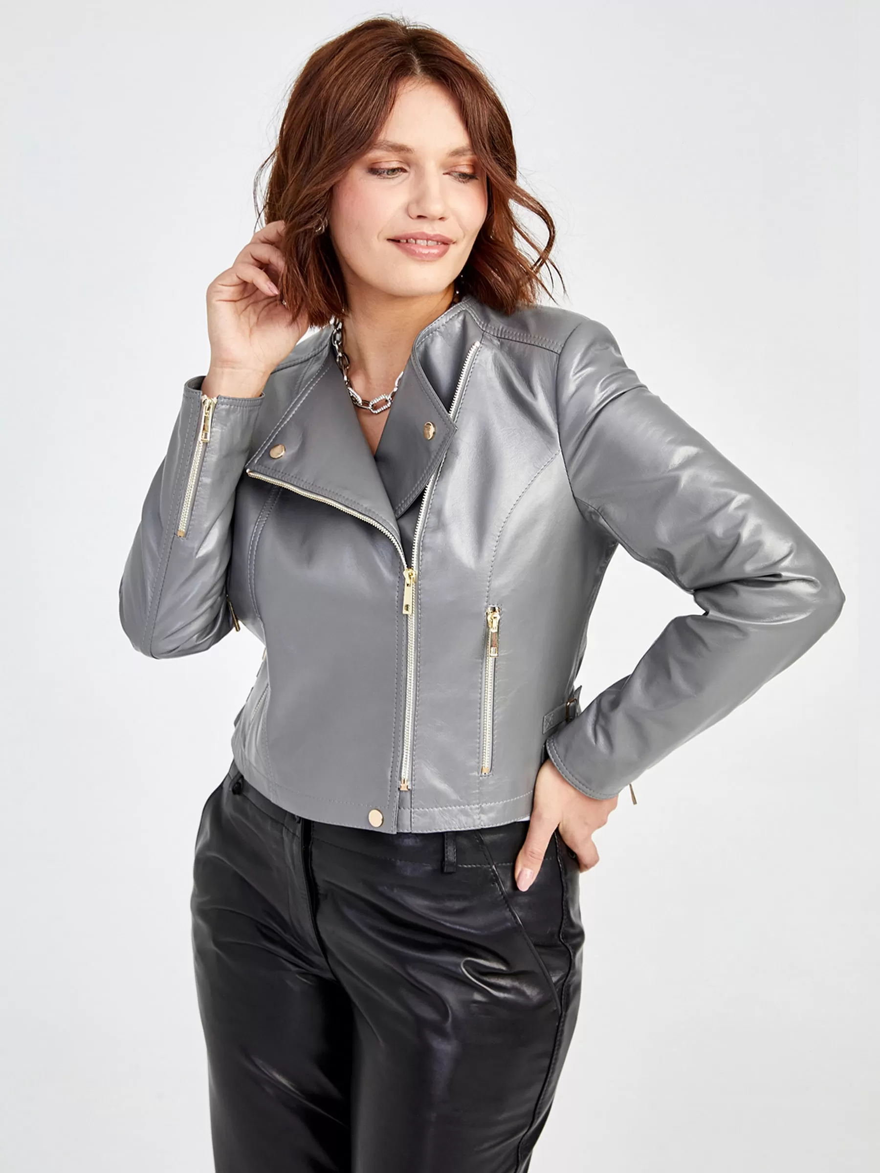 Кожаная женская куртка косуха 389, серая, размер 42, артикул 91550