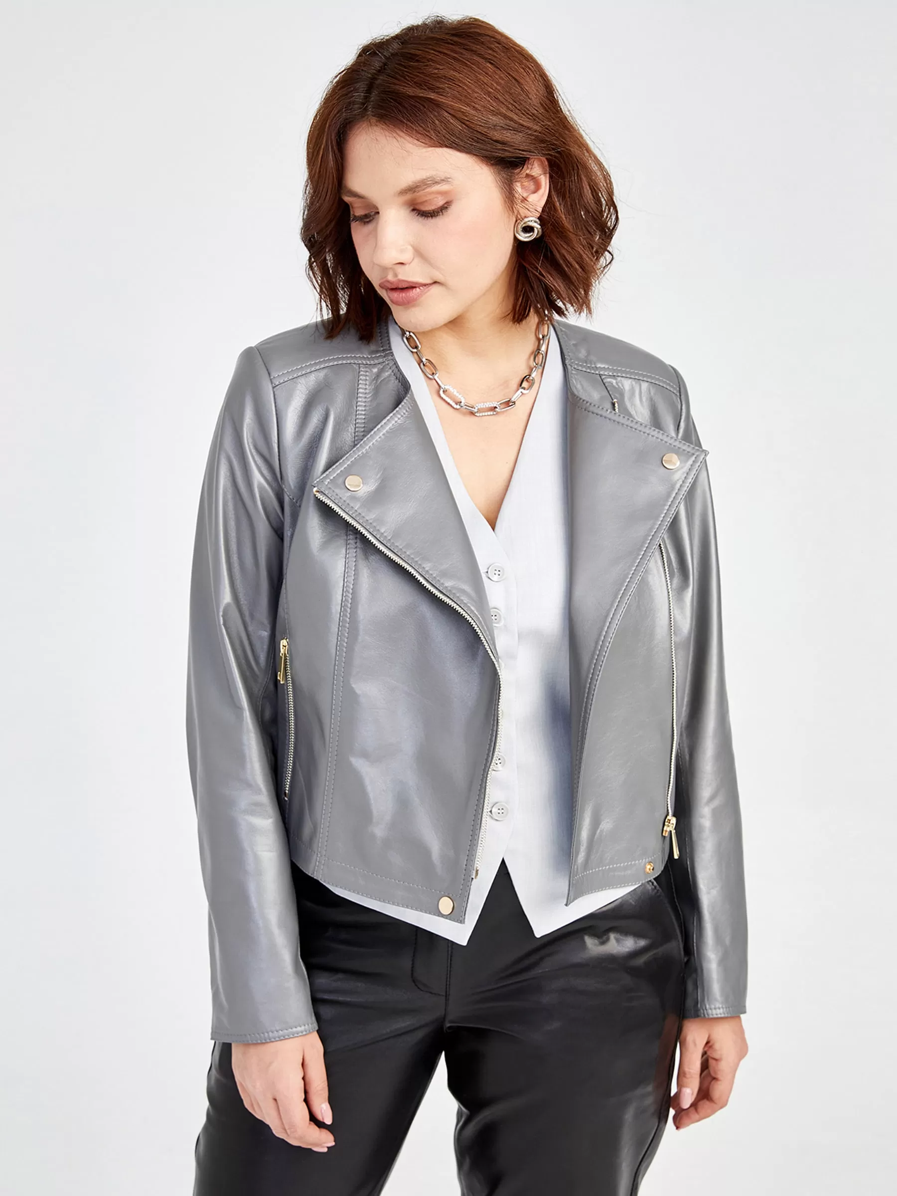 Товар кожаная женская куртка косуха 389, серая, размер 42, артикул 91550 выполнен из натуральной кожи с застежкой молния. Рассчитан на сезон: весна-лето. Длина изделия 45 см, силуэт полуприлегающий.