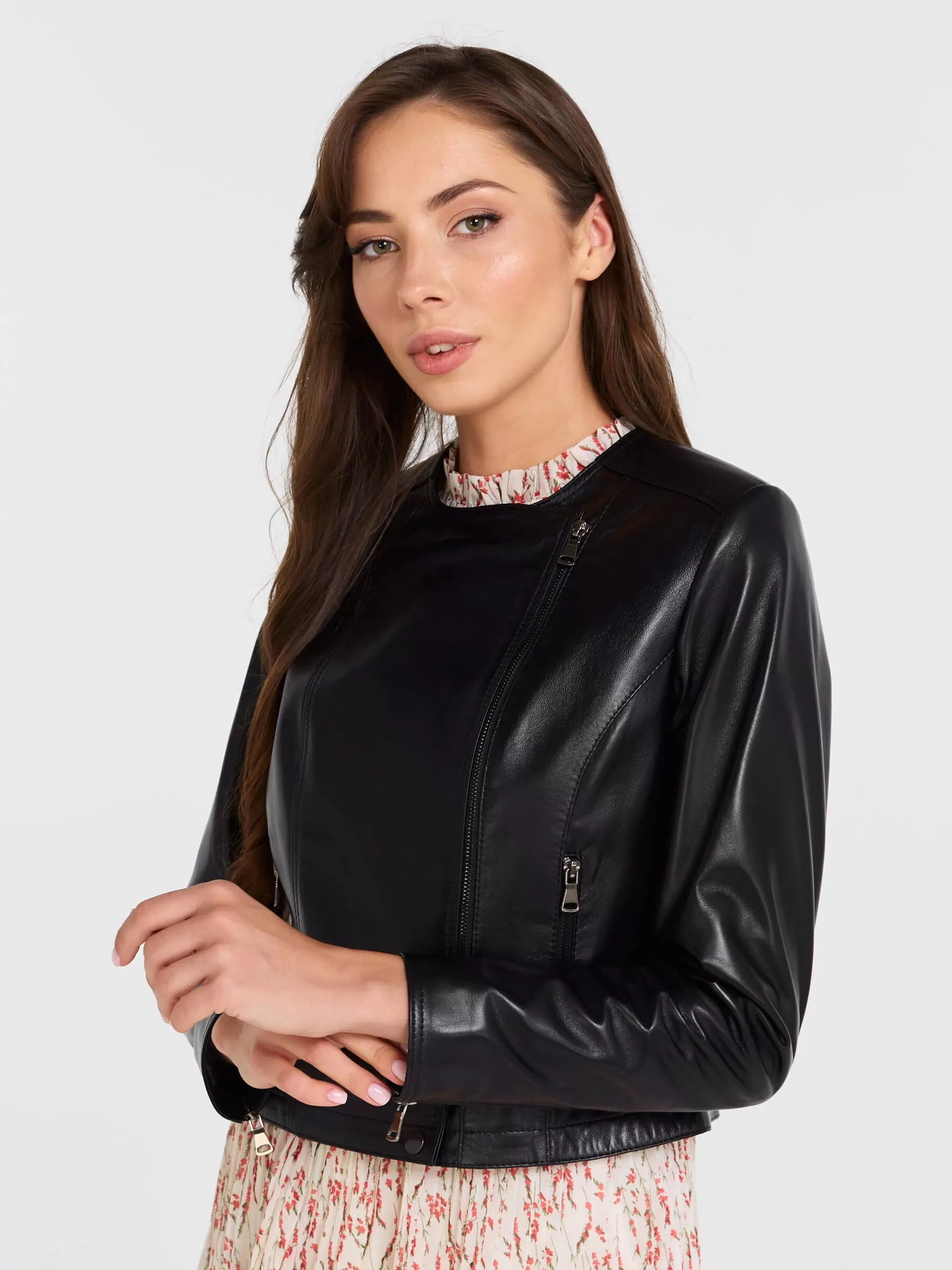Эта женская косуха из мягчайшей натуральной кожи PrimoVello — воплощение дерзкого шика: полуприлегающий силуэт на молнии без воротника идеально сидит благодаря регулируемым боковым патам, подчеркивающим фигуру. Втачной рукав и безупречная конструкция гарантируют комфорт и премиальное качество. Универсальный must-have для смелых образов — носите с черной водолазкой, рваными джинсами и кедами для повседневного бунтарства или с кожаной юбкой-миди и ботфортами для вечерного драйва.