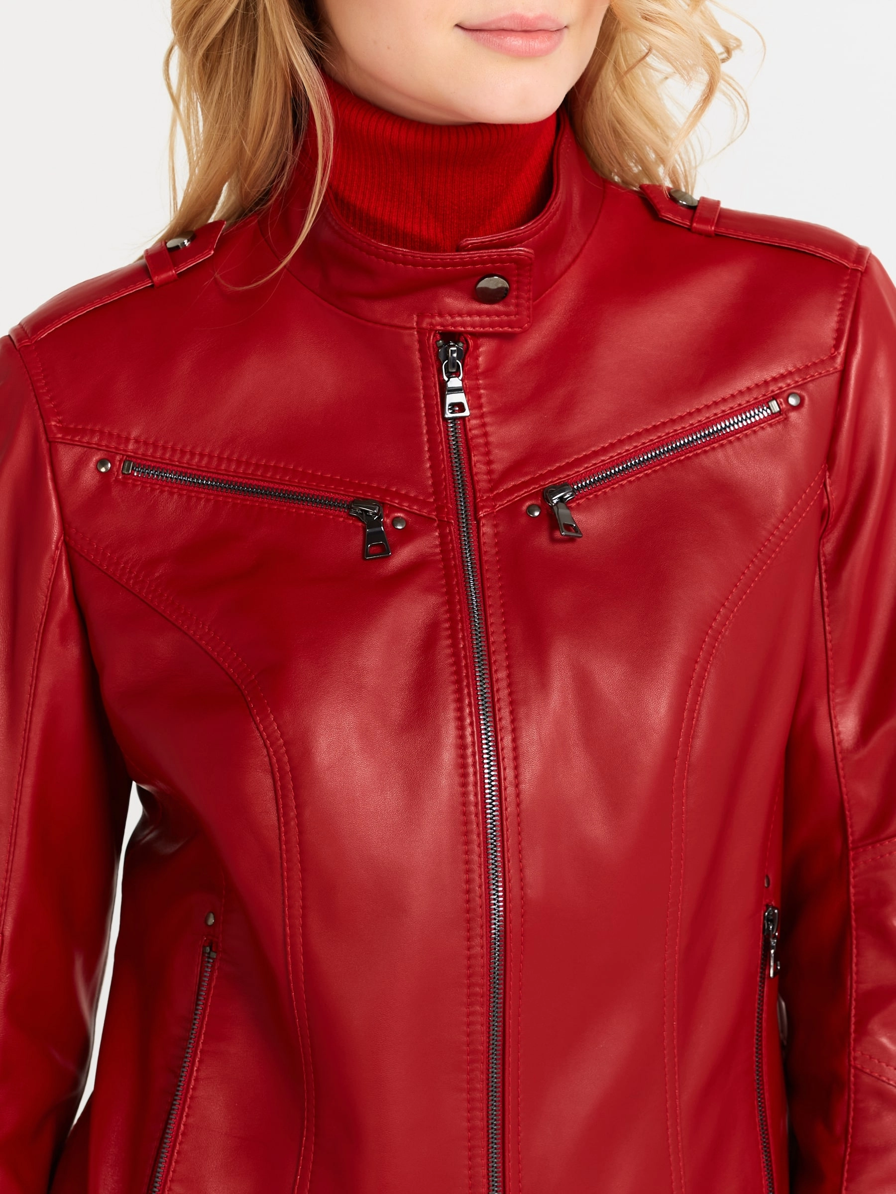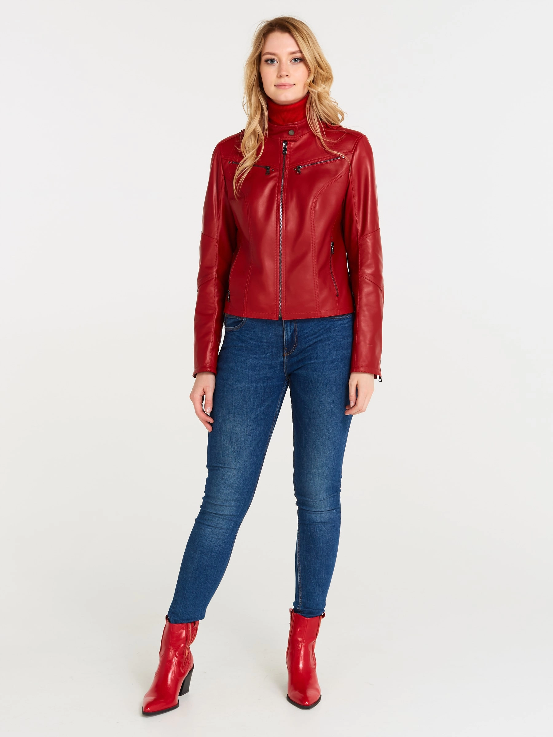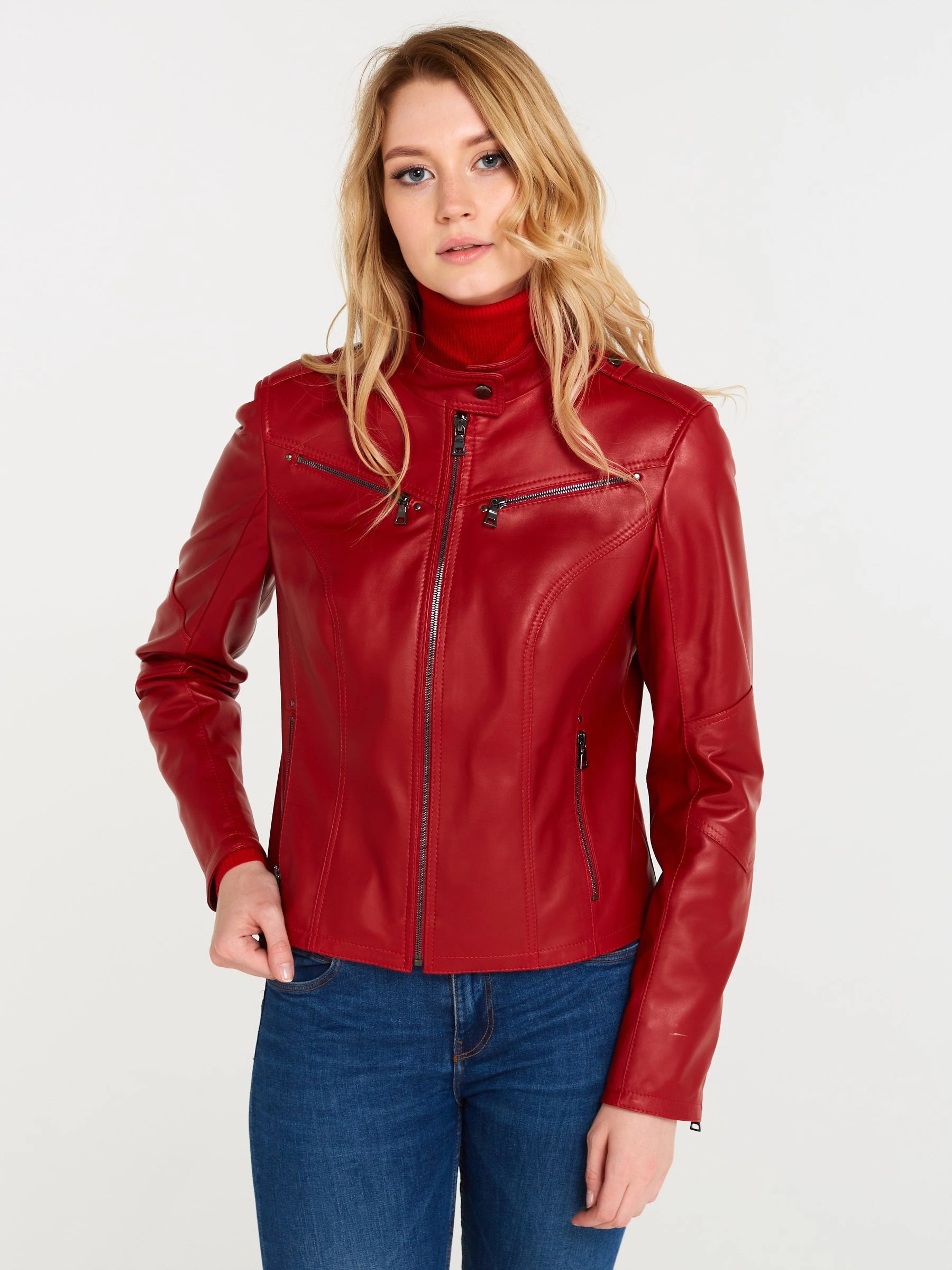 Товар кожаная куртка женская 399, красная, размер 48, артикул 18370 выполнен из натуральной кожи с застежкой молния. Рассчитан на сезон: весна-лето. Длина изделия 51 см, силуэт приталенный .