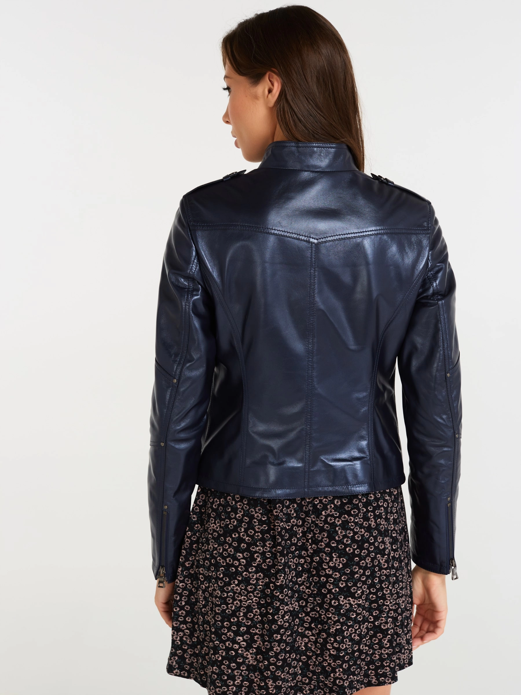 Кожаная куртка женская 399, синий перламутр, размер 46, артикул 90410