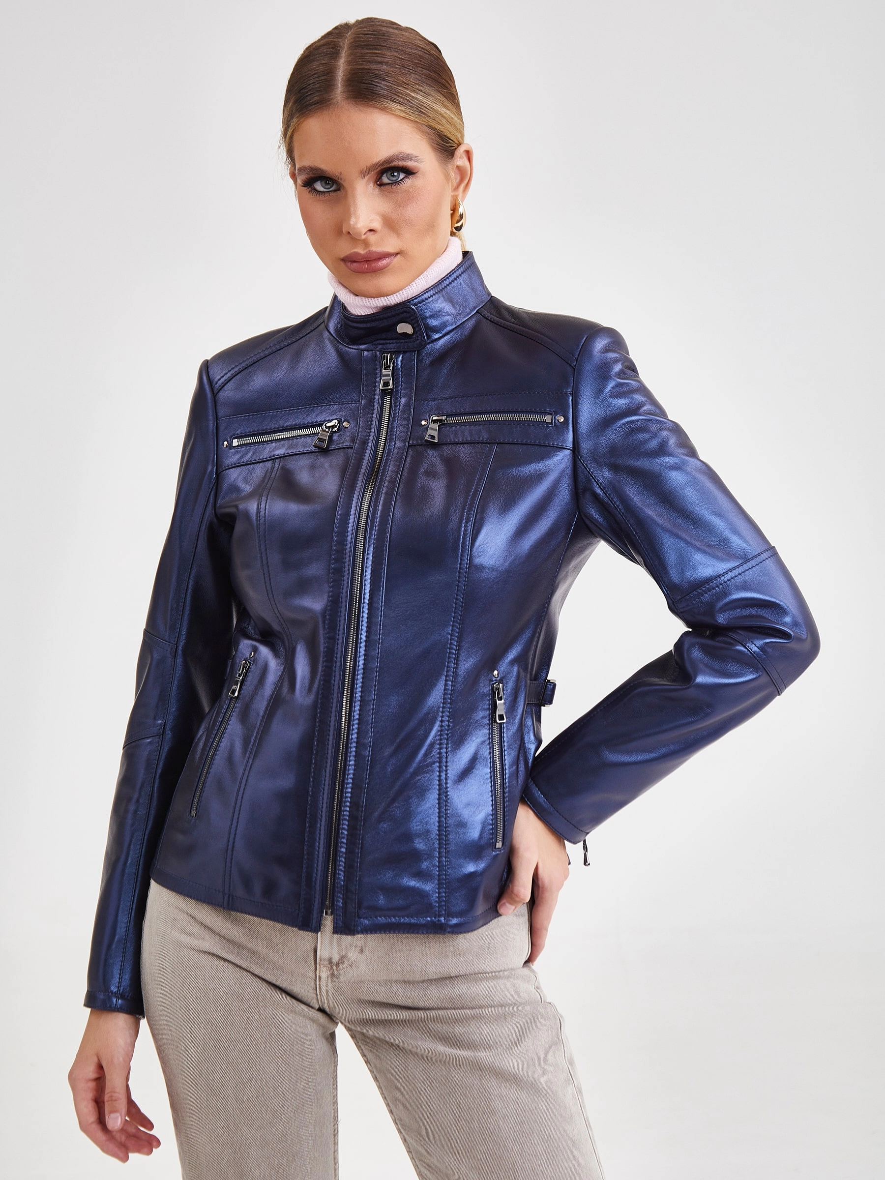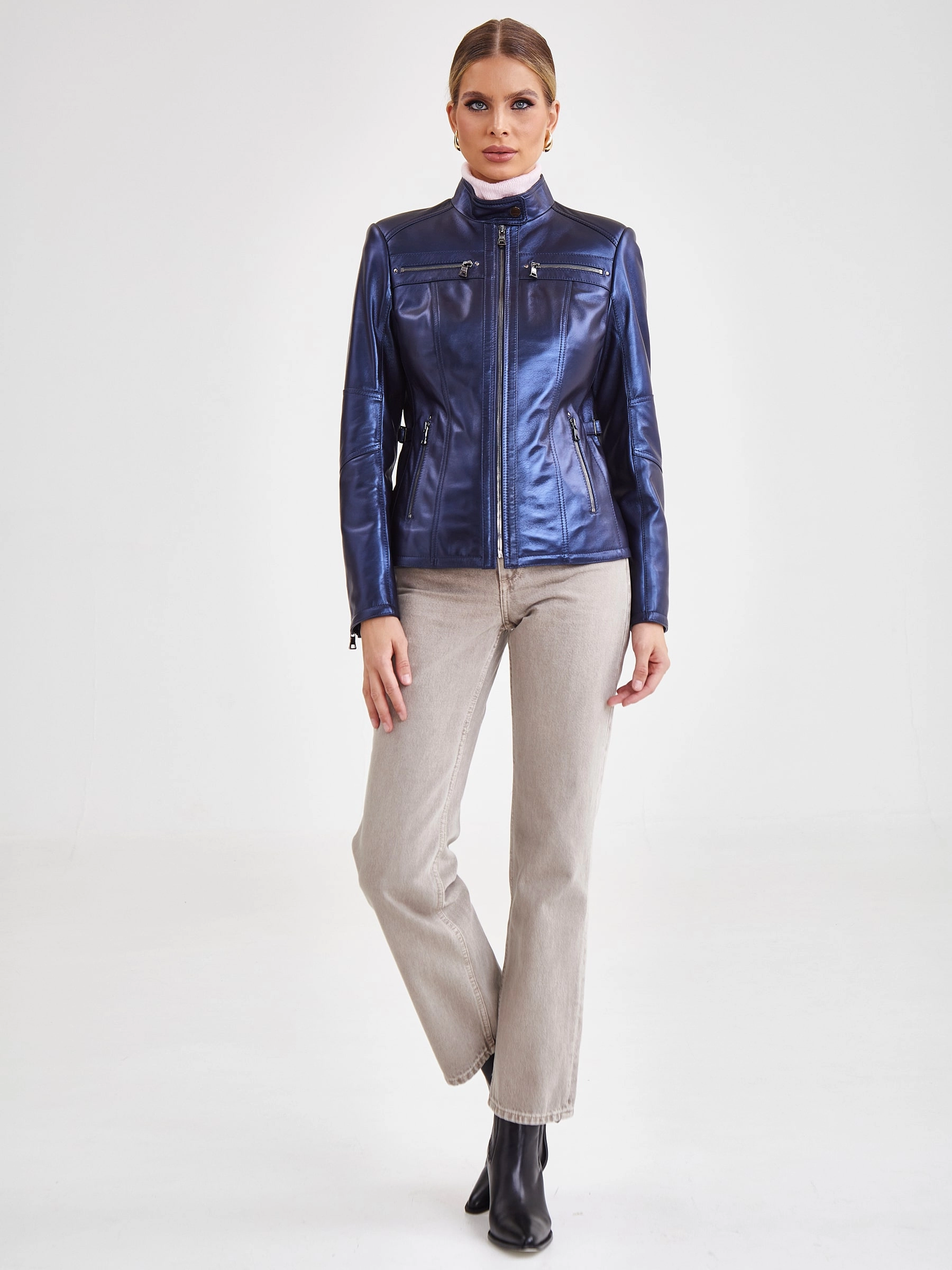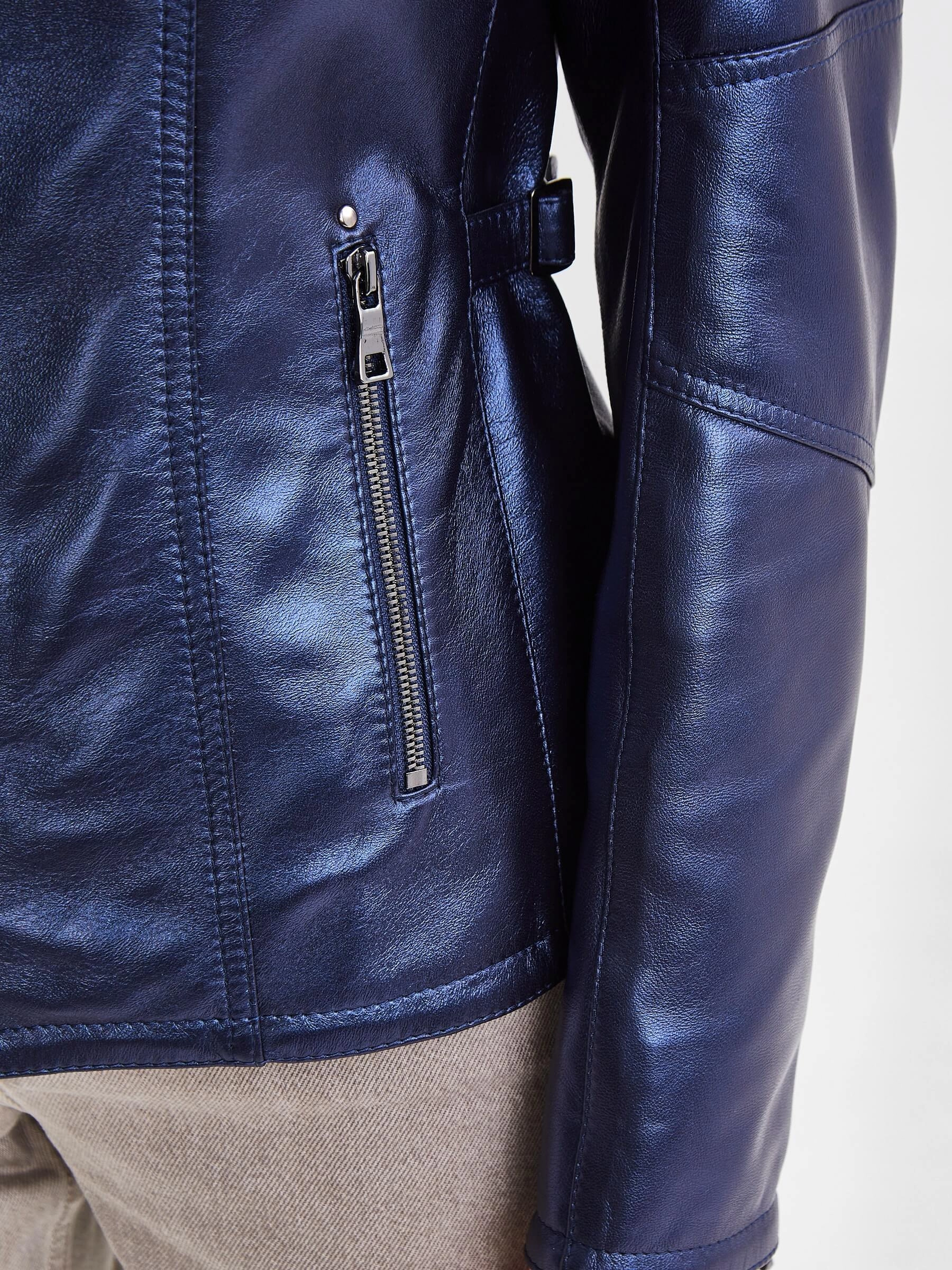 Товар кожаная утепленная женская куртка 301ш, синий перламутр, размер 46, артикул 23680 выполнен из натуральной кожи с застежкой молния. Рассчитан на сезон: демисезон. Длина изделия 57 см, силуэт полуприлегающий.