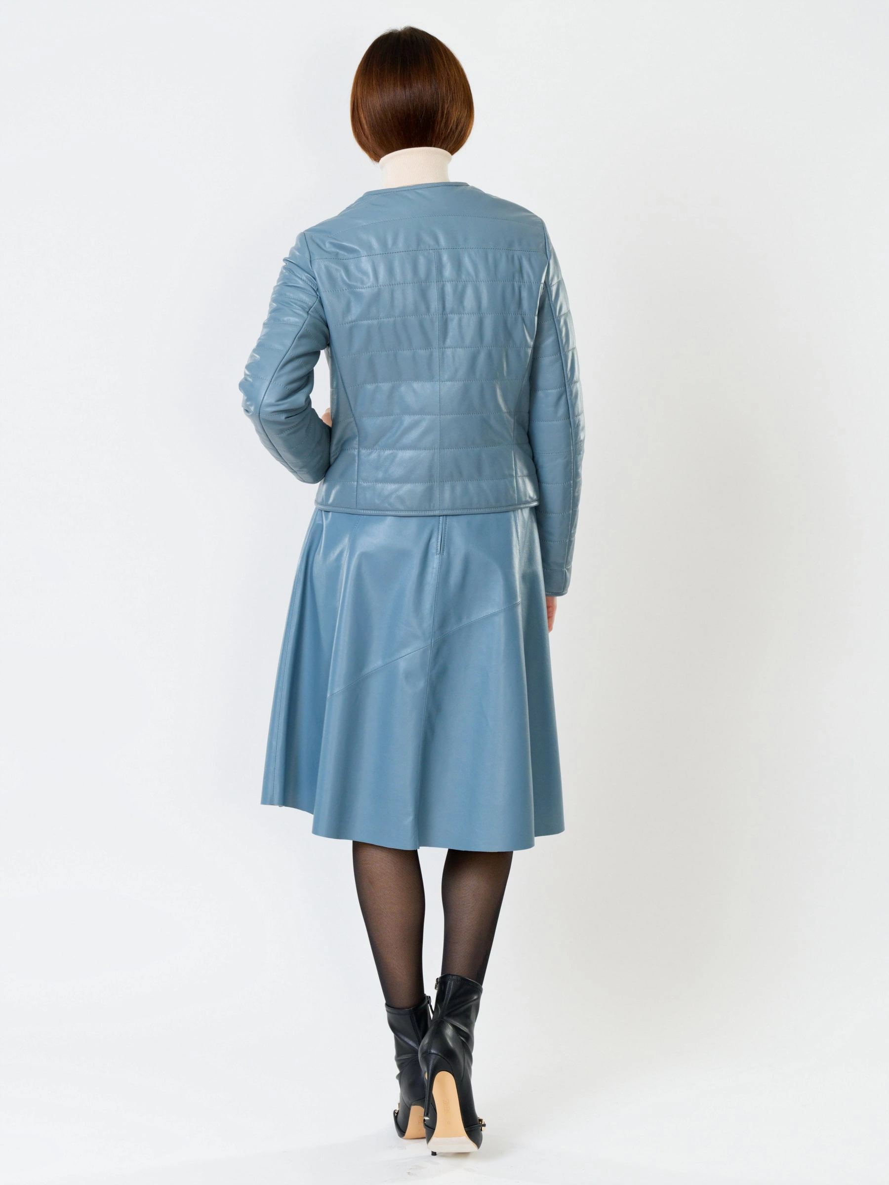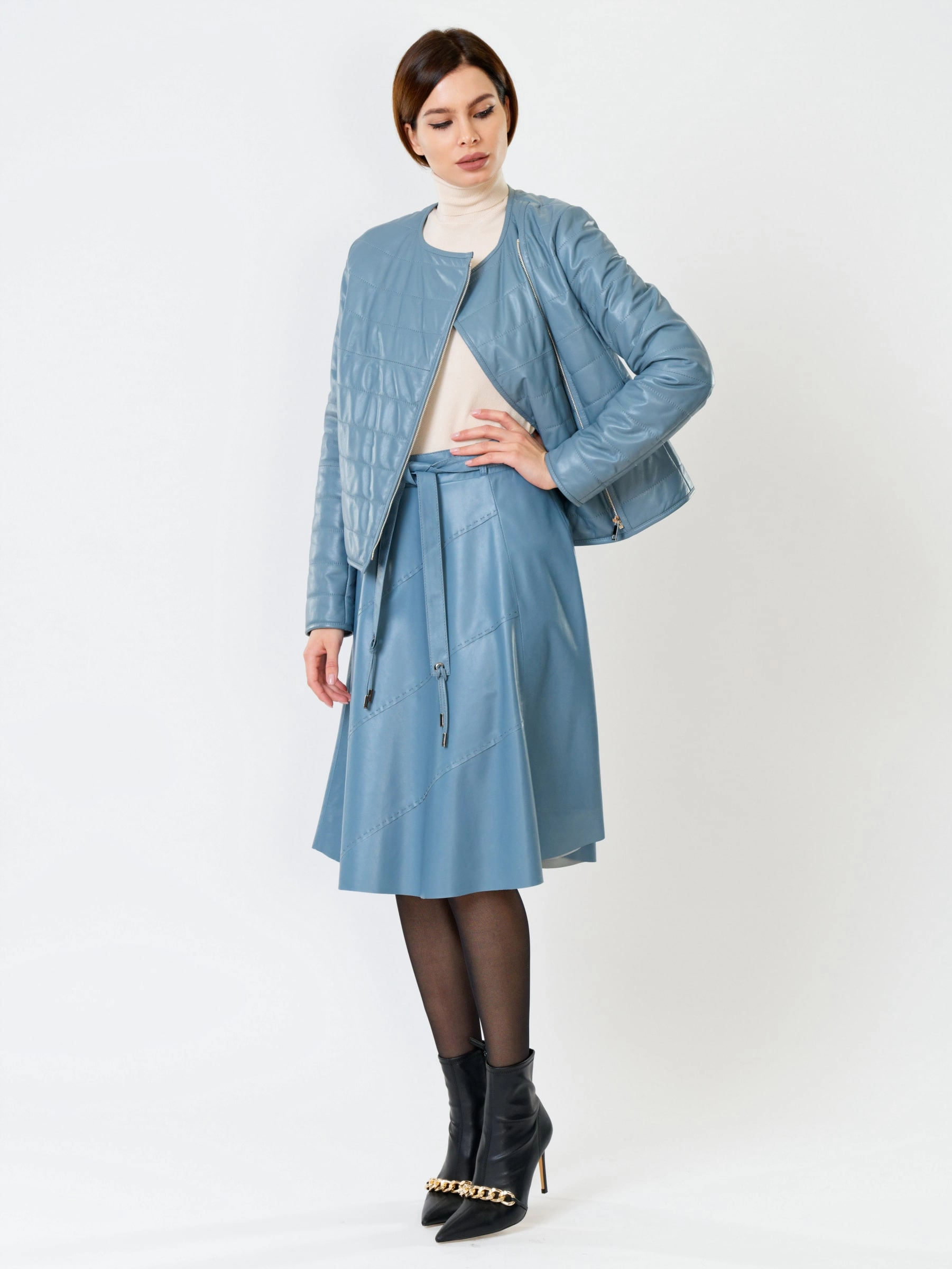 Утепленная кожаная женская косуха без воротника 306, голубая, размер 46, артикул 91031