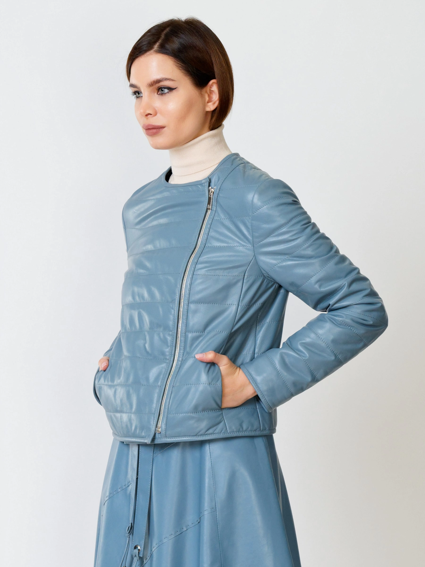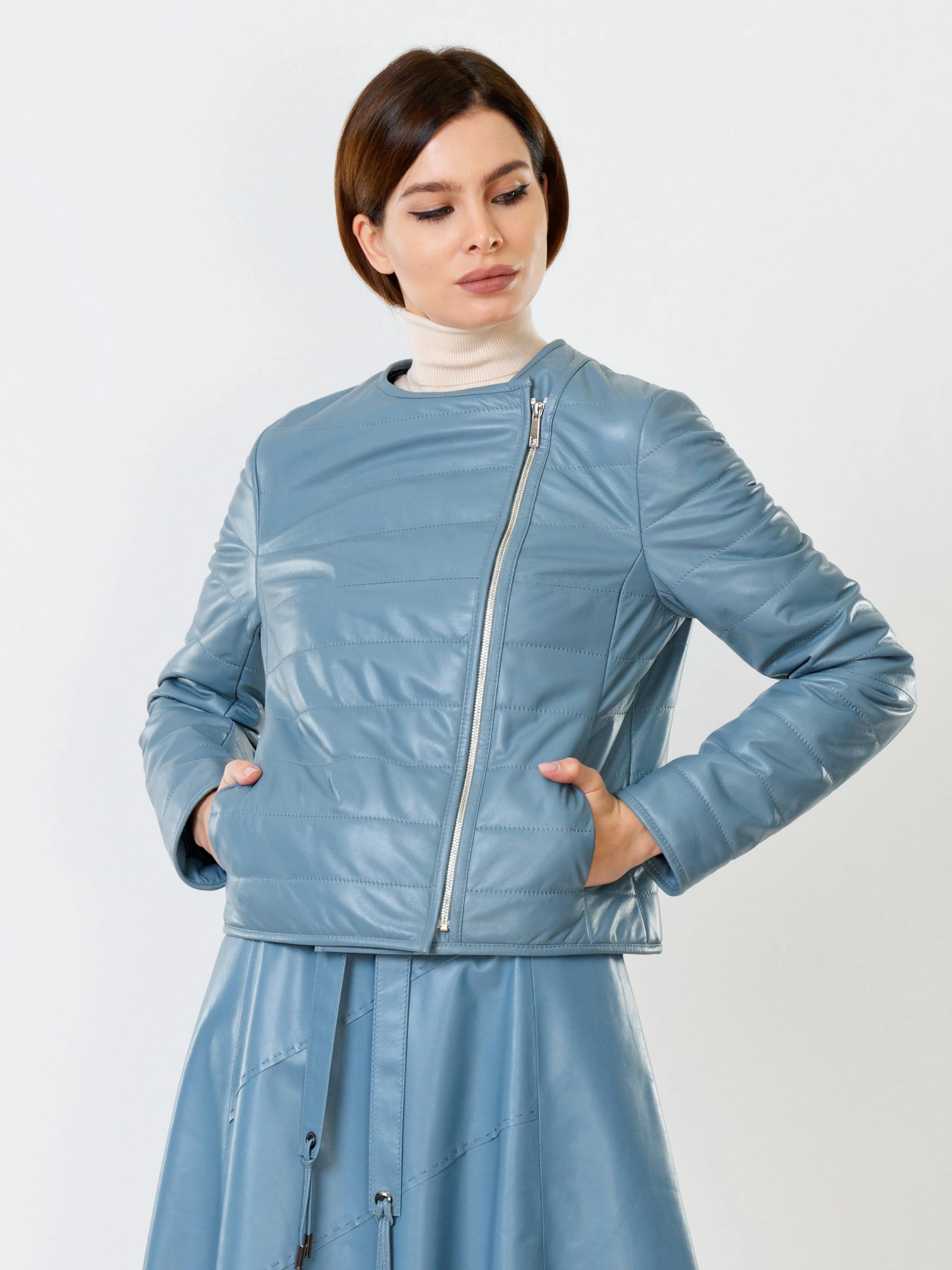 Товар утепленная кожаная женская косуха без воротника 306, голубая, размер 46, артикул 91031 выполнен из натуральной кожи с застежкой молния. Рассчитан на сезон: демисезон. Длина изделия 53 см, силуэт полуприлегающий.