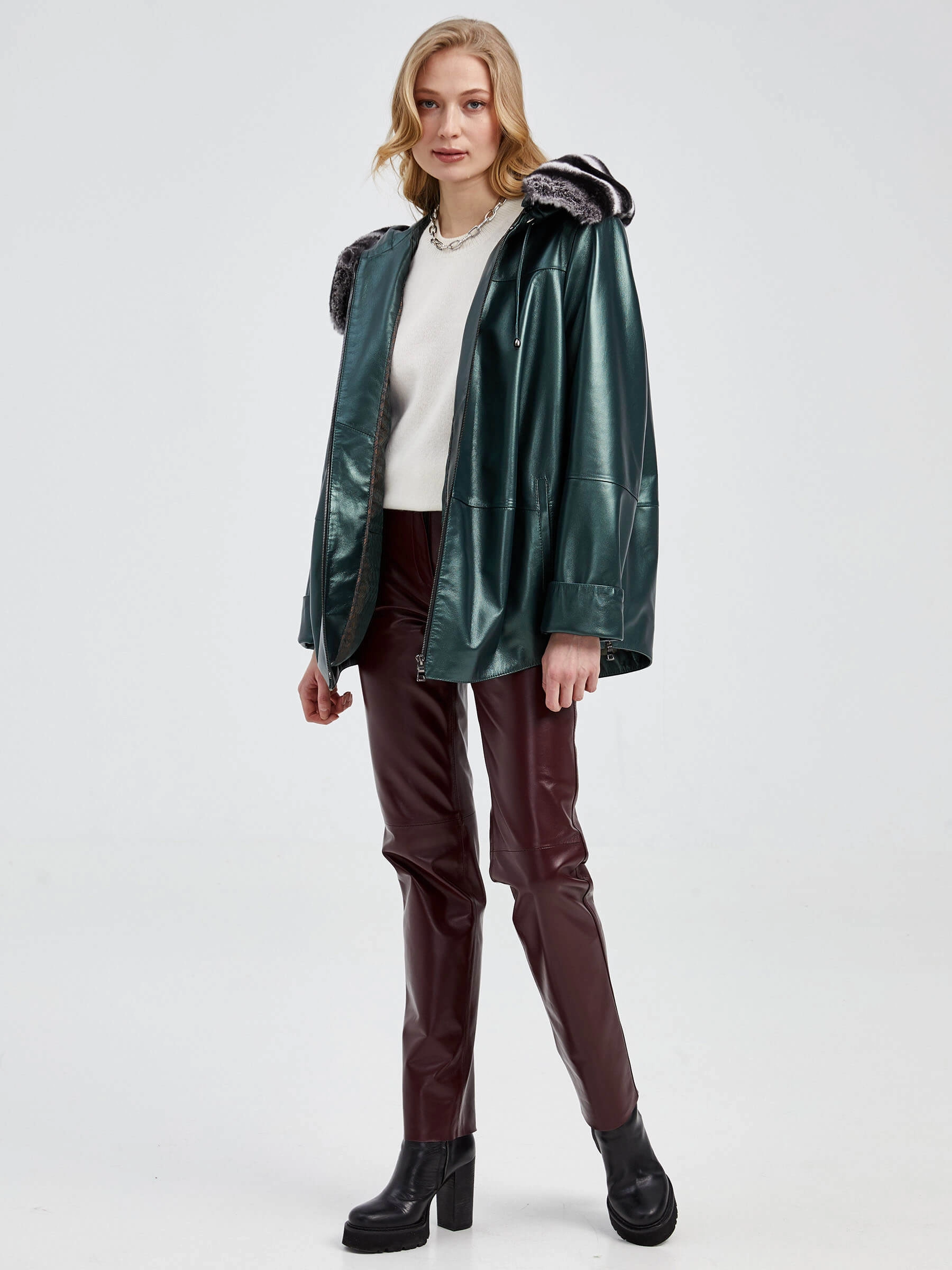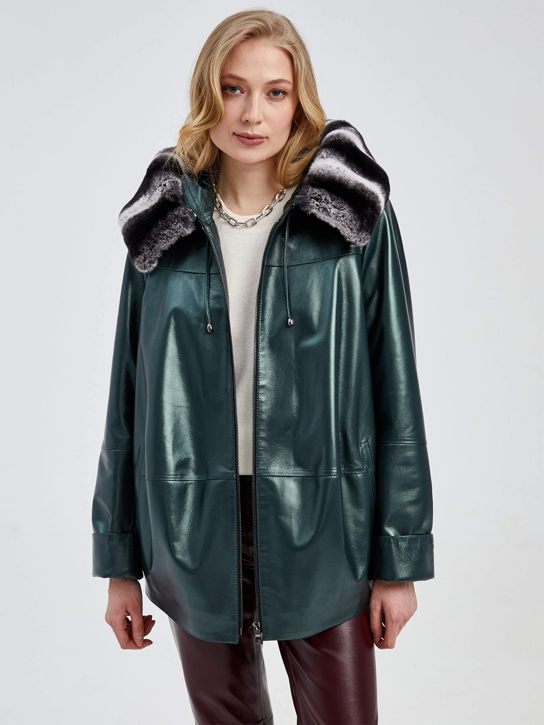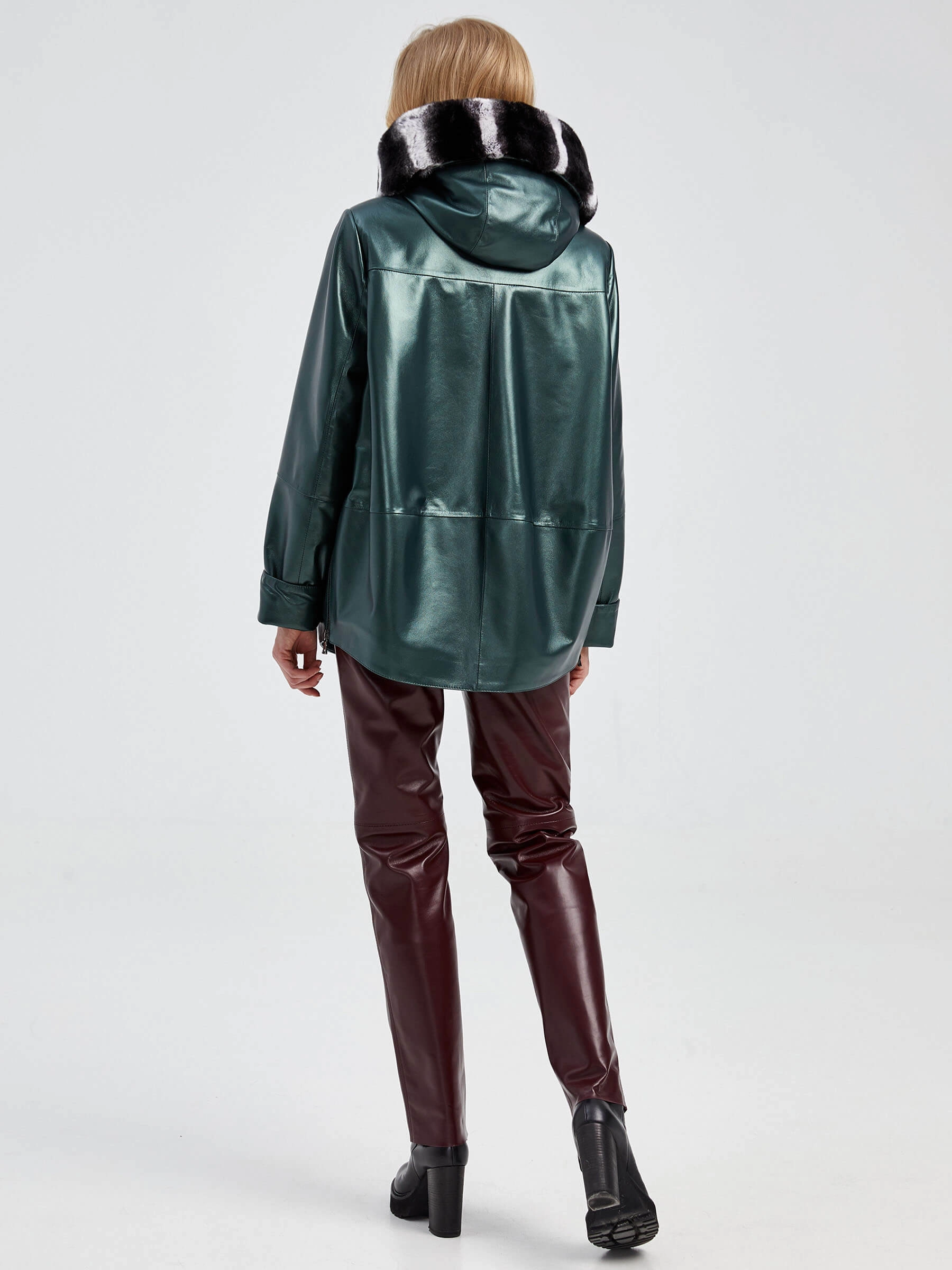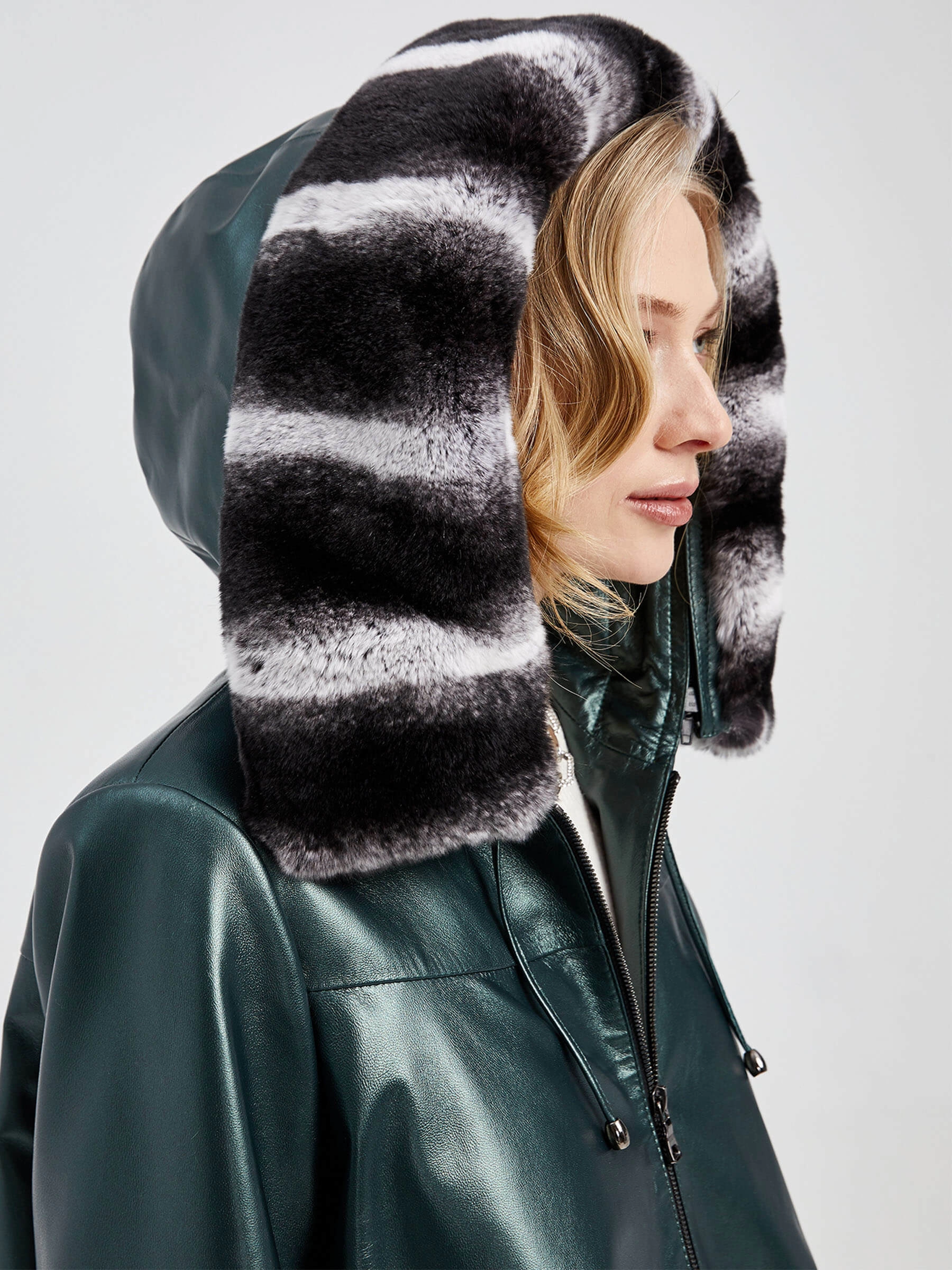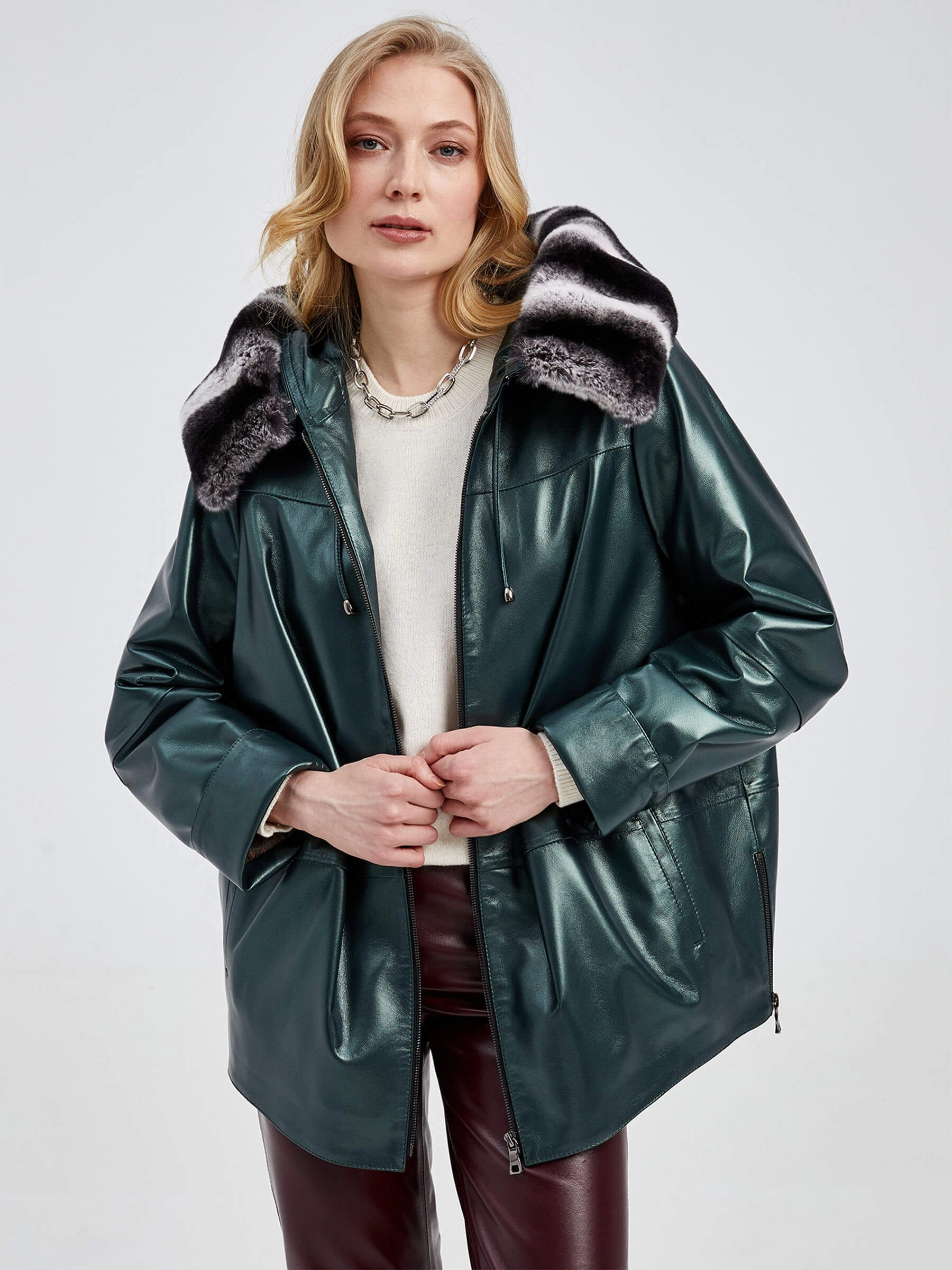 Кожаная женская куртка с капюшоном и мехом "рекса" 308уш, зеленый, размер 56, артикул 40500