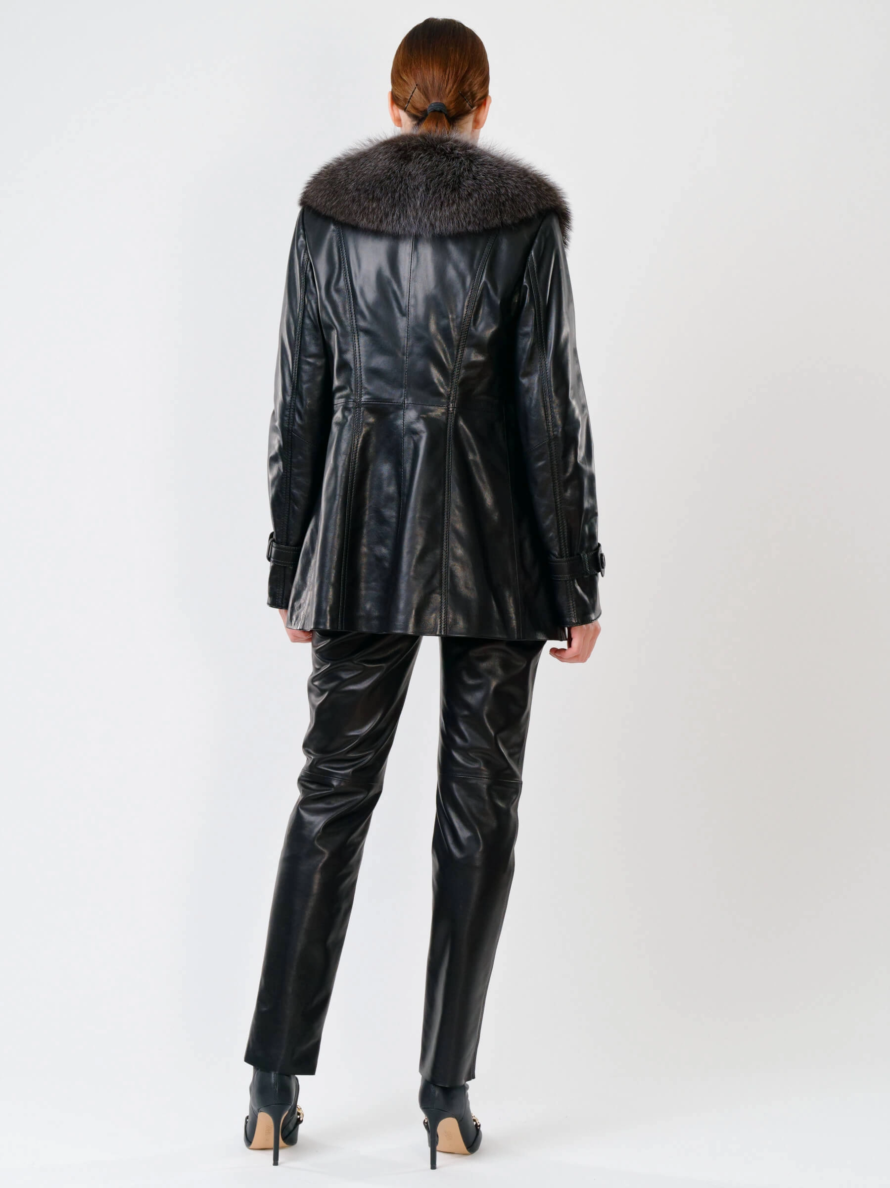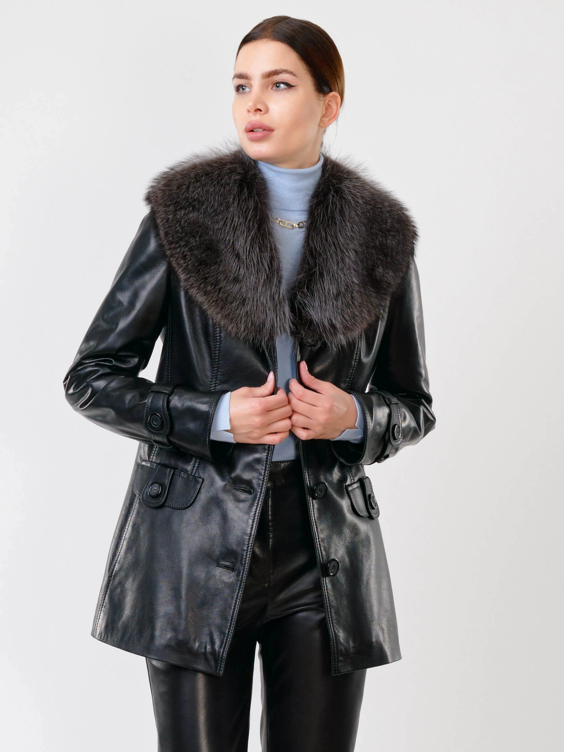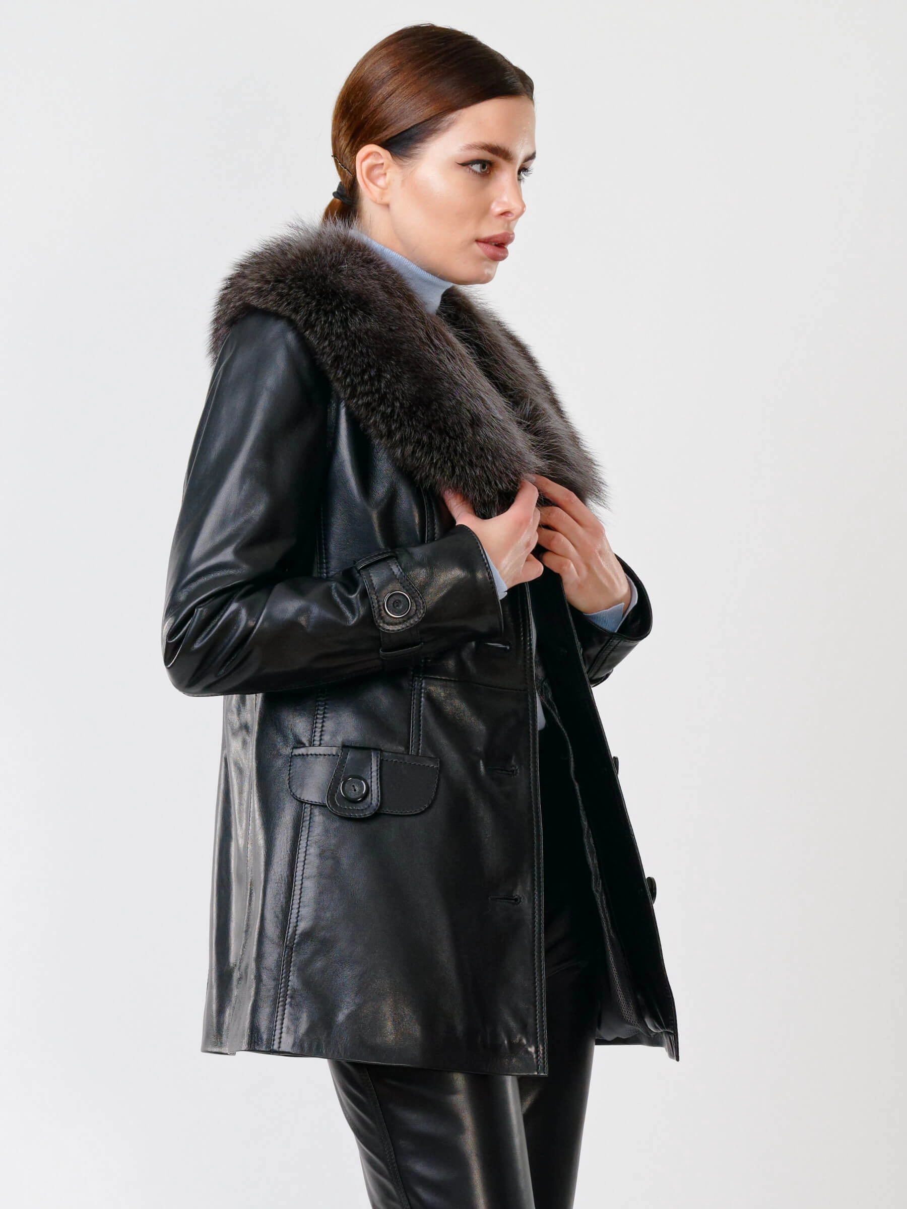 Роскошная утепленная женская куртка из натуральной кожи с эффектным мехом енота на съемном английском воротнике. Классический полуприлегающий силуэт длиной 77 см с втачными рукавами идеально садится по фигуре, подчеркивая талию длинным поясом-лентой. Застежка на пуговицы, удобные боковые карманы с клапанами и новейший утеплитель шерстепон гарантируют тепло, комфорт и великолепную свободу движений. Эта элегантная утепленная кожаная куртка на пуговицах станет универсальным акцентом вашего образа, идеально сочетаясь с джинсами, платьями, юбками и брюками любого стиля.