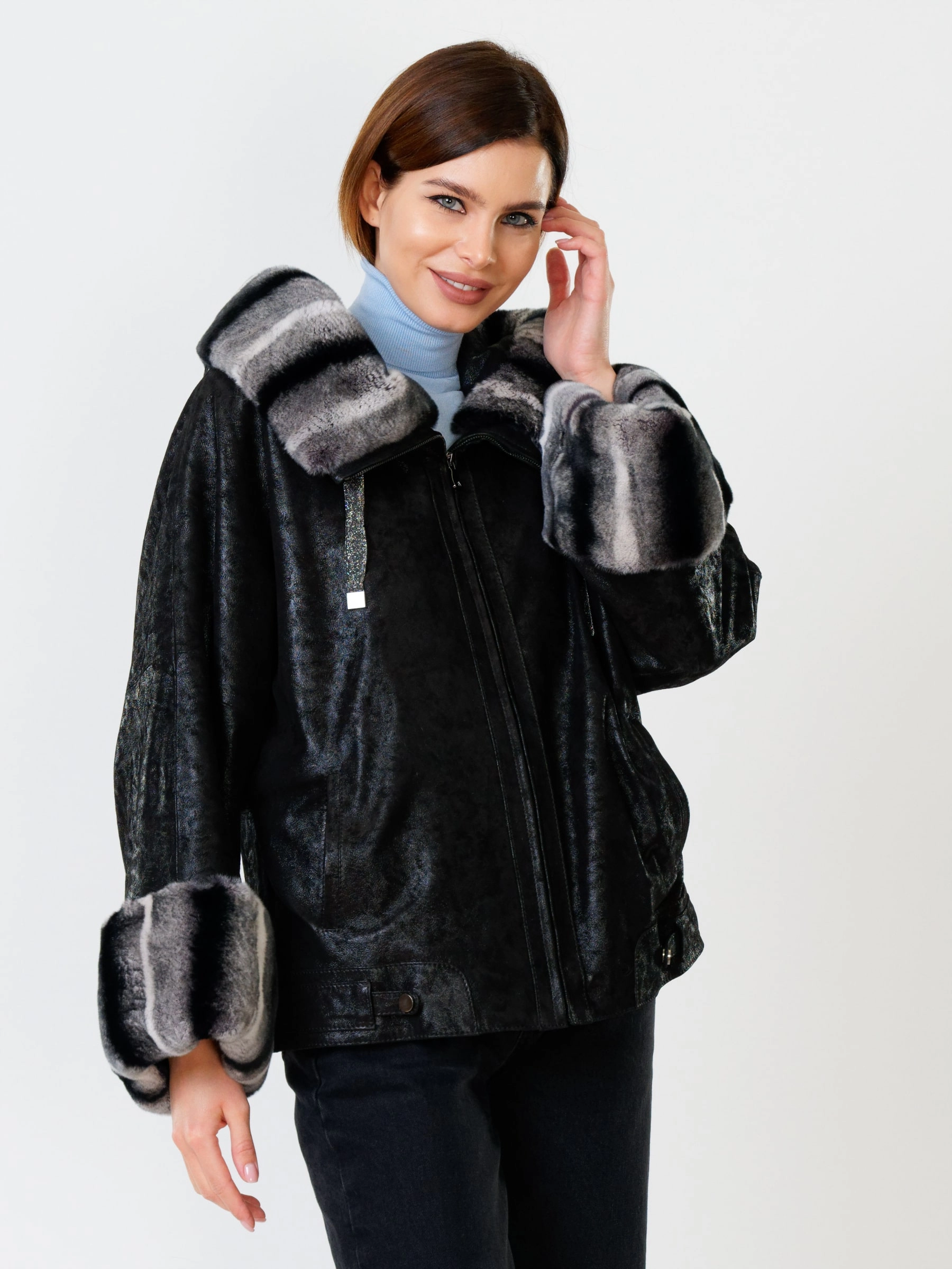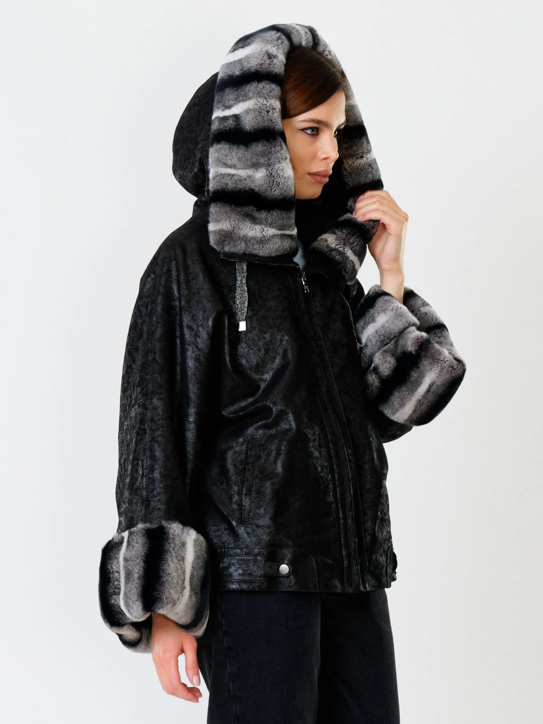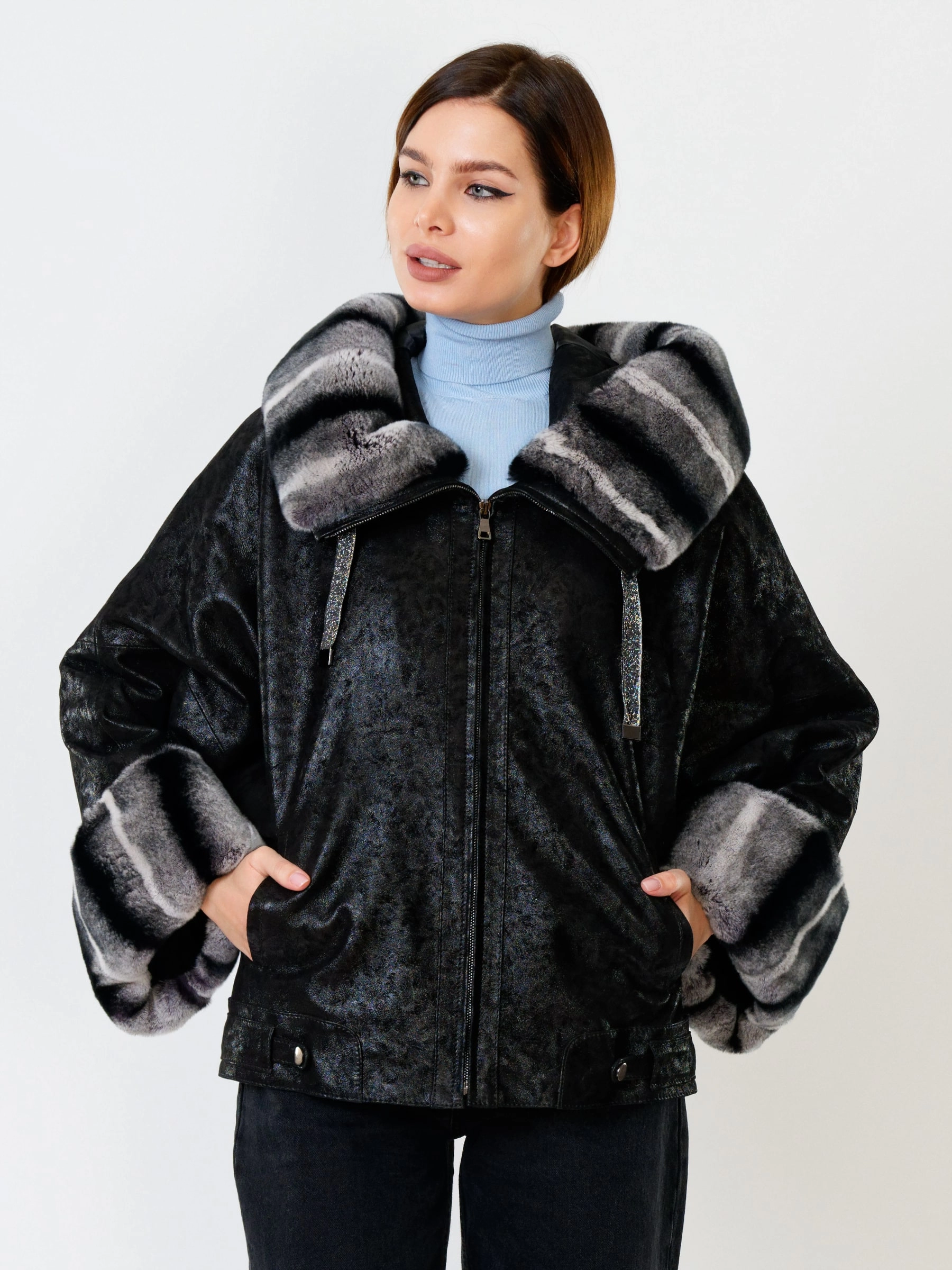 Стильная короткая куртка длиной 60 см из натуральной замши с теснением и отделкой из меха кролика рекс. Свободный силуэт и рукав реглан обеспечивают полную свободу движений. Несъёмный капюшон с меховой опушкой и защитное покрытие делают модель практичной для непогоды. Функциональные боковые карманы и утеплитель «шерстепон» с высоким содержанием шерсти надёжно сохраняют тепло. Сочетайте с кожаными леггинсами, объёмными джинсами или вязаными юбками миди для повседневного образа с намёком на роскошь!