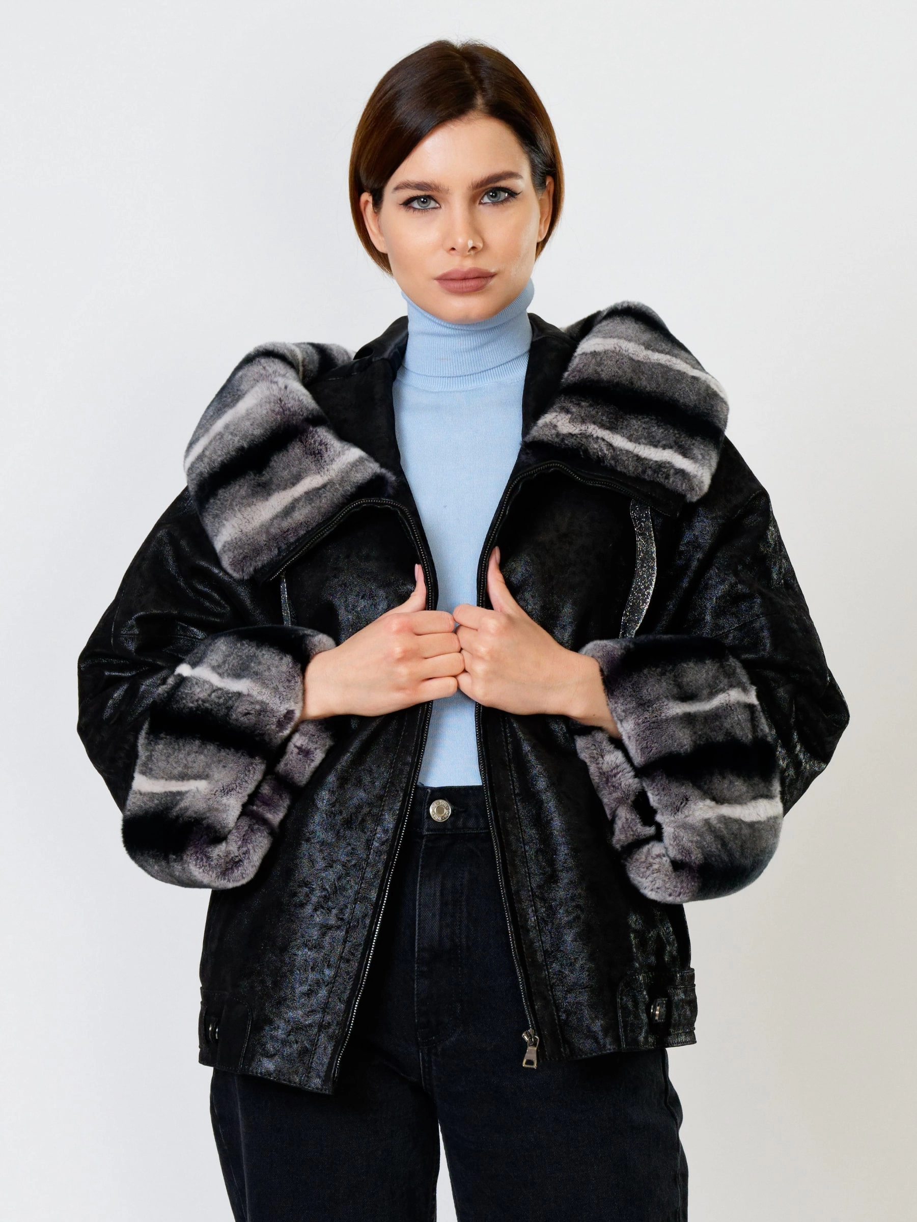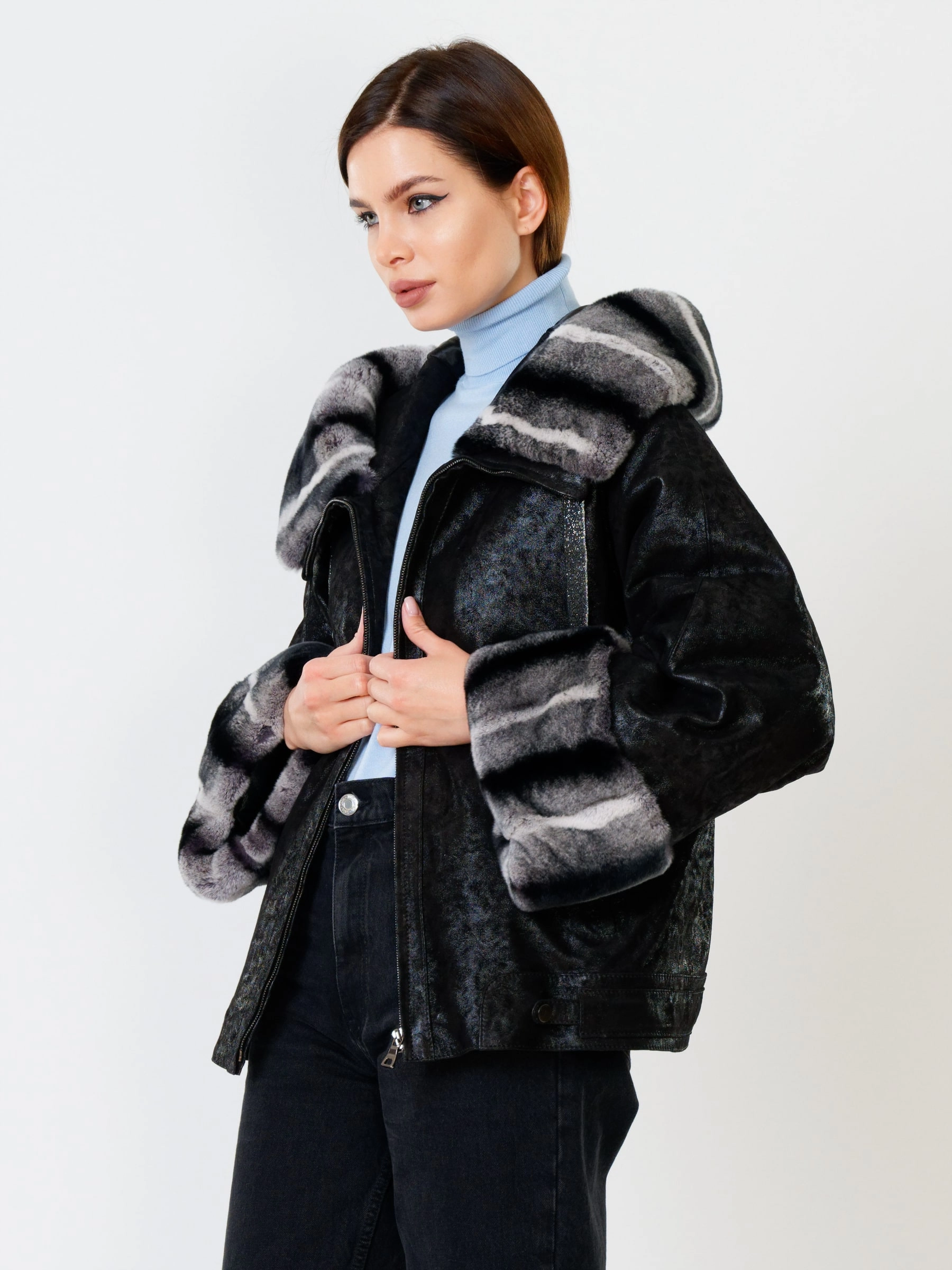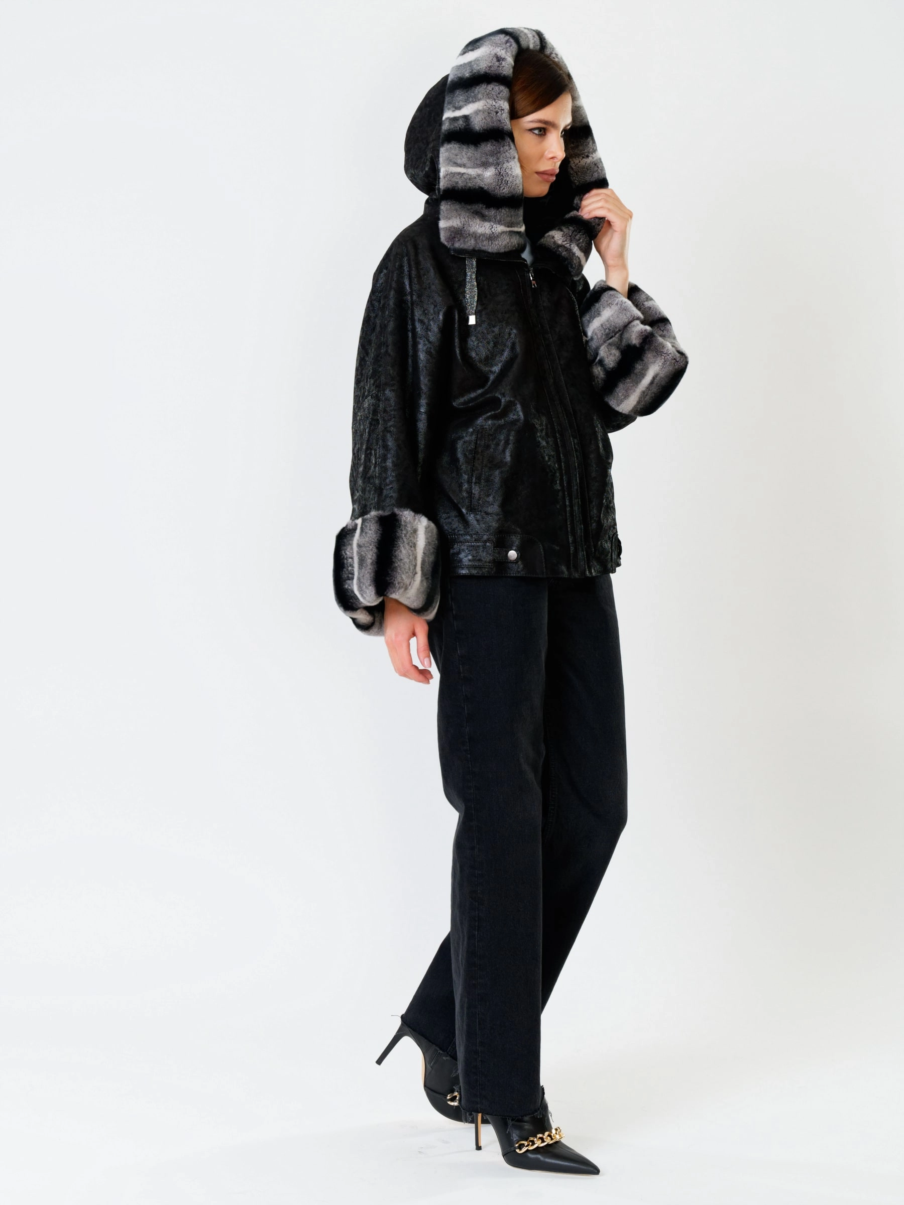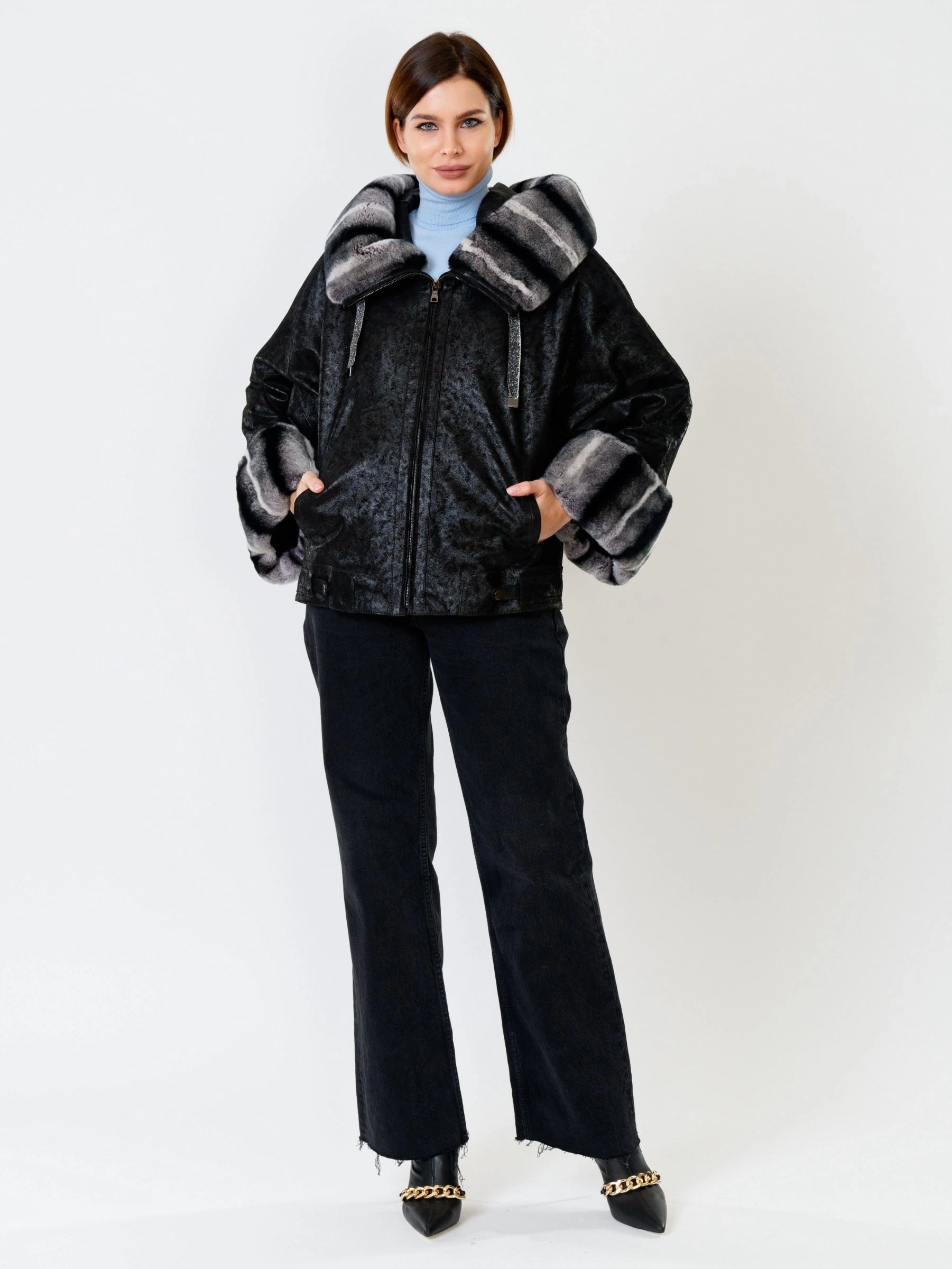 Стильная короткая куртка длиной 60 см из натуральной замши с теснением и отделкой из меха кролика рекс. Свободный силуэт и рукав реглан обеспечивают полную свободу движений. Несъёмный капюшон с меховой опушкой и защитное покрытие делают модель практичной для непогоды. Функциональные боковые карманы и утеплитель «шерстепон» с высоким содержанием шерсти надёжно сохраняют тепло. Сочетайте с кожаными леггинсами, объёмными джинсами или вязаными юбками миди для повседневного образа с намёком на роскошь!