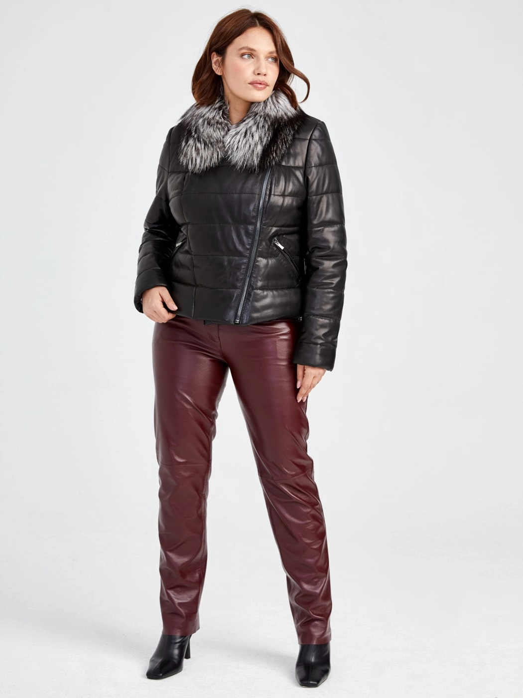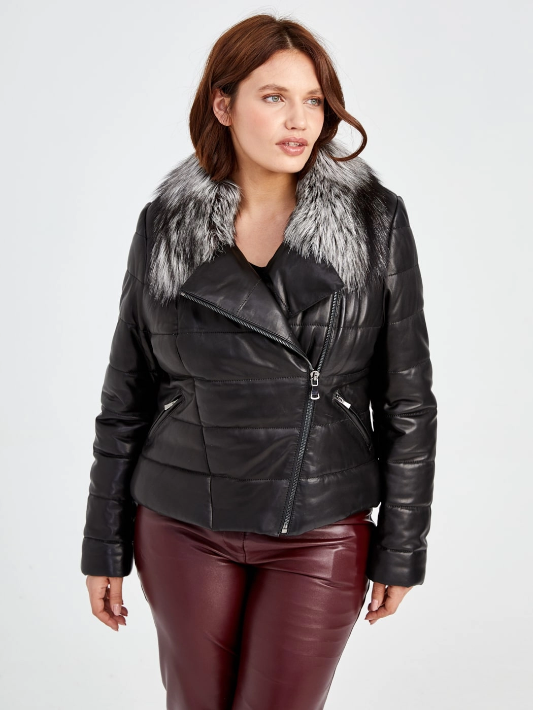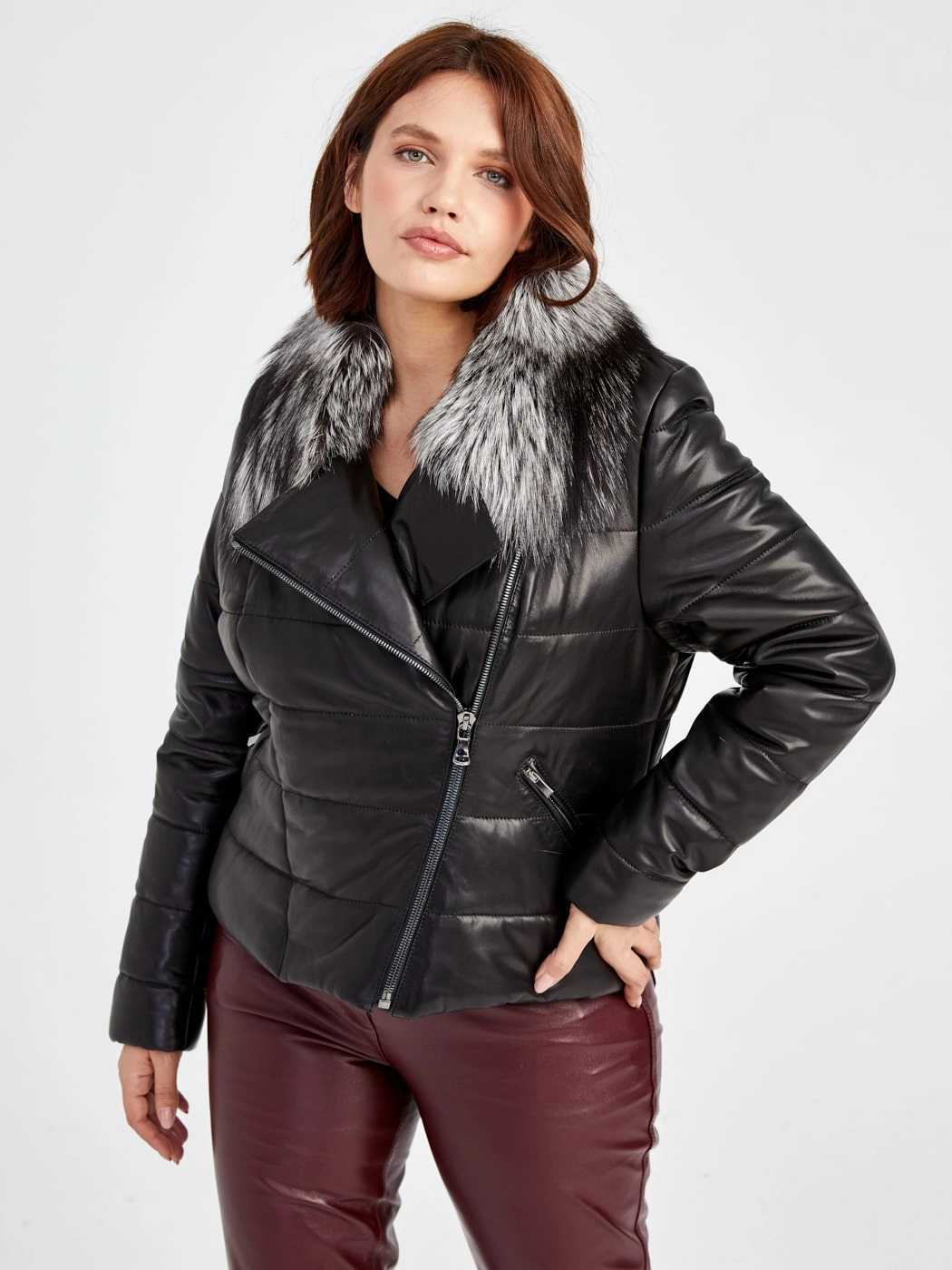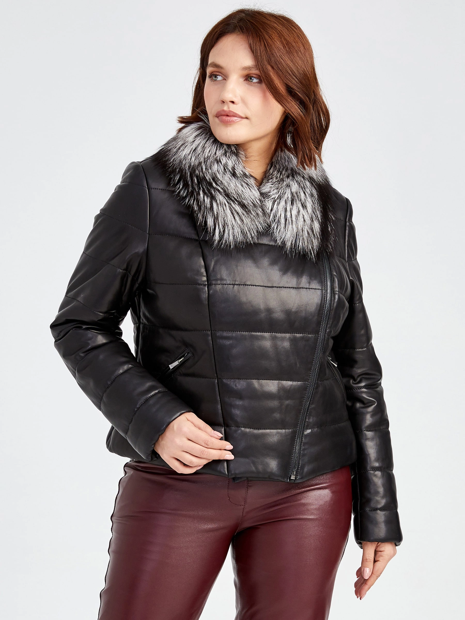 Утеплённая куртка из натуральной кожи на молнии с роскошным воротником из меха чернобурки и спортивным силуэтом, модель с отложным воротником, комбинированной текстурой плотной плащёвки и удобными карманами на молнии. Совет стилиста: сочетайте с однотонным свитером, кожаными леггинсами и грубыми ботинками для бунтарского образа или с узкими джинсами и высокими сапогами для яркого повседневного лука.