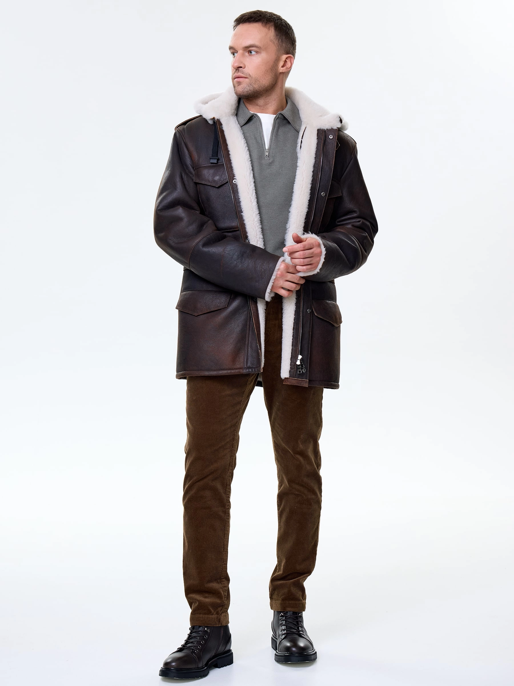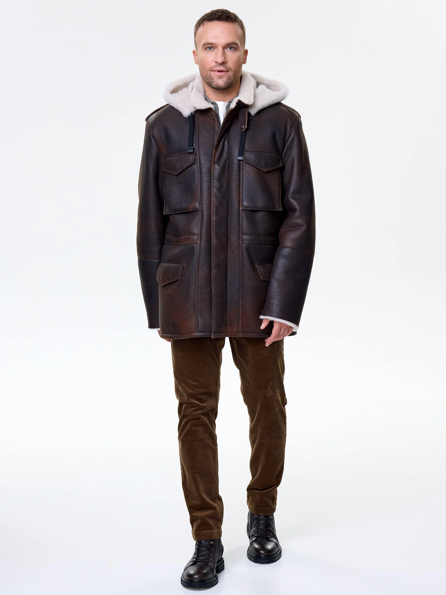Товар мужское полупальто из натуральной овчины с капюшоном премиум класса 433, коричневая, размер 48, артикул 72000 выполнен из овчина "мерино" с застежкой молния. Рассчитан на сезон: осень-зима. Длина изделия 81 см, силуэт прямой.