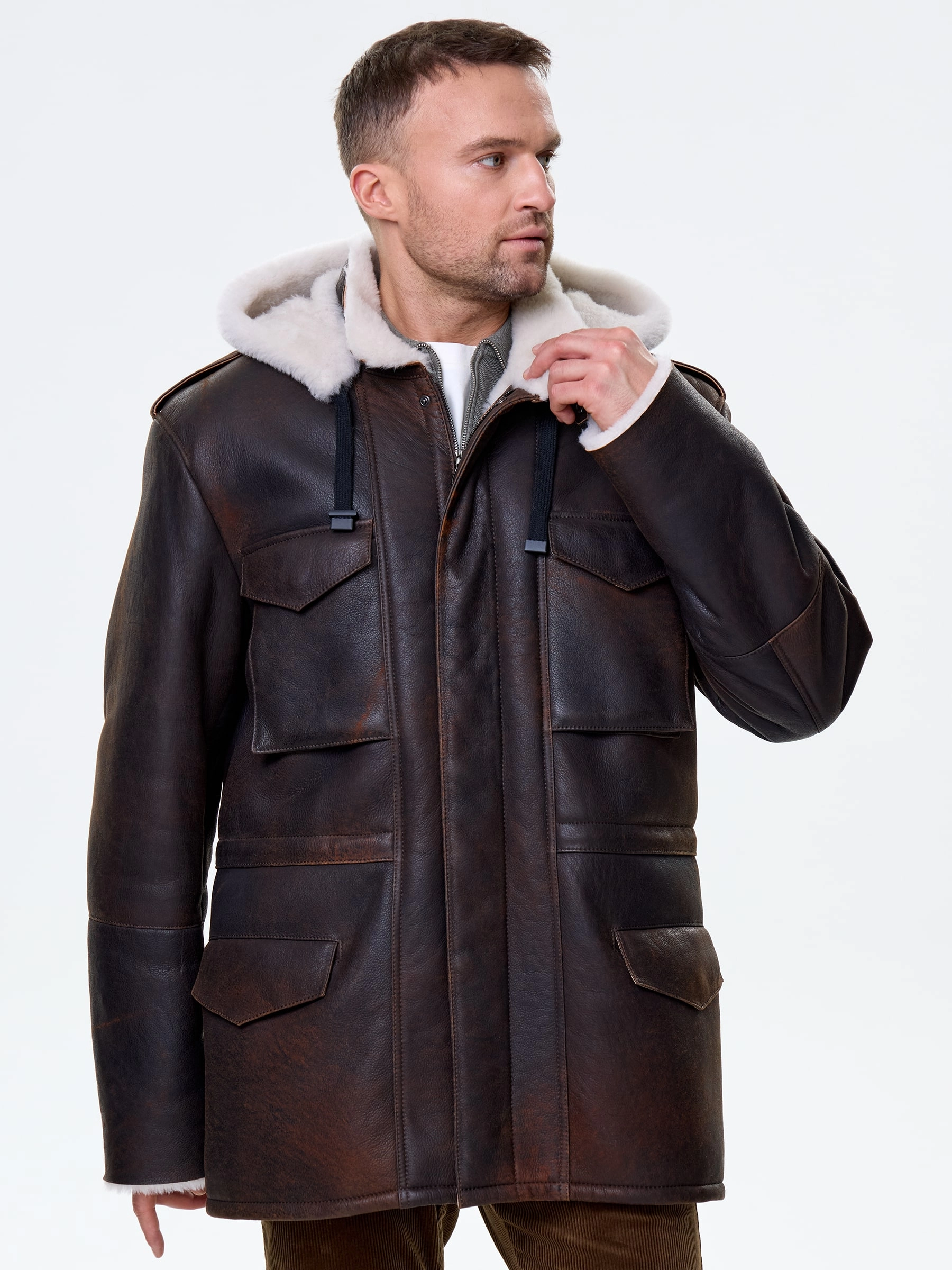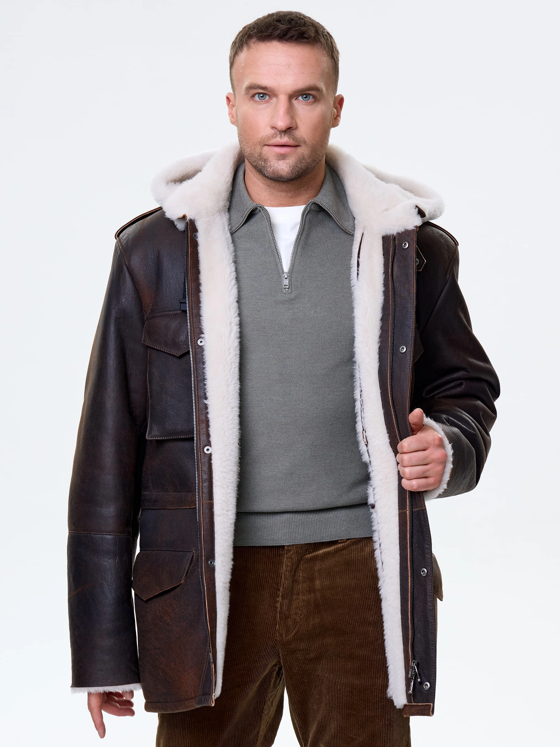 Мужское полупальто из натуральной овчины с капюшоном премиум класса 433, коричневая, размер 48, артикул 72000