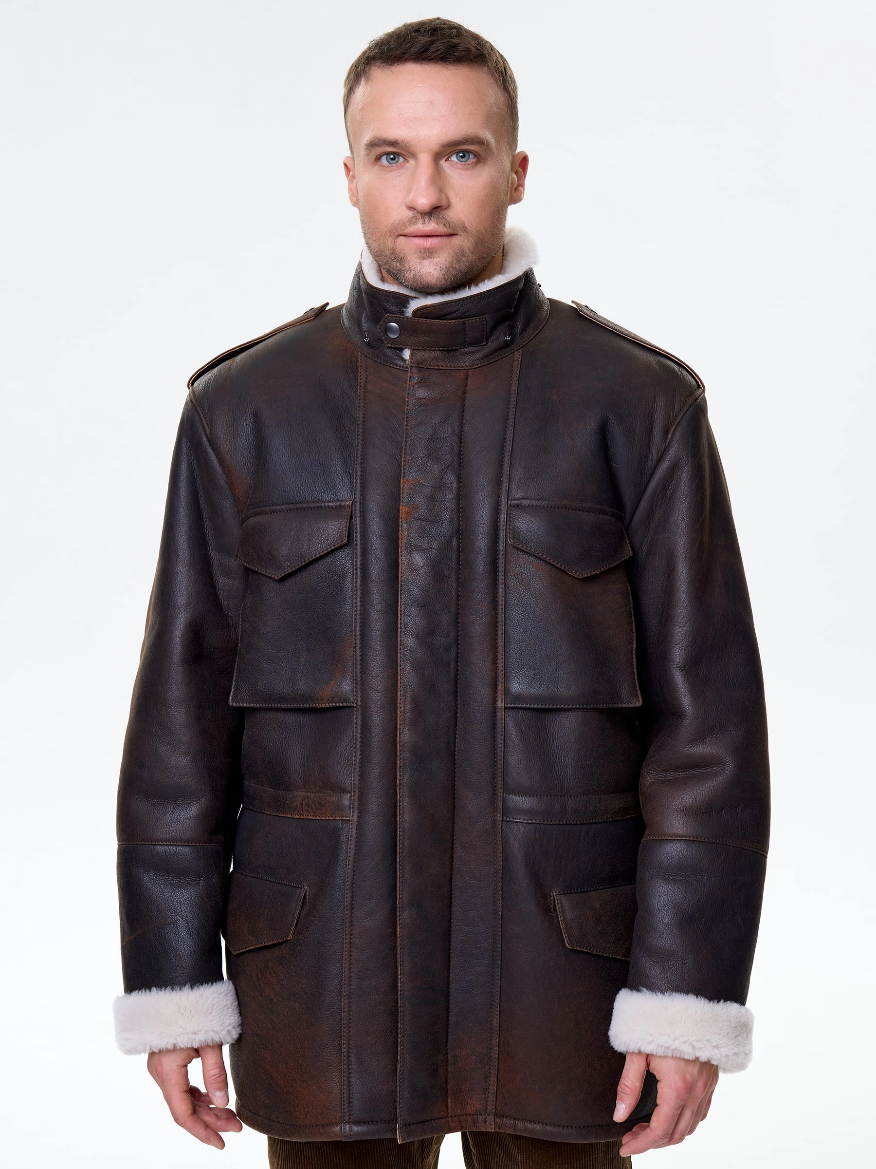 Мужское полупальтов стиле милитари из коричневой плотной овчины. Изделие имеет невысокий воротник-стойку с застежкой в виде паты с квадратной пряжкой, а также четыре вместительных кармана. Потайная застежка на молнии, внутри модели пояс-кулиска.