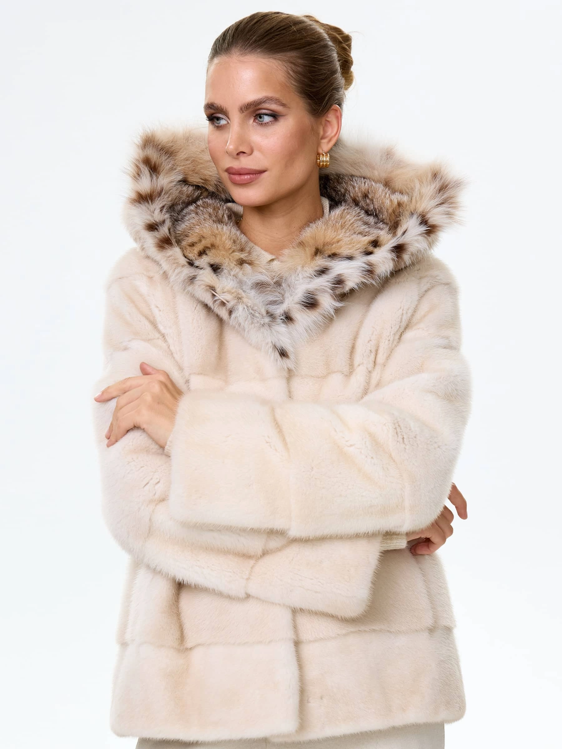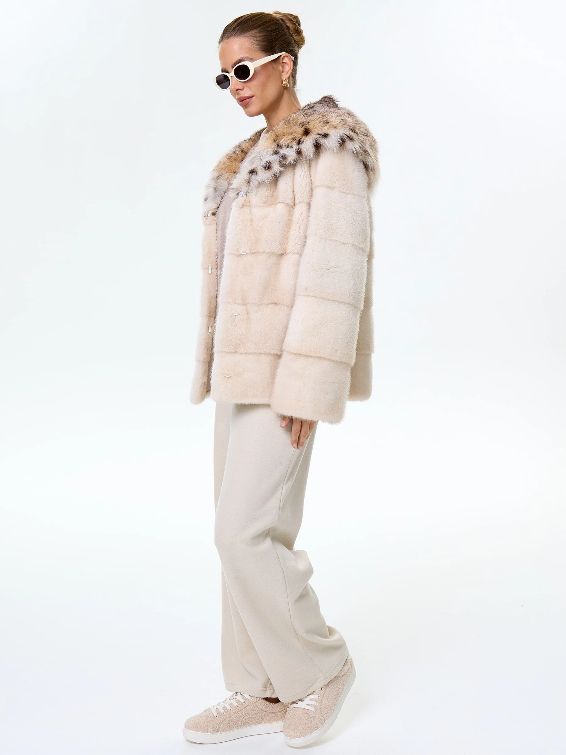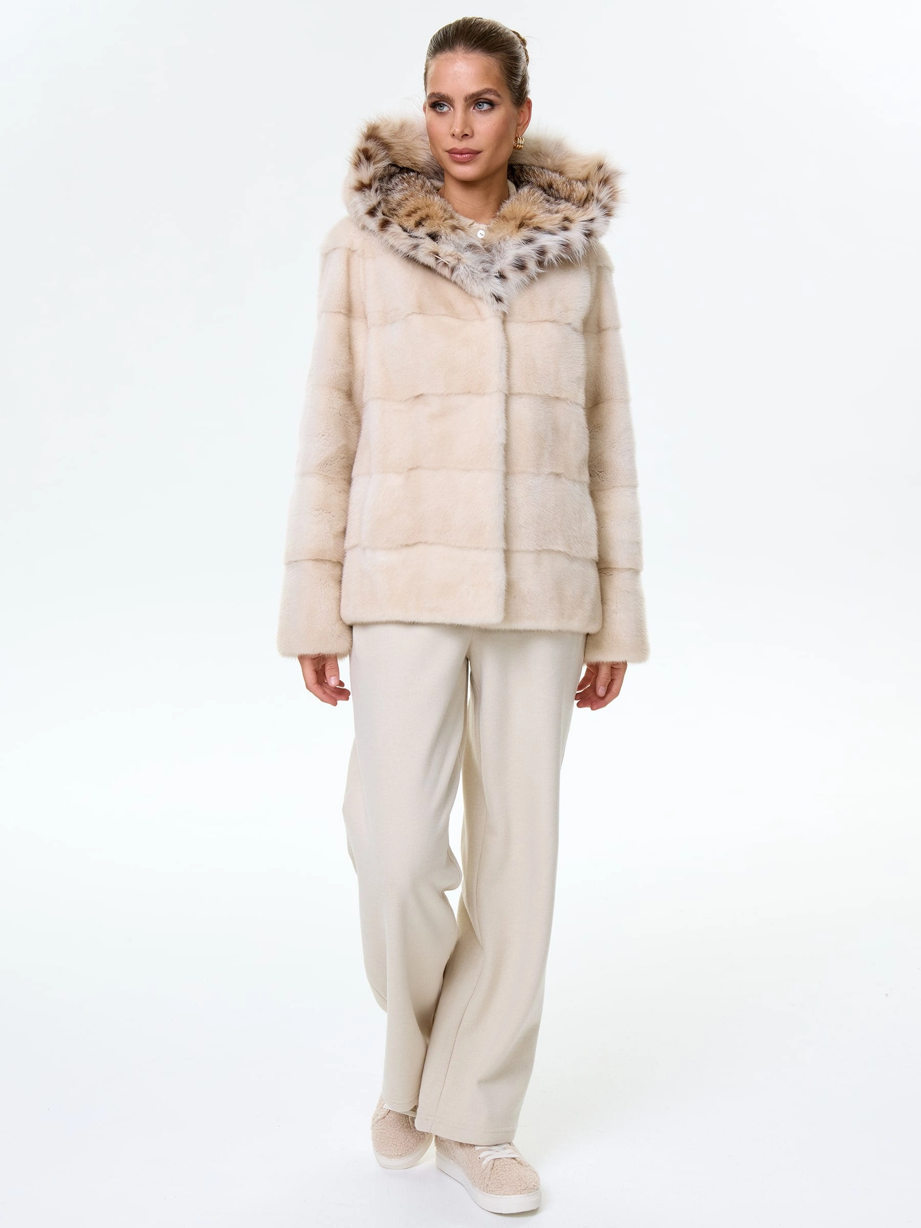 Норковая шуба женская с капюшоном и отделкой рысевидной кошкой Юля(к), жемчужная, размер 48, артикул 34130
