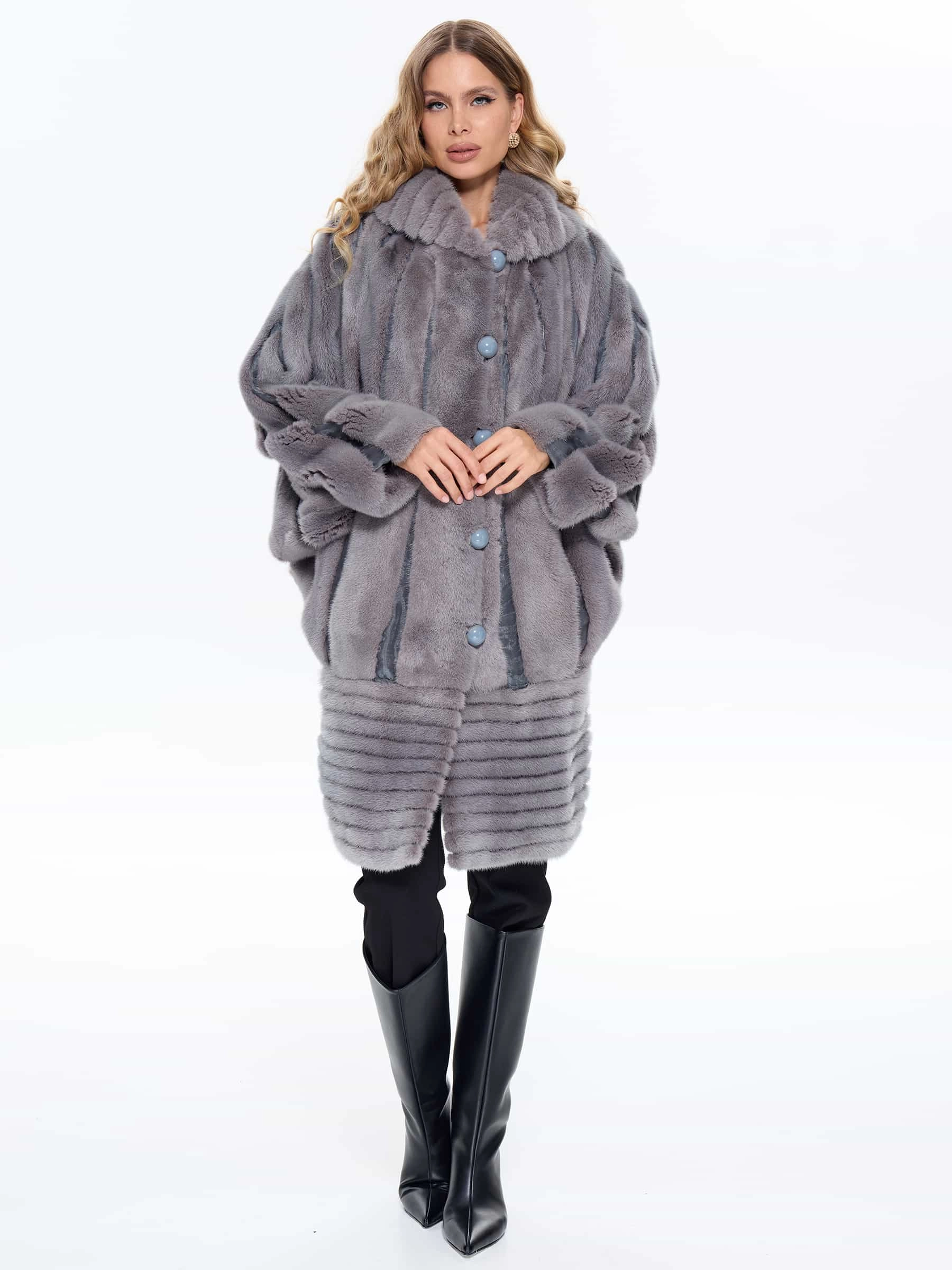 Товар норковая женская шуба braschi elm 042, серая, размер 46, артикул 34440 выполнен из норка с застежкой пуговицы. Рассчитан на сезон: зима. Длина изделия 98 см, силуэт свободный.
