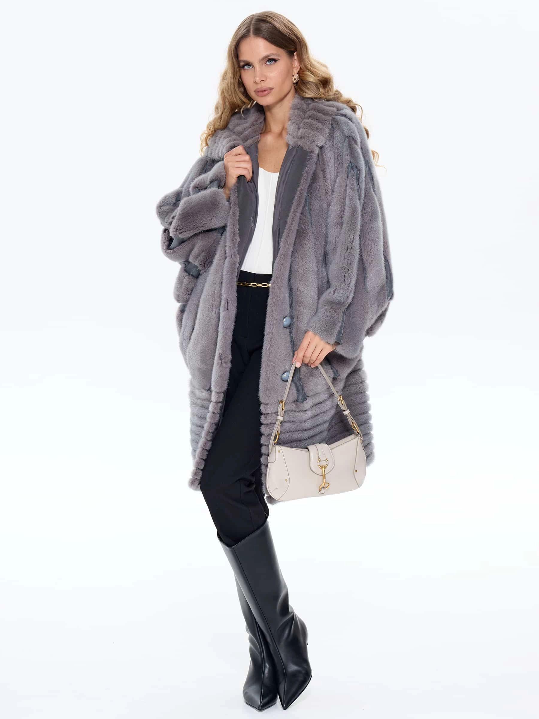 Женская шуба в морозном сером цвете с голубым подтоном выполнена из густого шелковистого меха норки, ее свободный крой не ограничивает движений, мягко скрывает особенности фигуры и позволяет носить объемные свитера. Модель обладает эксклюзивными деталями: рукав «мышка» разработан совместно с лабораторией Milan Fashion Tech, объемный капюшон и внешняя часть выполнены в диагональной раскладке меха. Универсальная длина миди подходит как для городской носки, так и для особых случаев. Изделие дополнено практичной подкладкой из износостойкой вискозы, глубокими боковыми карманами и застежкой на пуговицах, а качественный мех отлично сохраняет тепло в холодную зиму.