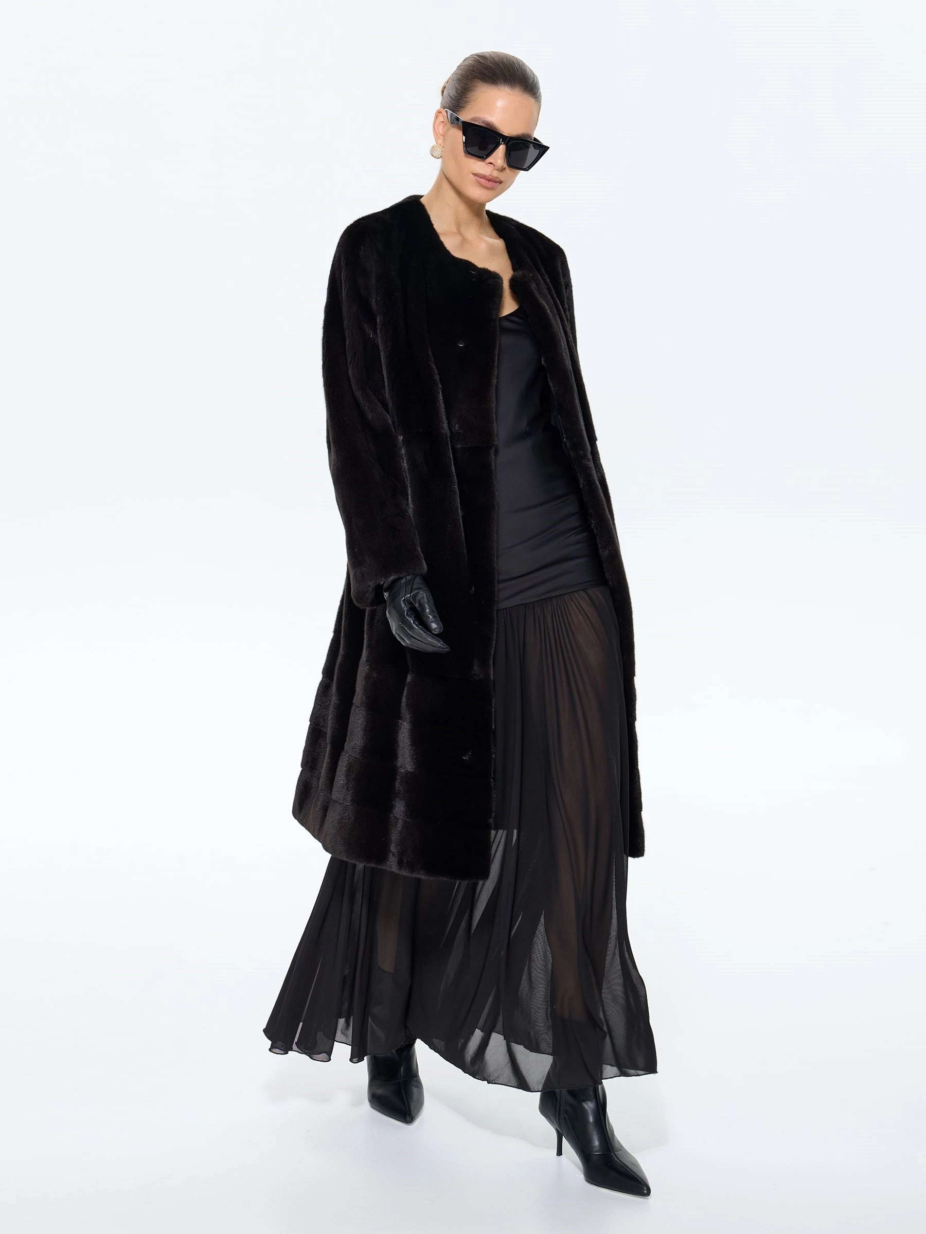 Женская классическая шуба BRASCHI из натурального меха норки в роскошной длине "макси". Модель отличается современным минимализмом: у нее полностью отсутствует воротник, создавая элегантную открытую линию горловины, нет капюшона. Покрой рукава - реглан, обеспечивающий комфорт и свободу движений. Шуба не имеет декоративной отделки, позволяя первоклассному меху норки говорить самому за себя. Застегивается на классические металлические клипсы. Подкладка – вискоза. Предназначена для холодной зимы. Изделие выполнено в редком и роскошном оттенке "Violet Fox" (Лисий фиолет) – глубоком холодном цвете с изысканными фиолетово-синеватыми или иссиня-черными переливами. Длинный прямой силуэт в сочетании с отсутствием воротника и эксклюзивным цветом придает модели особую элегантность и статусность.