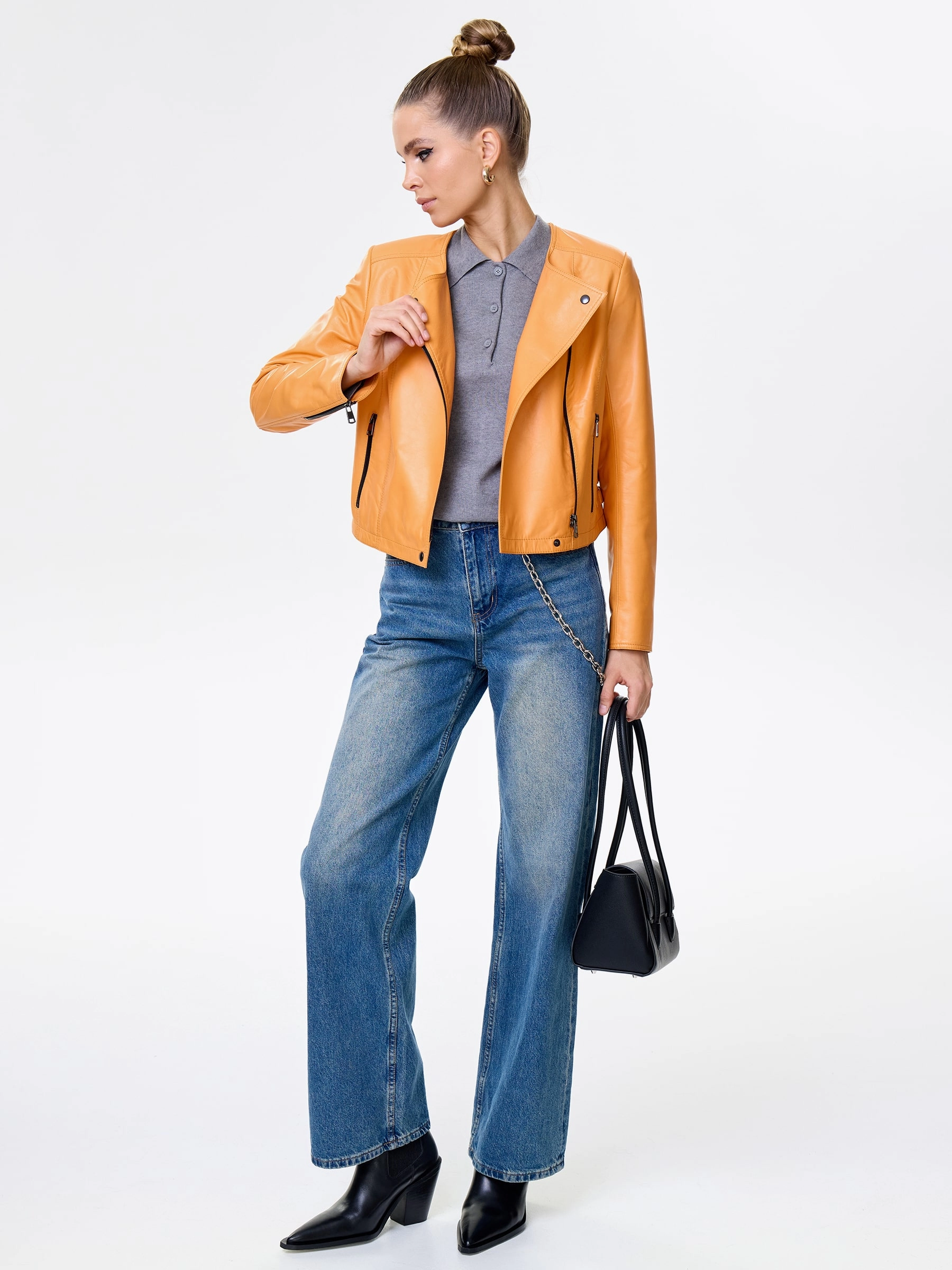 Женская косуха из роскошной натуральной кожи апельсиново-оранжевого оттенка. Полуприлегающий силуэт на молнии без воротника, врезные карманы подчеркивают спортивный шик. Регулируемые боковые паты обеспечивают идеальную посадку, акцентируя фигуру, а втачные рукава гарантируют комфорт. Этот must-have мгновенно заряжает образ энергией — наденьте с базовой белой футболкой, черными скинни и кедами для смелого повседневного стиля или с черным платьем-чехлом и ботфортами для яркого вечернего акцента.