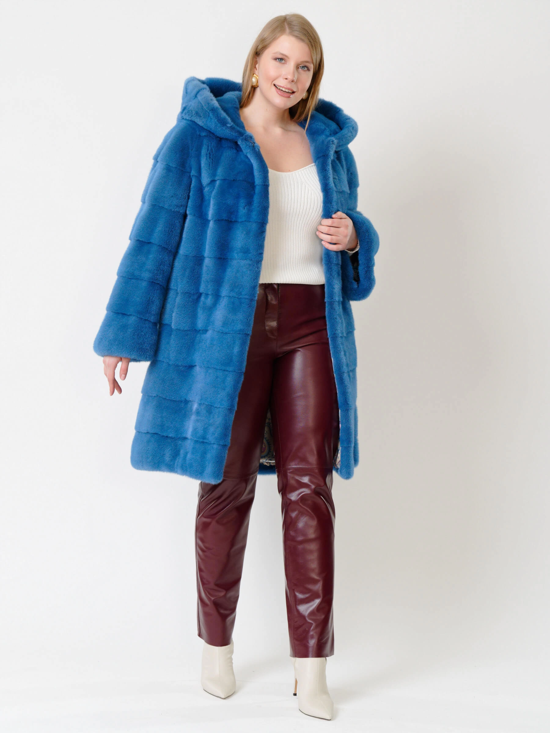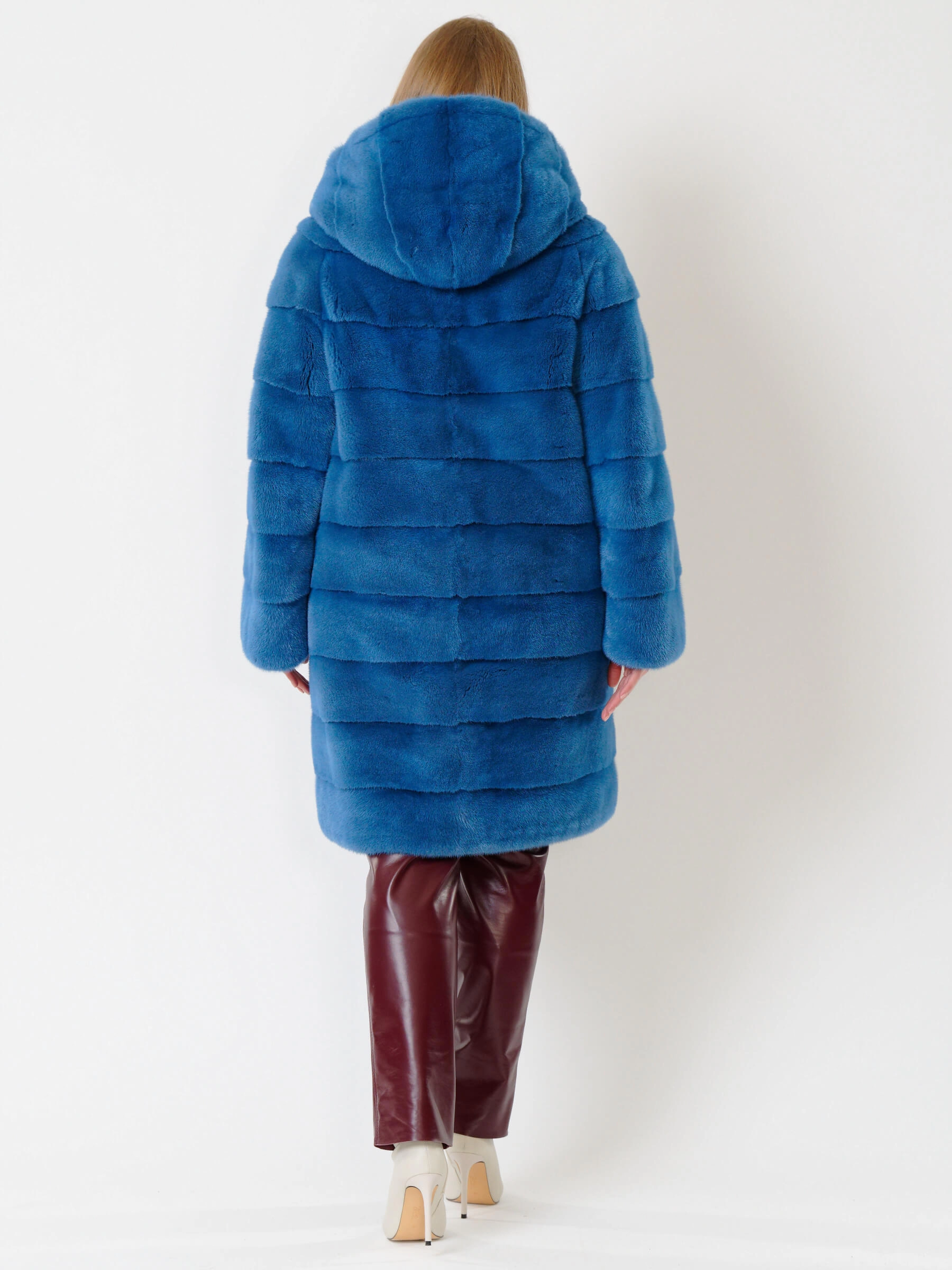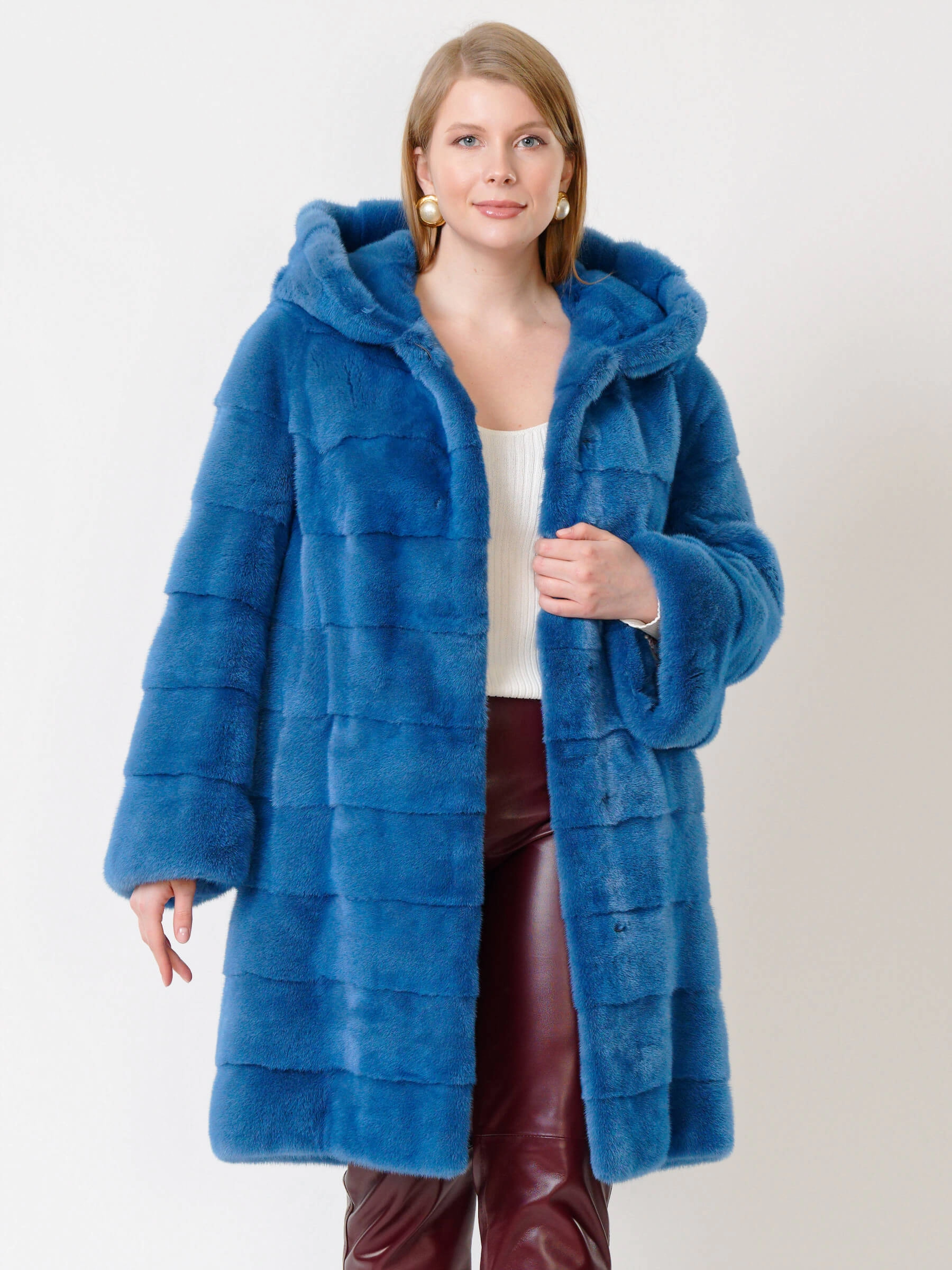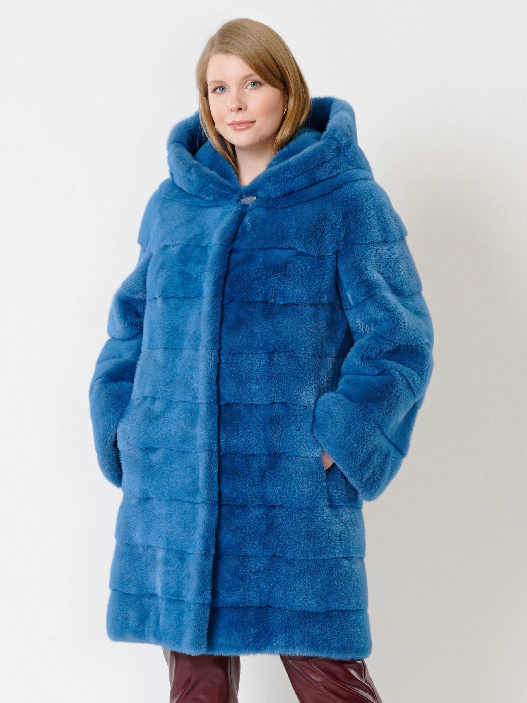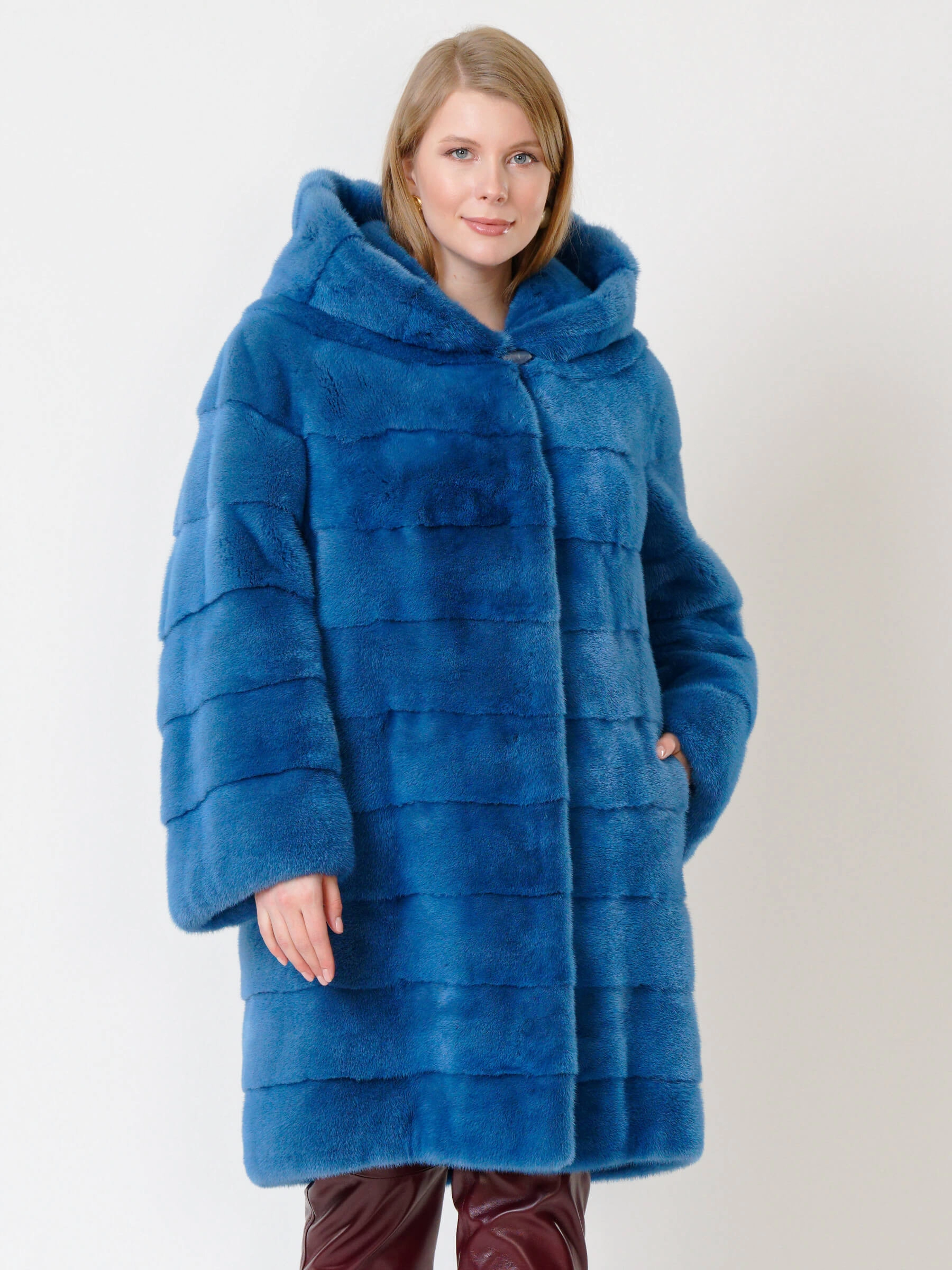 Элегантное пальто прямого кроя из крашеной норки с глубоким капюшоном и поперечной укладкой меха. Четкие линии плеч, широкие рукава и боковые карманы создают сдержанный современный силуэт, а застёжка на клипсах обеспечивает удобство. Длина свыше 90 см визуально вытягивает фигуру. Все технологические швы продублированы вручную хлопковой кромкой, а борт, область вокруг карманов, низы рукавов и воротник укреплены бортовкой из льна с конским волосом для безупречной формы. Сочетайте модель с кожаными брюками и грубыми ботинками для дерзкого образа или с платьем-миди и сапогами на каблуке для вечернего выхода.