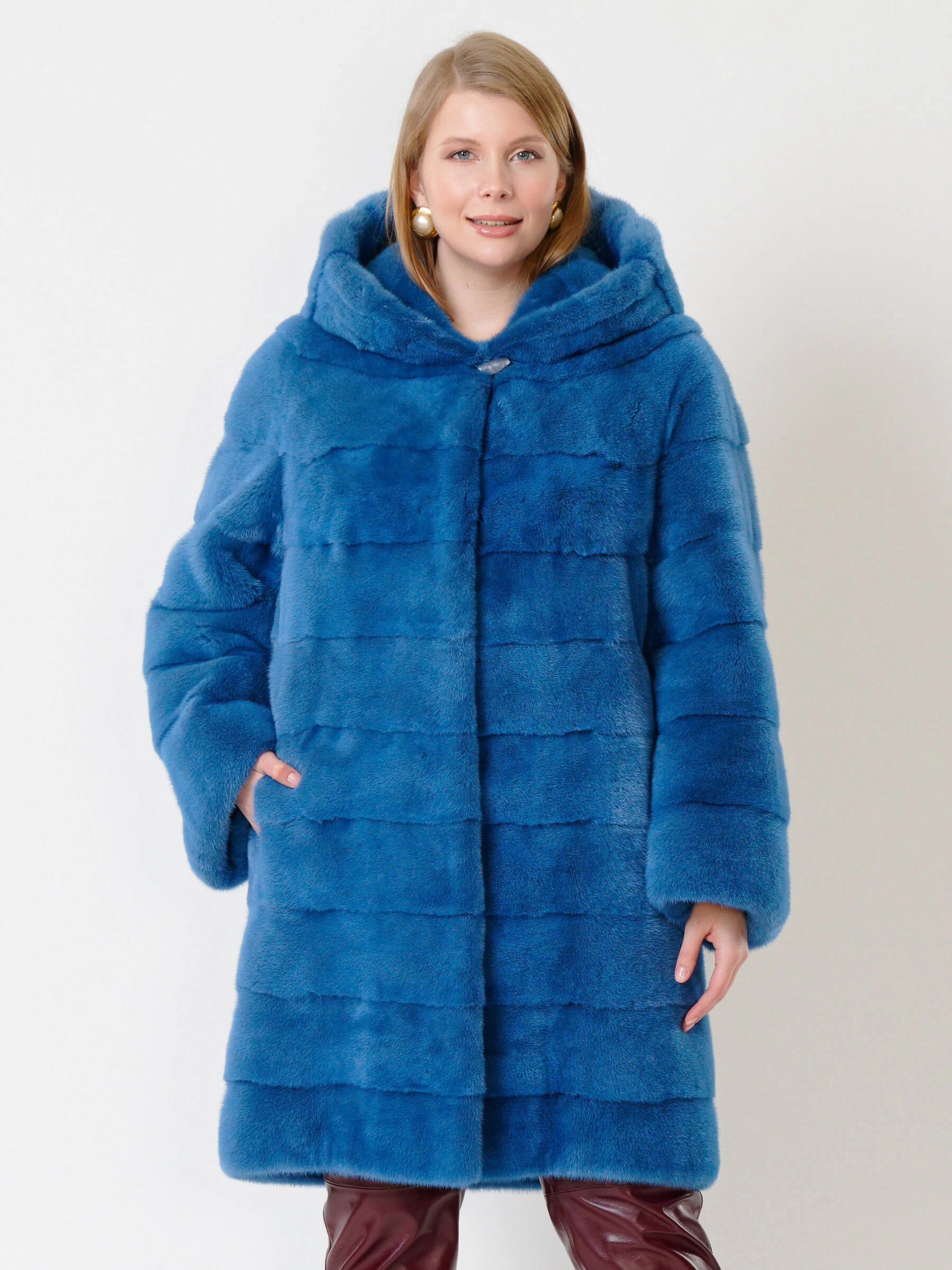 Товар пальто из меха норки женское с капюшоном 245(к), голубое, размер 52, артикул 32780 выполнен из норка крашенной с застежкой клипсы. Рассчитан на сезон: осень-зима. Длина изделия свыше 90 см, силуэт прямой.