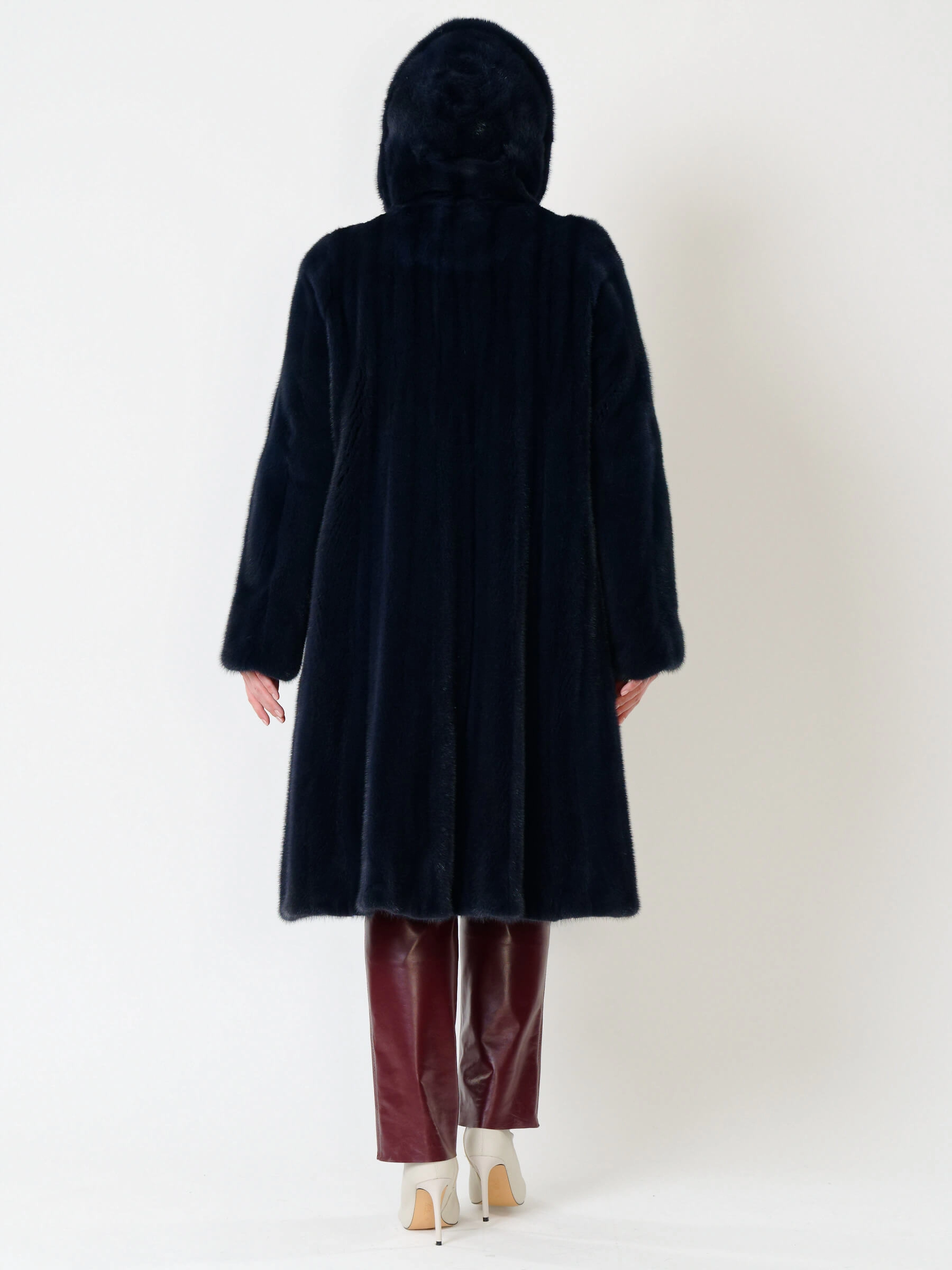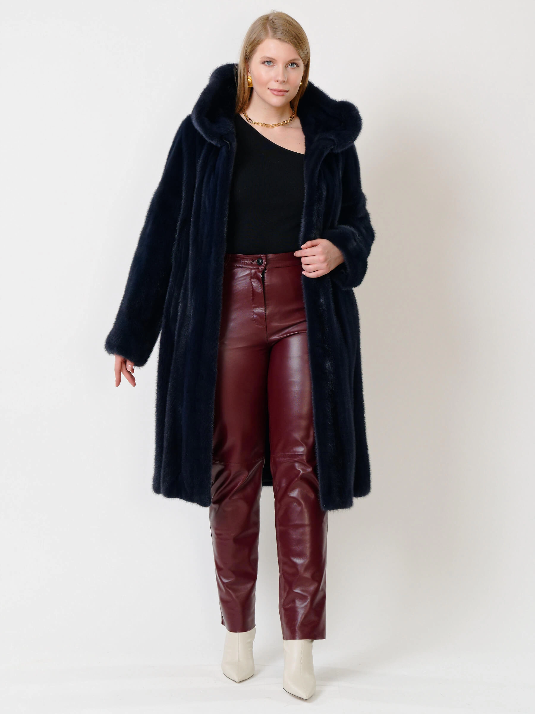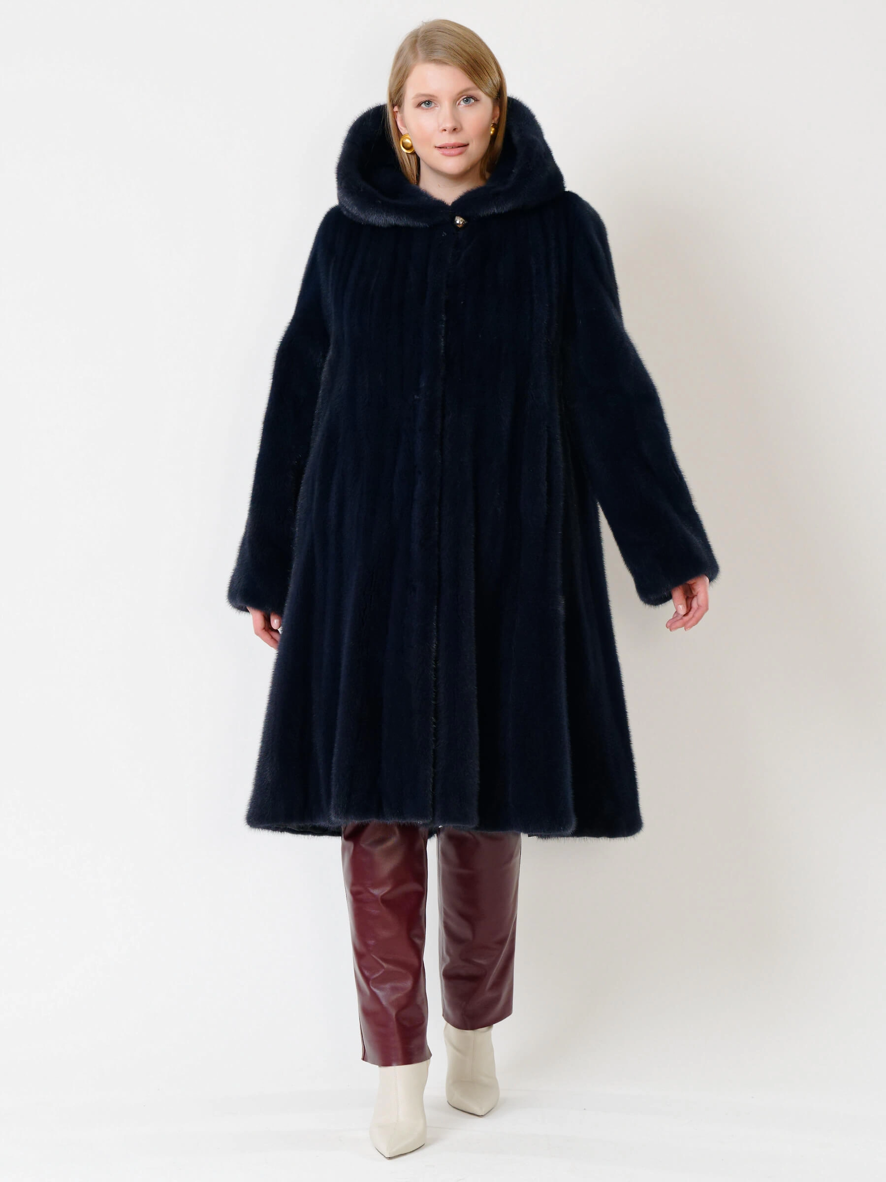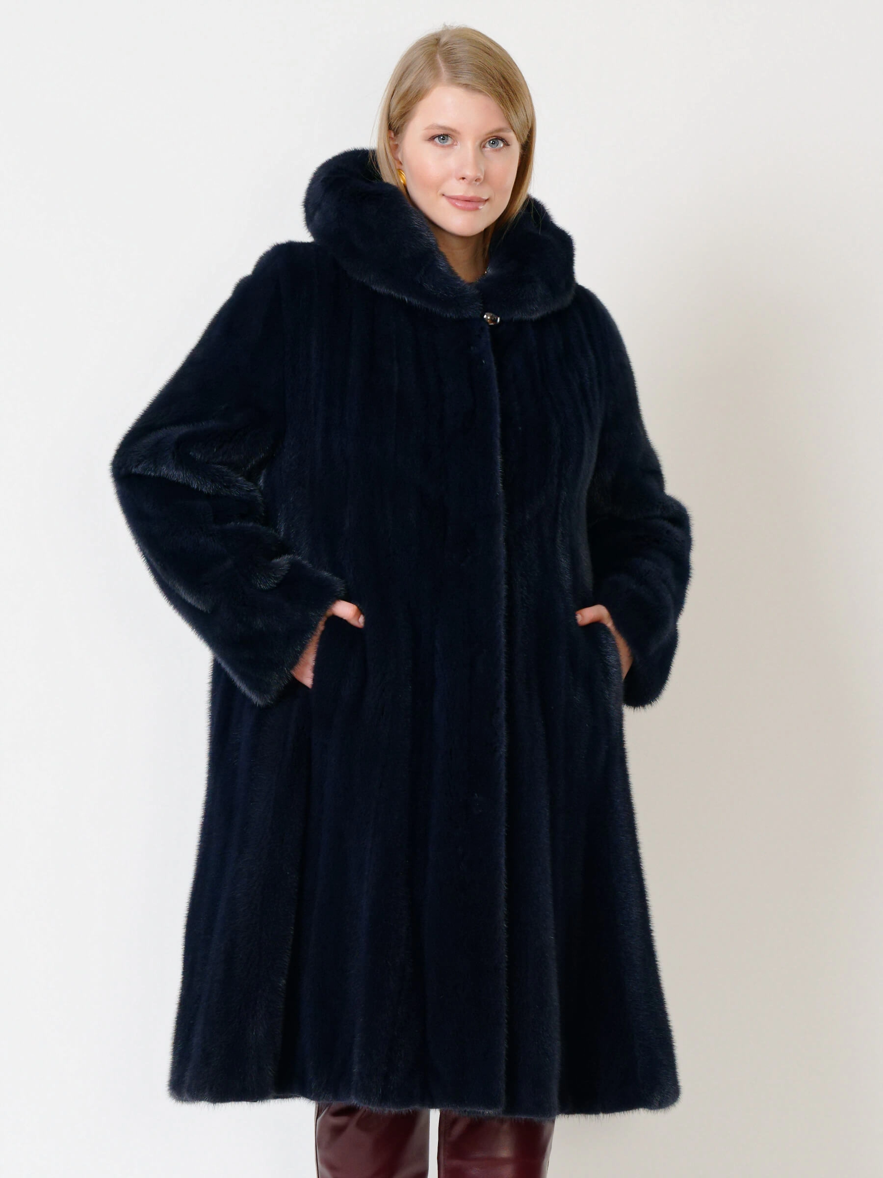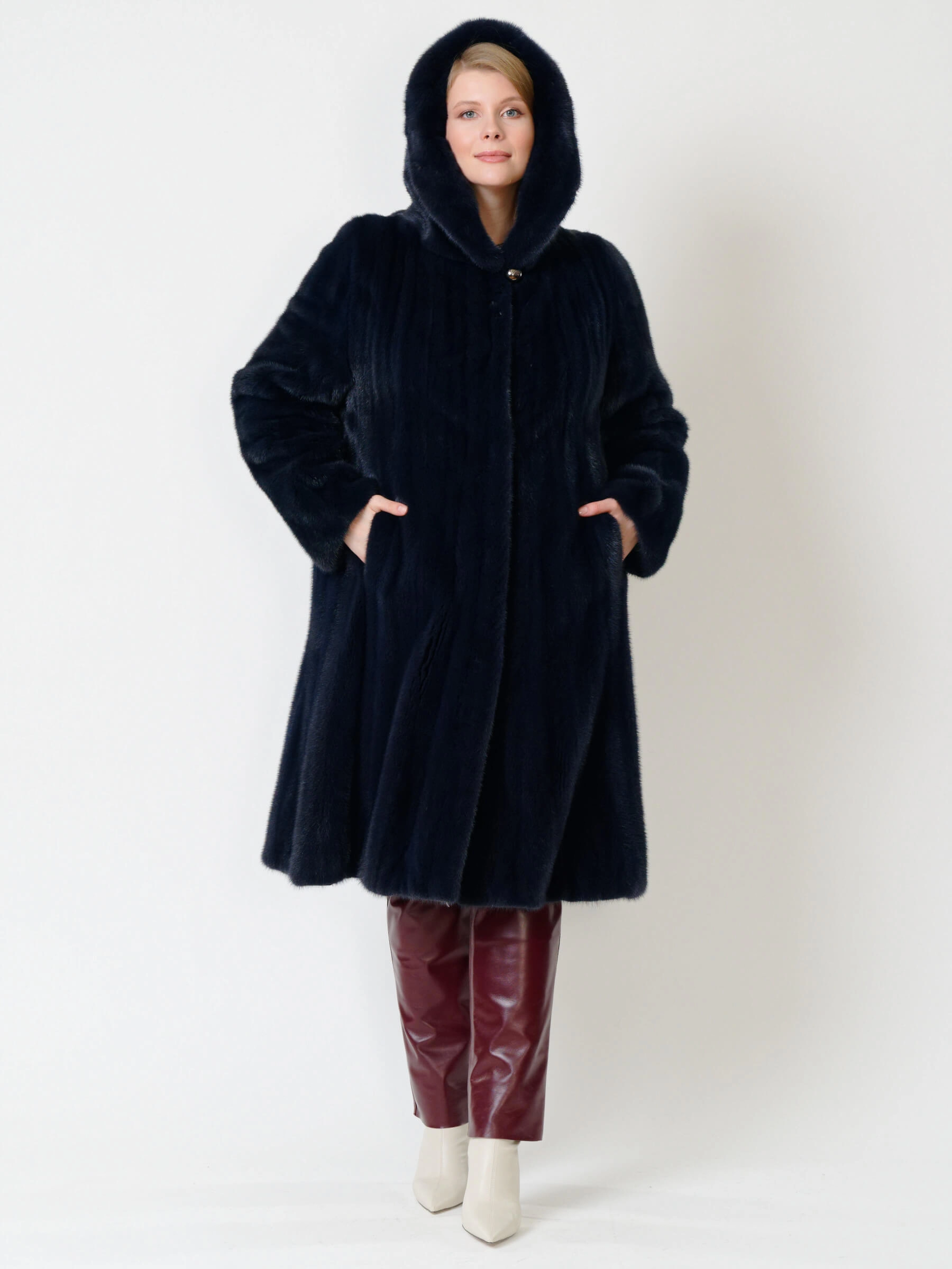 Элегантная шуба силуэта трапеция из густого шелковистого меха крашеной норки с глубоким несъёмным капюшоном: расклешенный крой длиной свыше 90 см и два боковых кармана создают стильный образ, а застёжка на клипсах обеспечивает удобство. Мех согреет в лютые морозы — сочетайте с кожаными брюками и грубыми ботинками для дерзкого лука или с платьем-миди и сапогами на каблуке для вечернего выхода.