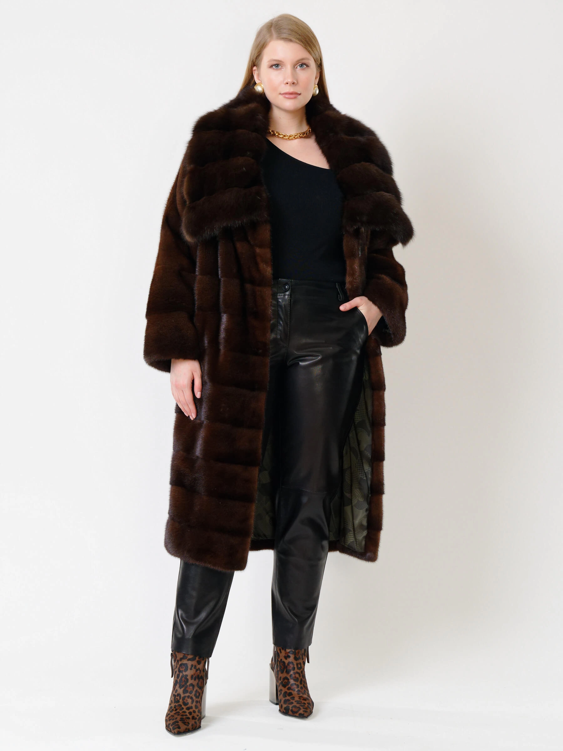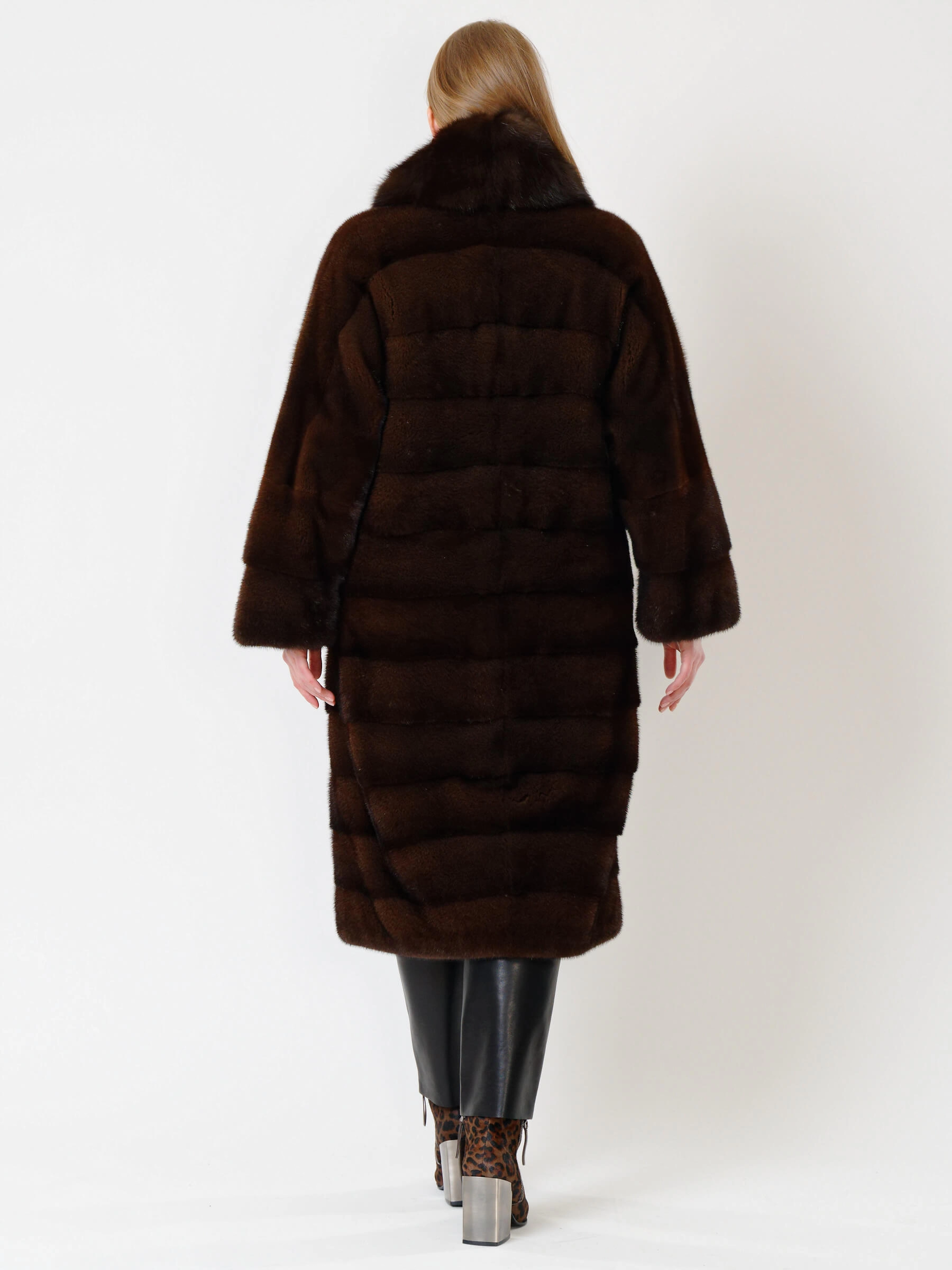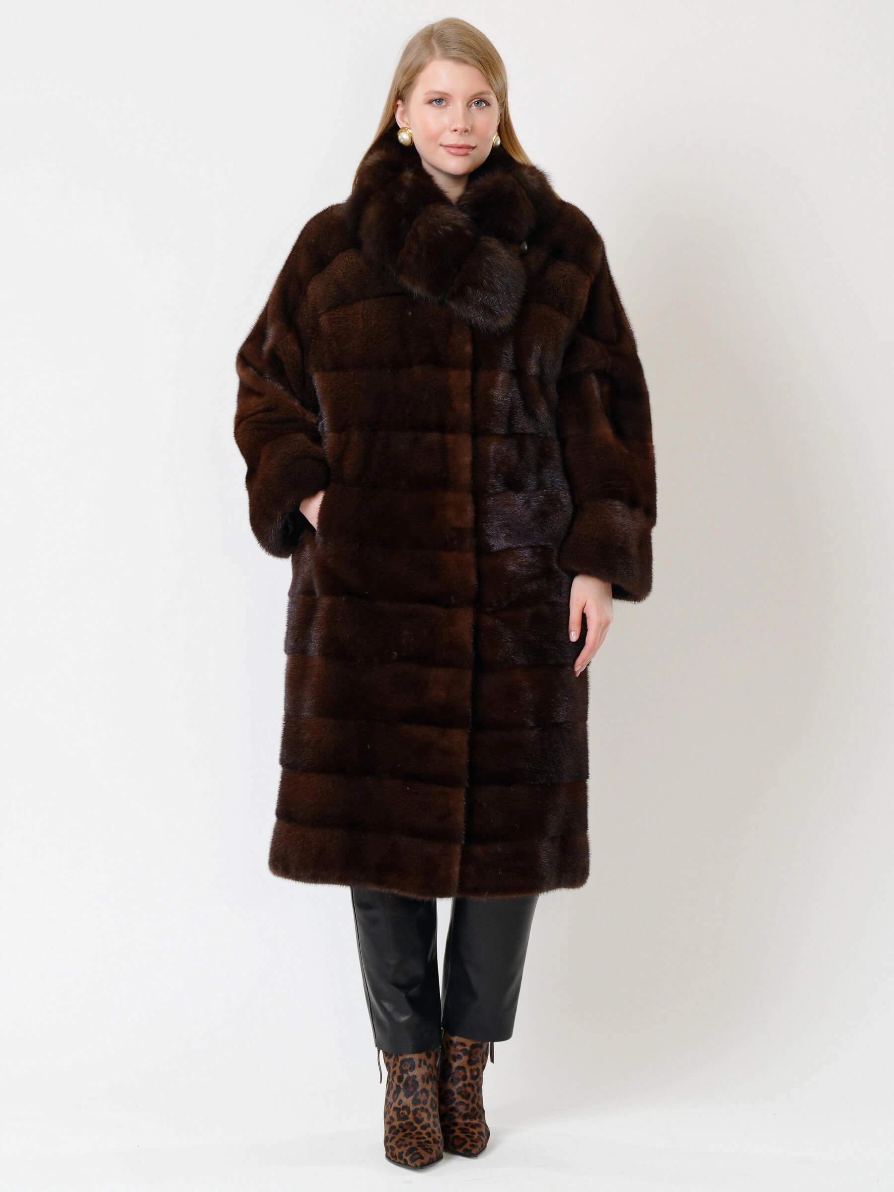 Товар длинная поперечная женская шуба с воротником из меха соболя 1150(вс), темно-коричневая, размер 48, артикул 32790 выполнен из норка крашенной с застежкой клипсы. Рассчитан на сезон: осень-зима. Длина изделия свыше 90 см, силуэт прямой.