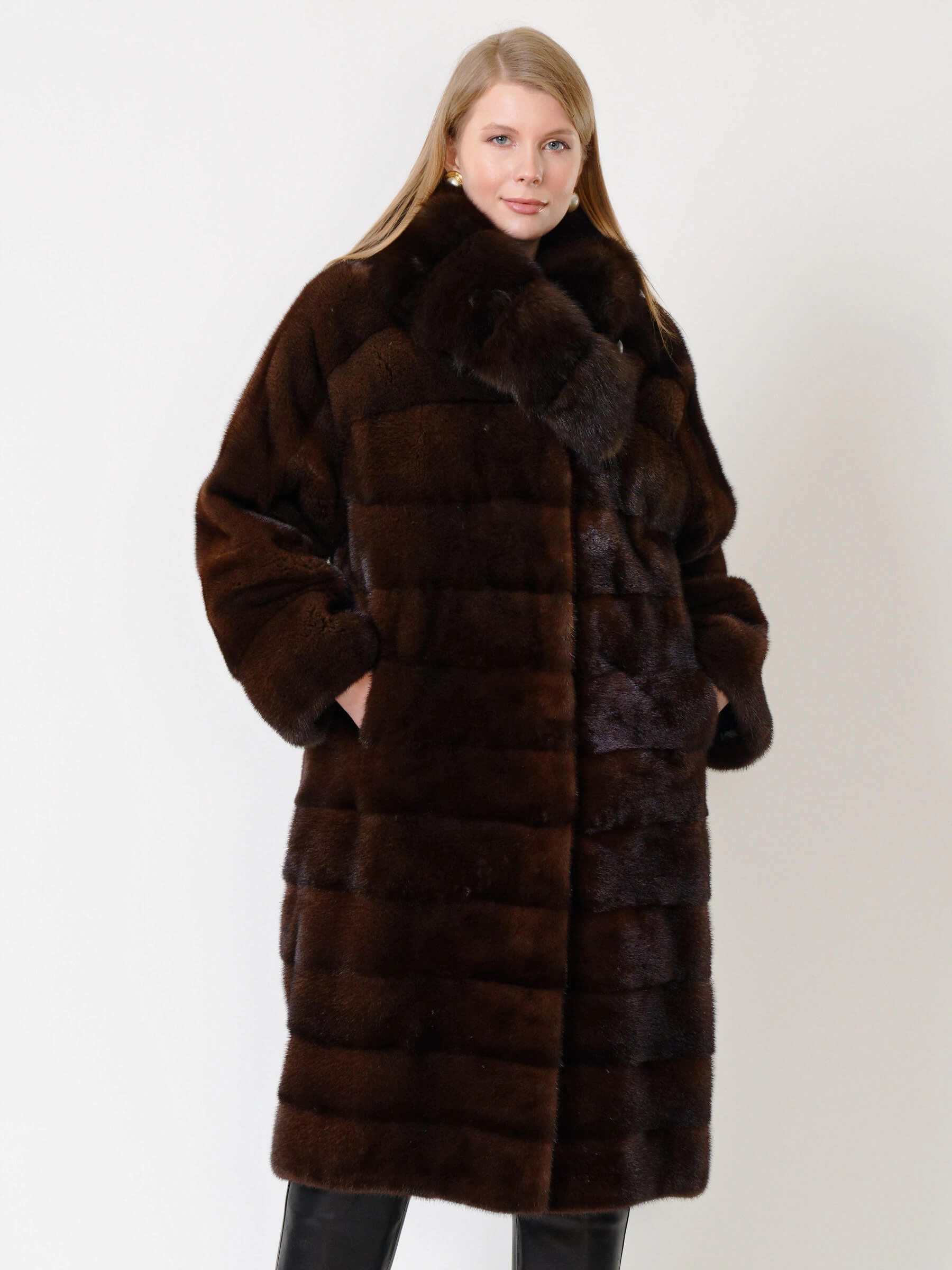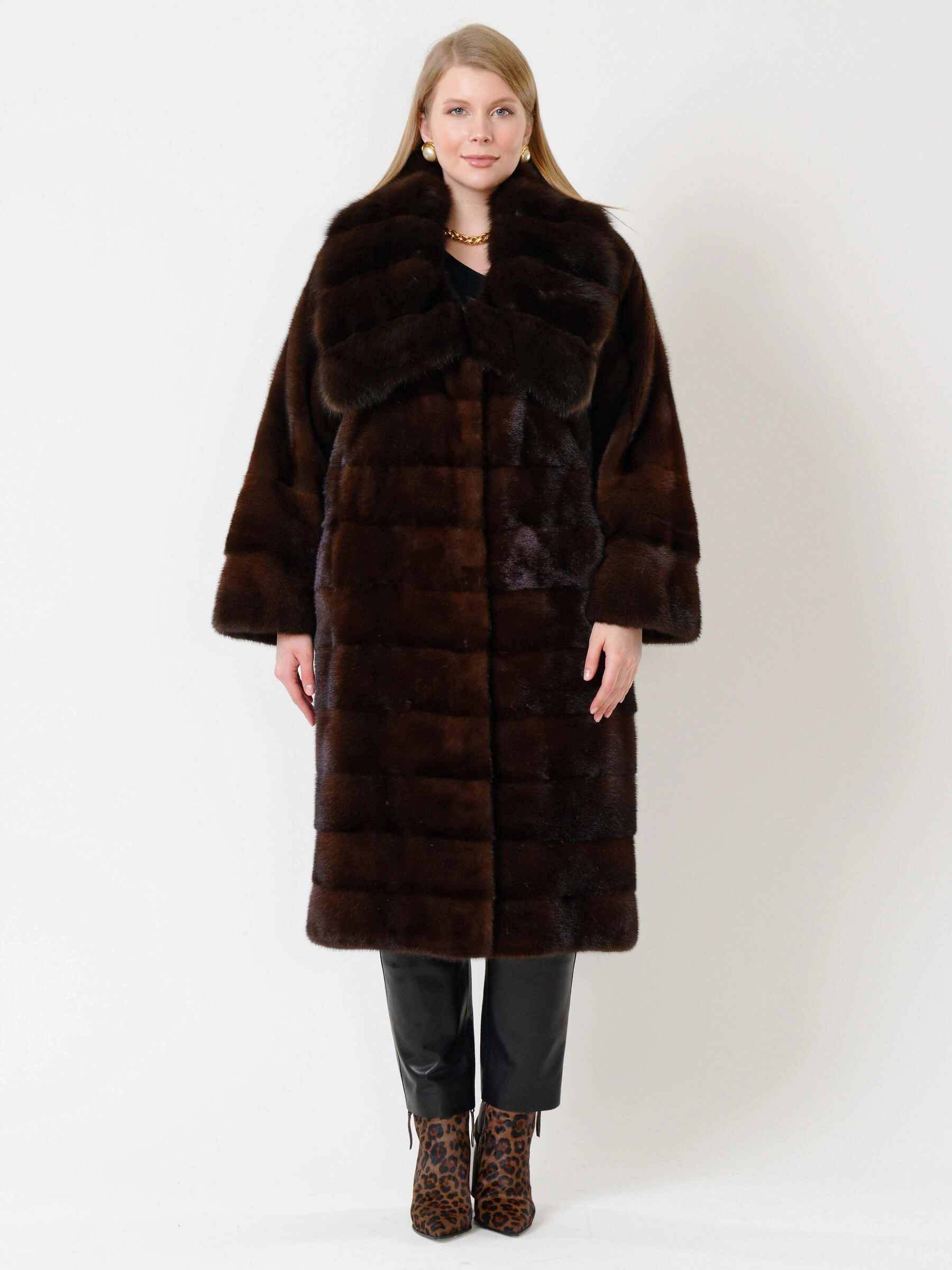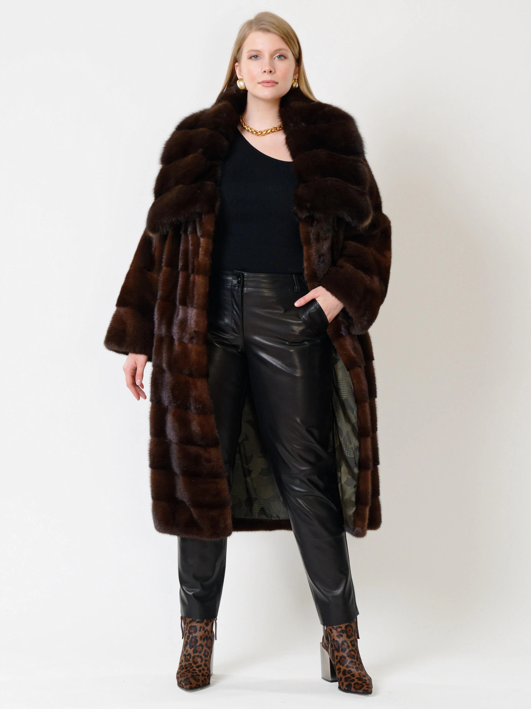 Товар длинная поперечная женская шуба с воротником из меха соболя 1150(вс), темно-коричневая, размер 48, артикул 32790 выполнен из норка крашенной с застежкой клипсы. Рассчитан на сезон: осень-зима. Длина изделия свыше 90 см, силуэт прямой.