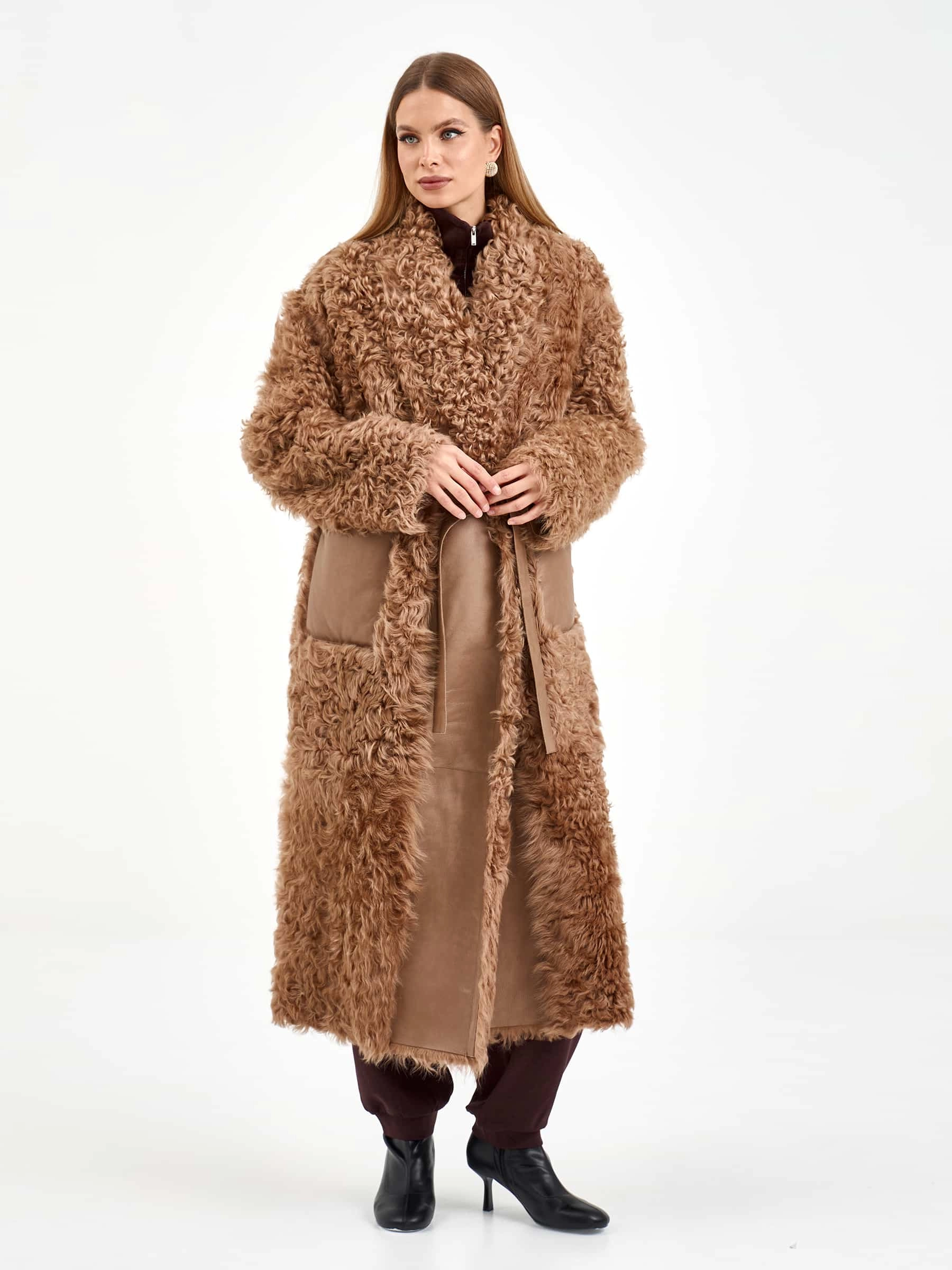 Двухстороннее длинное пальто из густого меха калган - станет отличным решением в холодную погоду. Комфортный свободный крой не сковывает движения, удобный шалевидный воротник. Запах модели контролирует пояс-лента.