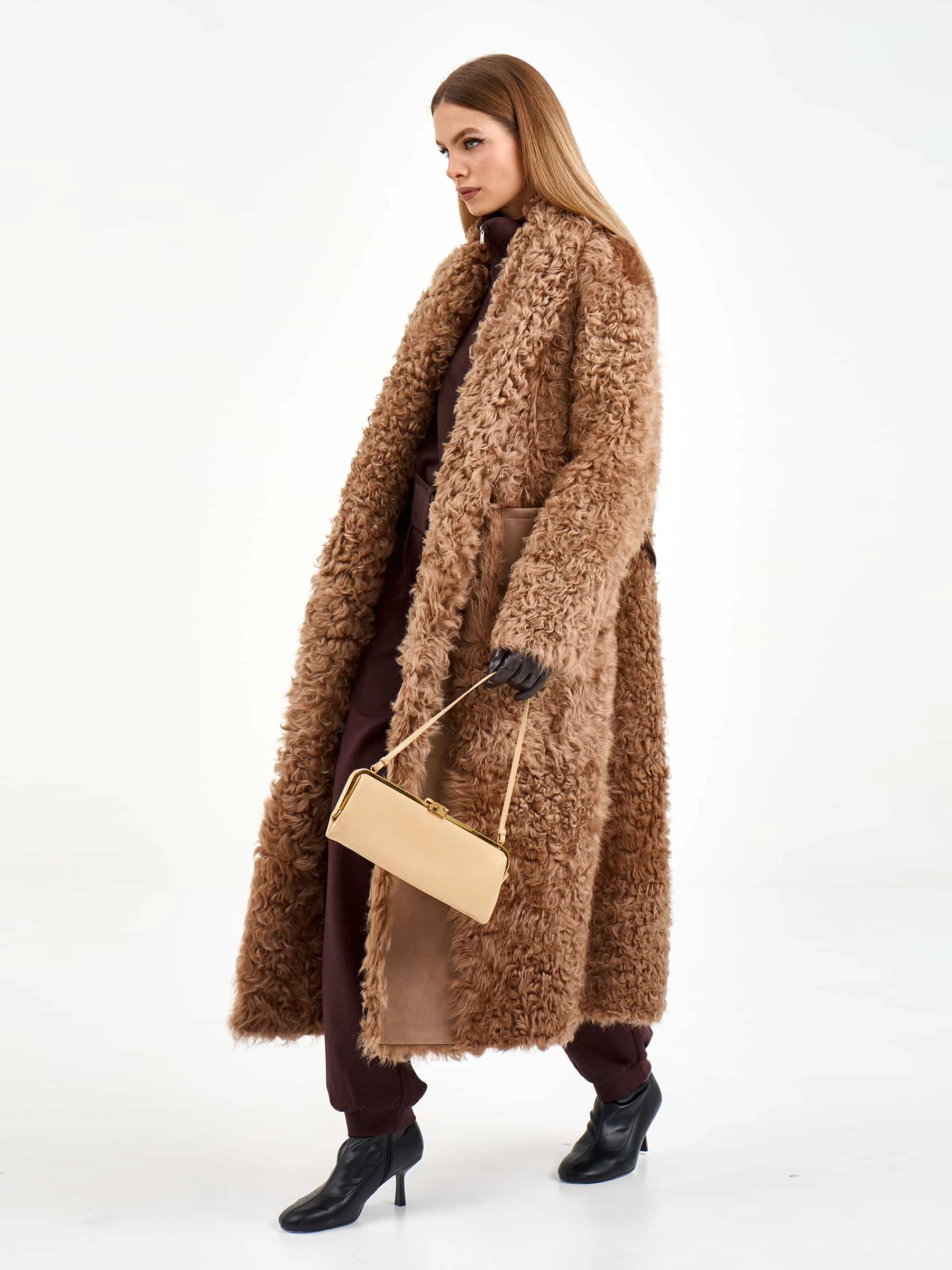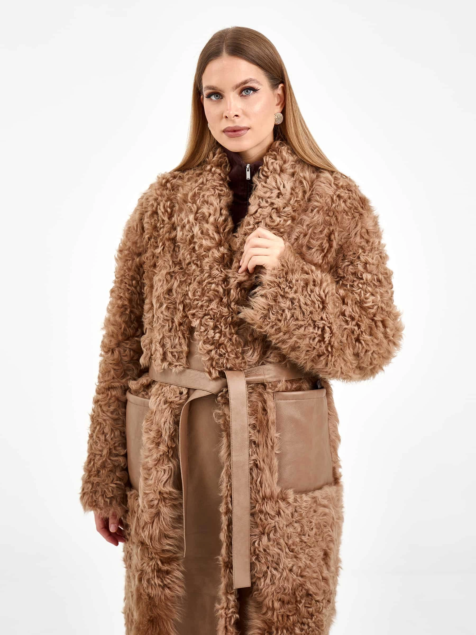 Товар пальто из натуральной овчины тиградо для женщин премиум класса 2020, светло-коричневое, размер 44, артикул 64300 выполнен из овчина "тиградо" с застежкой пояс. Рассчитан на сезон: осень-зима. Длина изделия 122 см, силуэт прямой.