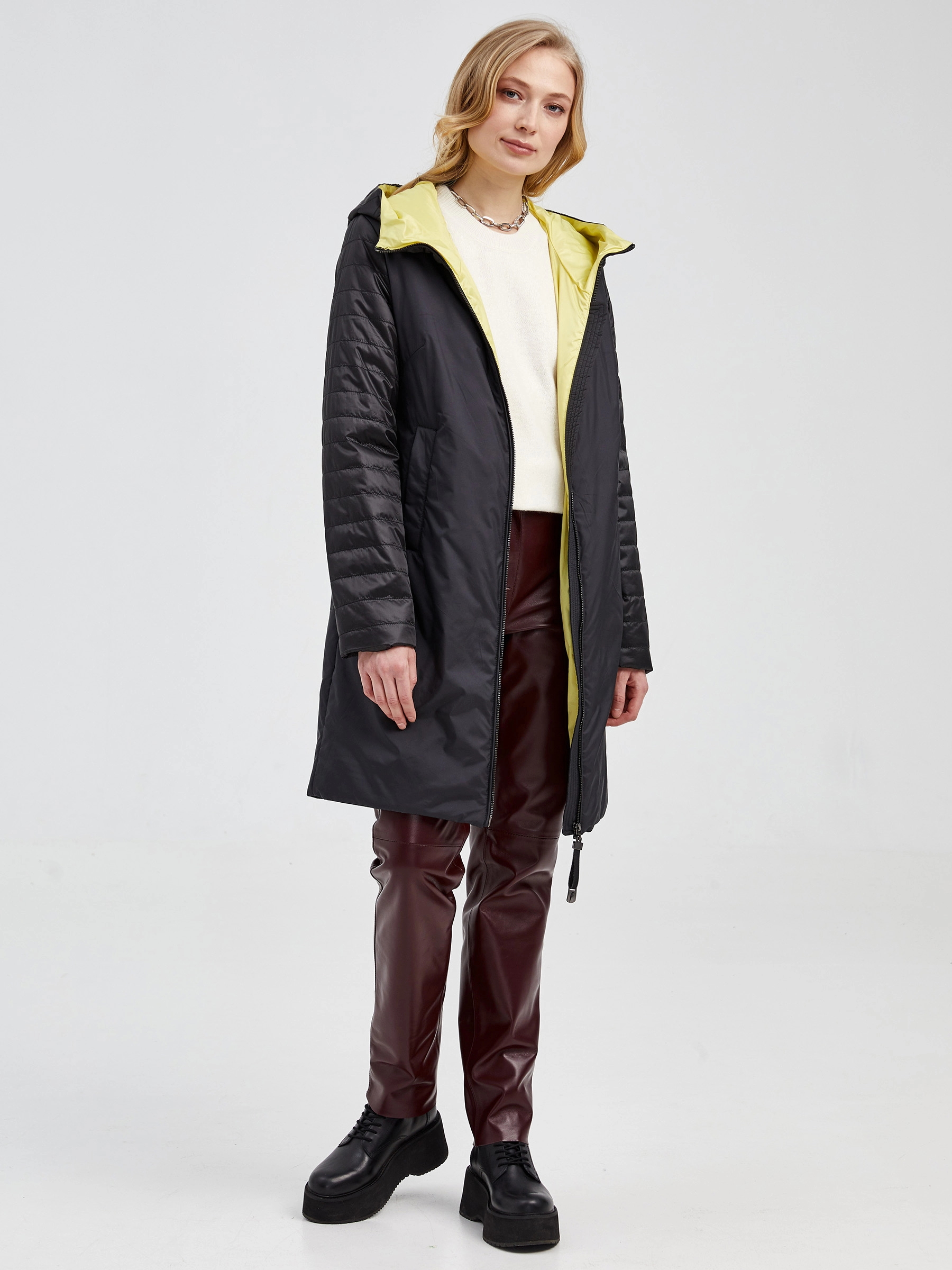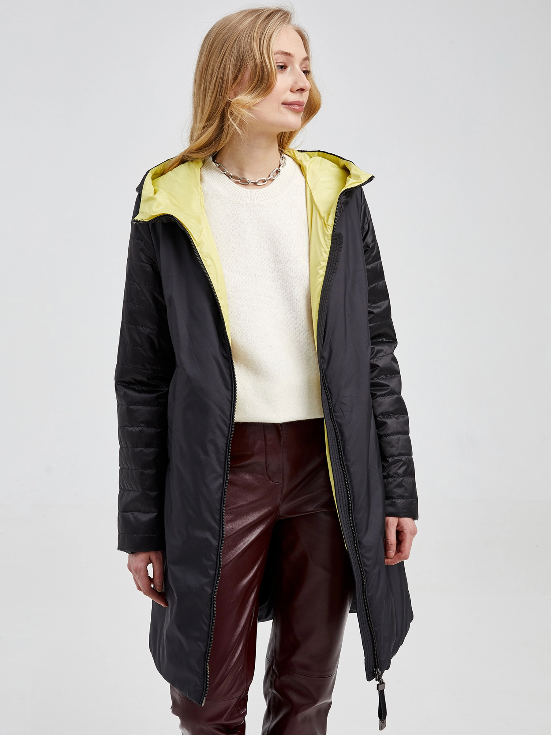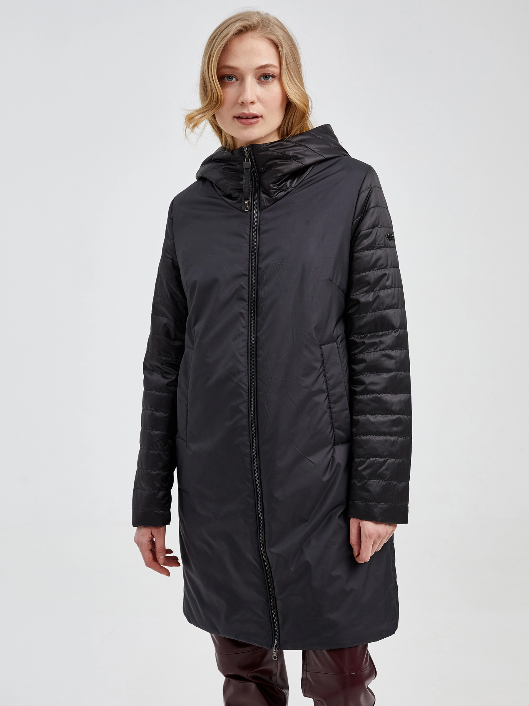 Товар текстильный двусторонний женский пуховик с капюшоном 21380 , черный, размер 42, артикул 25140 выполнен из текстиль с застежкой молния. Рассчитан на сезон: демисезон. Длина изделия свыше 90 см, силуэт прямой.