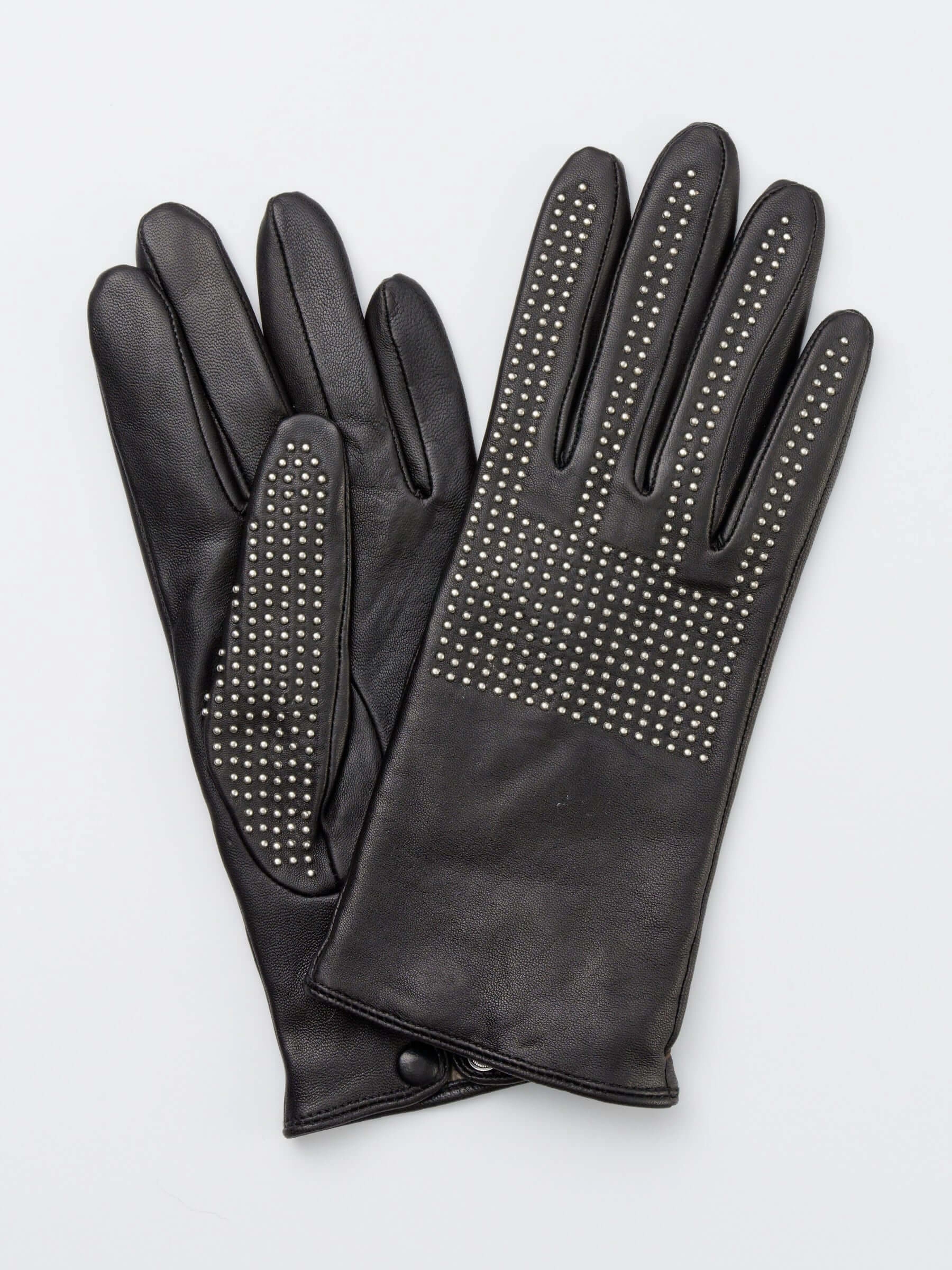 Перчатки торговой марки ELEGANZZA производства Италия выполнены из натуральной кожи ягненка. Отделка - геометрический орнамент, выполненный из металлических хольнитенов, в том числе с наружной части большого пальца. Длина манжеты от нижней точки большого пальца до края перчаток - 5,5 см