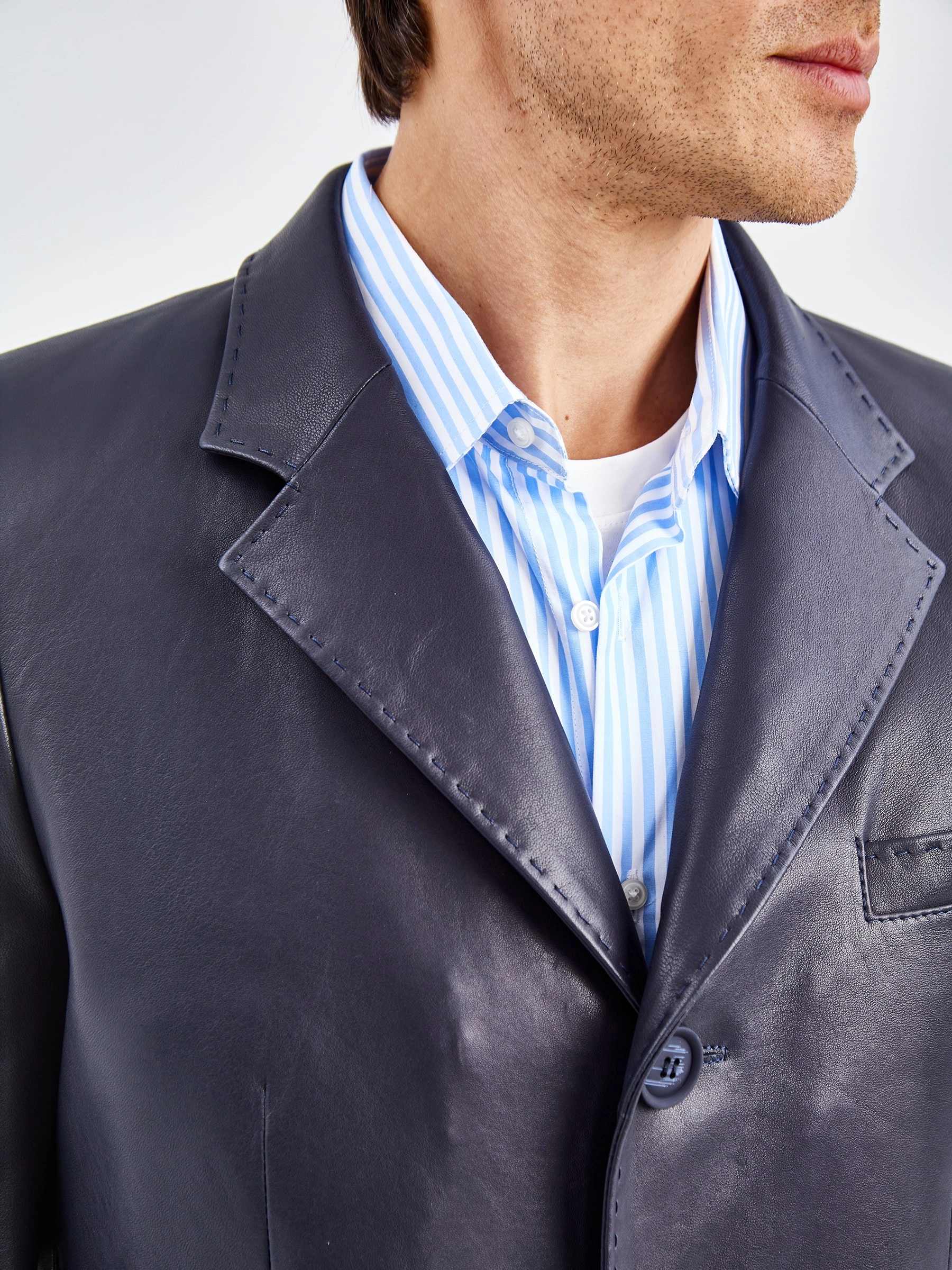 Мужской кожаный пиджак на ручном стежке премиум класса 543, синий, размер 50, артикул 27320